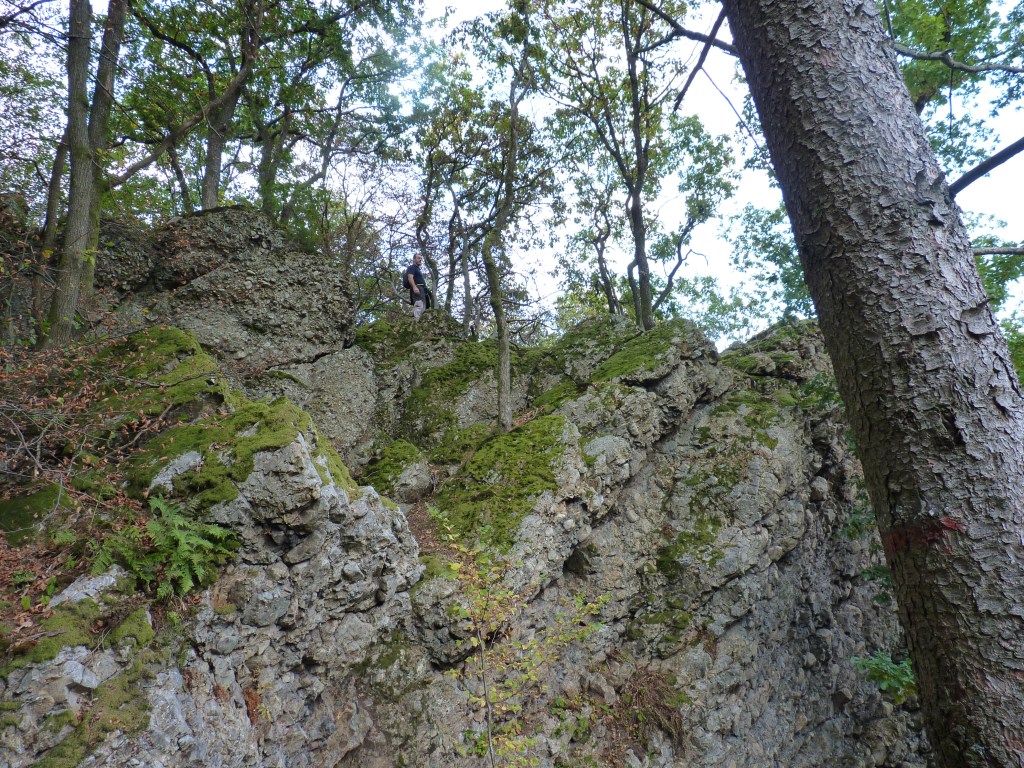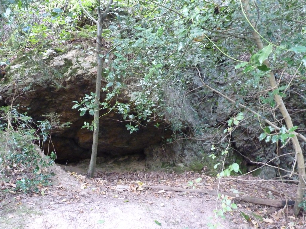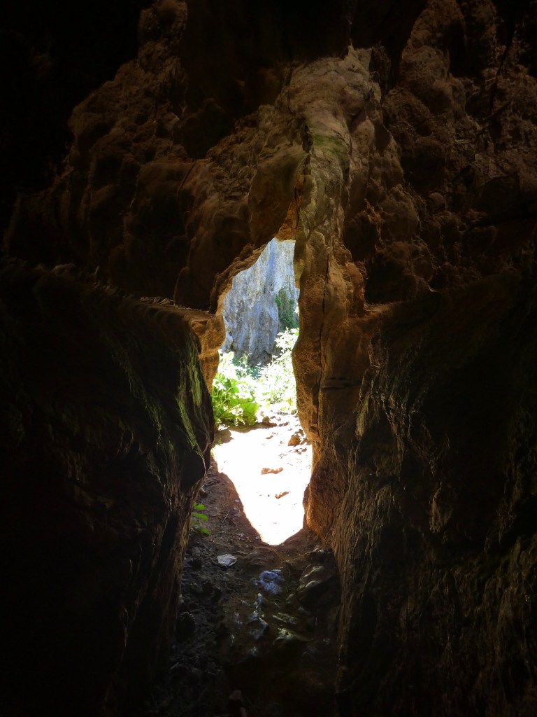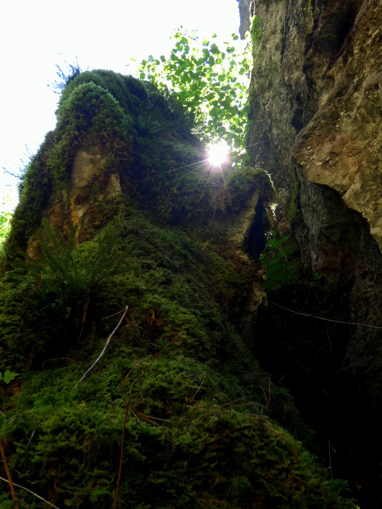 Na nog wat klim- en klauterwerk langs de rotswand uitgekomen bij een verdwijngat…hierboven op de rots loopt bij hoge regenval een klein riviertje, dat letterlijk verdwijnt in dat verdwijngat, om zich vervolgens een weg te zoeken door het binnenste van de rotsen en weer uit te komen in de Ourthe, daar in de diepte. Een speciaal idee…