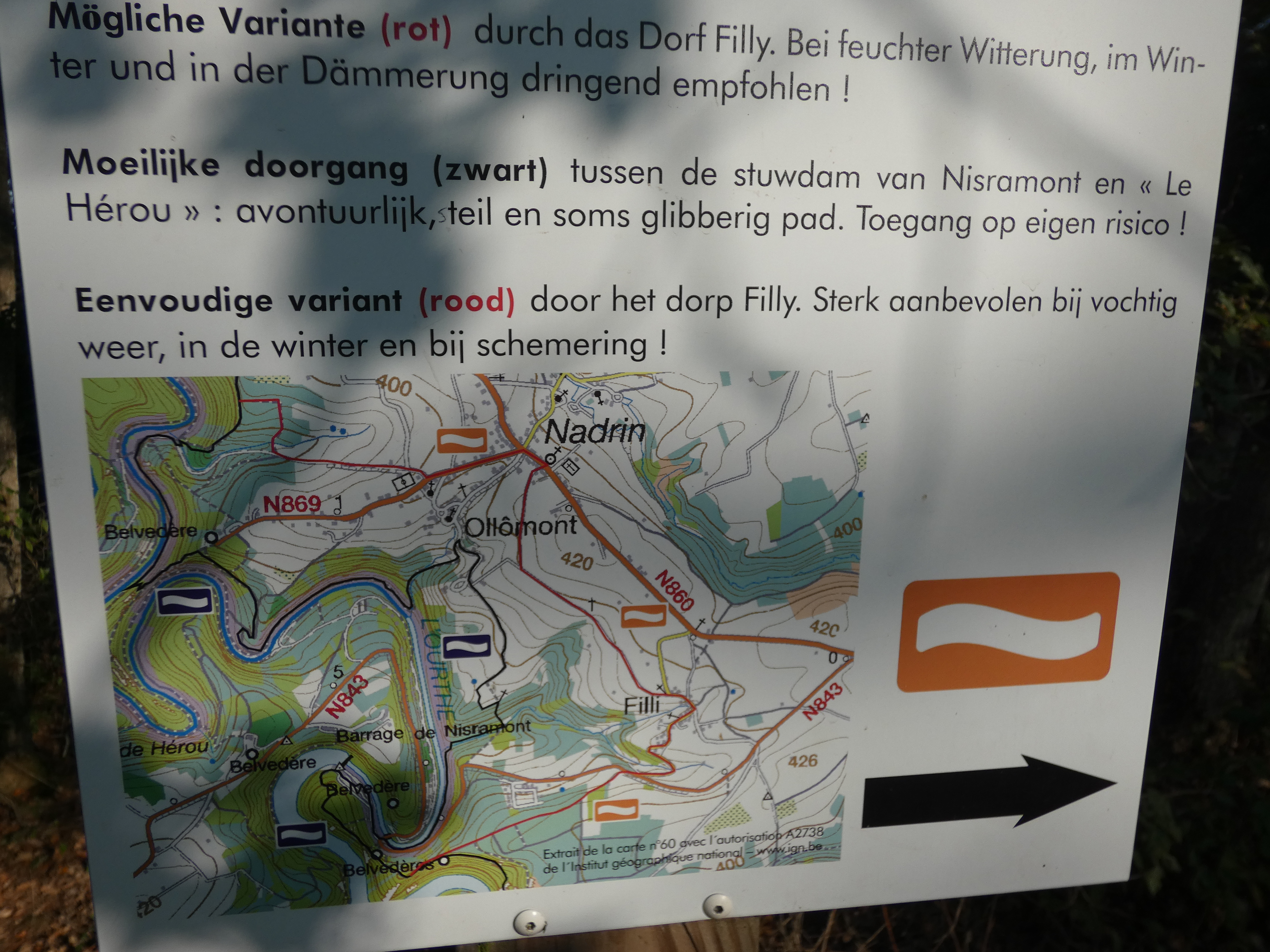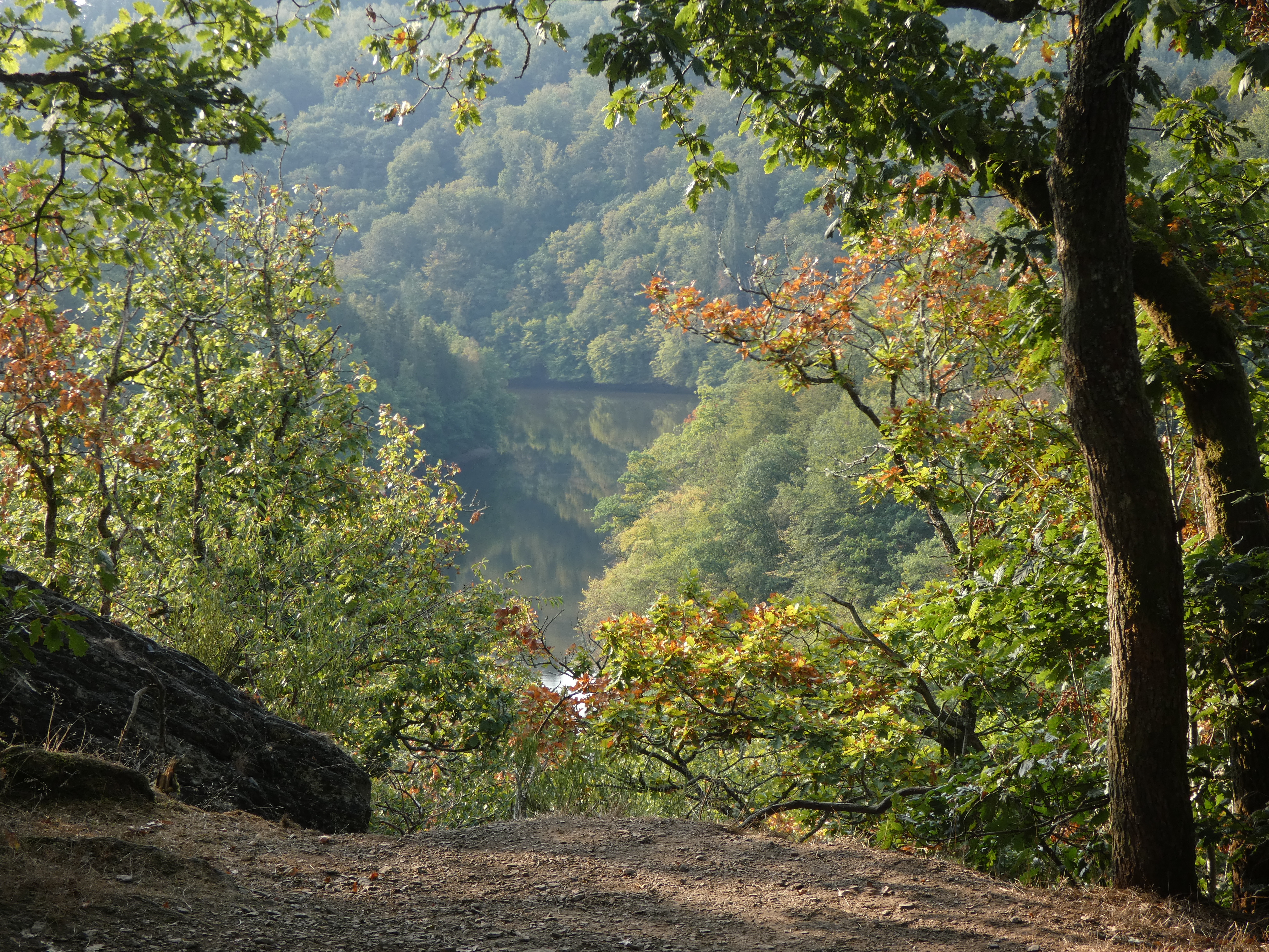 Nog maar eens even wat natuurfoto’s spammen…. Ik was aan de Barrage de Nisramont, een stuwdam van 1958. Niet meer heel bijdetijds, de stuwdam is leuk om te zien, verder ook niet spectaculair maar de omgeving is out of this world….een lieflijk stuwmeertje temidden van steile hellingen met bomen. Zeker met een lekker zonnetje een superplek om te zijn… Er is een wandeling van 13 kilometer rondom het meer en in de omgeving, le promenade des deux ourthes. De ourthe splitst zich een stuk na het stuwmeer in twee ourthes, vandaar de naam… De hele wandeling is in puur natuur, heel speciaal om 4 uur te kunnen wandelen zonder iets van mensen te zien in dit kleine landje. Halverwege ben ik overgestapt in een andere wandellus om vandaaruit een zwarte wandelroute te kunnen opppikken van zeven kilometer. Niets zo mooi als een route die alles vraagt. Weg zonder weg. Slippery when wet, maar nu was het gelukkig mooi droog met dat weer. Een kind in de speeltuin … En daarna terug naar de barrage. Letterlijk nine to five….van ’s morgens 9 uur tot ’s middags 5….8 uur over 23 kilometer. Niets dan genieten….