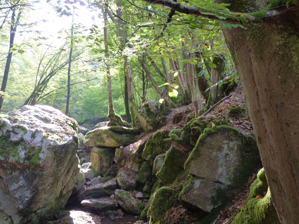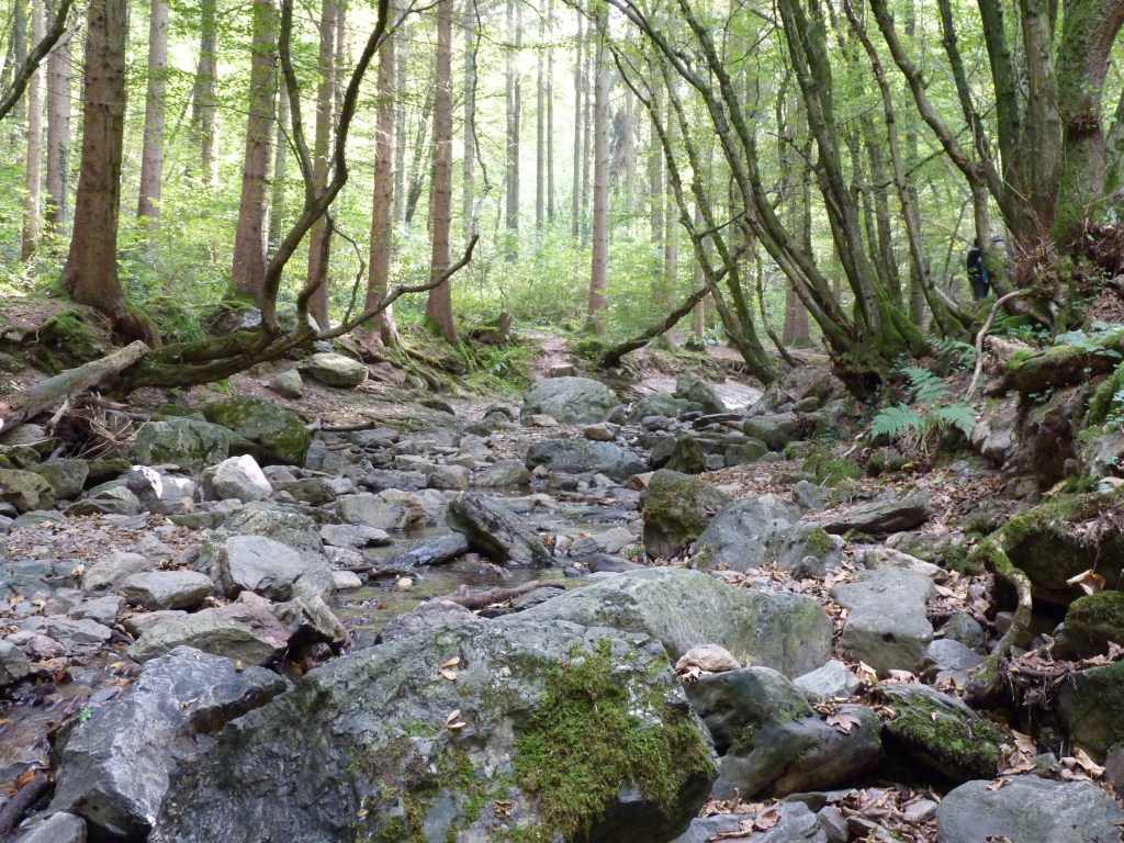 Niet ver van Remouchamps ligt de vallei van de Ninglinspo…een klein riviertje dat zich een weg baant door een heel oude, wilde vallei, ruw, maar toch ook romantisch zacht…Zowel de bedding van het riviertje als de beboste hellingen liggen bezaaid met rotsblokken, alsof reuzen een spelletje stenensmijten gedaan hebben…reuzen….tja, het geheel doet heel fantasierijk aan, al vanaf het begin krijg je het idee alsof je een enchanted forest binnengaat… En verder naar boven, via het uitkijkpunt van Drouet, waar je getrakteerd wordt op de mooiste vergezichten, tot op 315 meter hoogte, de rotsen van Calhay, de overblijfselen van de eerste zeekust. Daar ben je vanzelf even stil…het vreemde idee dat daar ooit de zee was, nu zover van daar verwijderd….. Enkele indrukken van een stevige wandeling….2,5 kilometer op 3 uur….