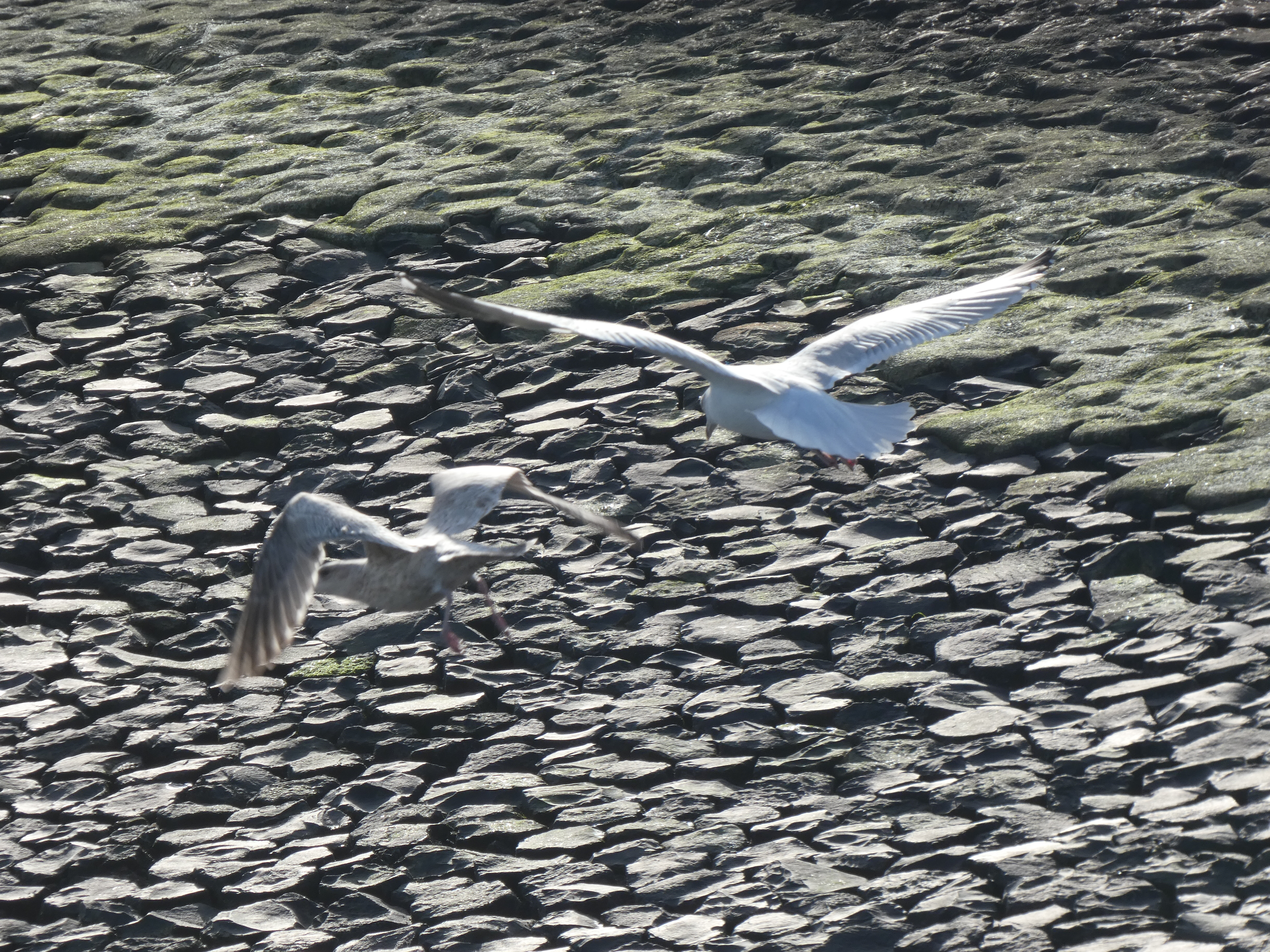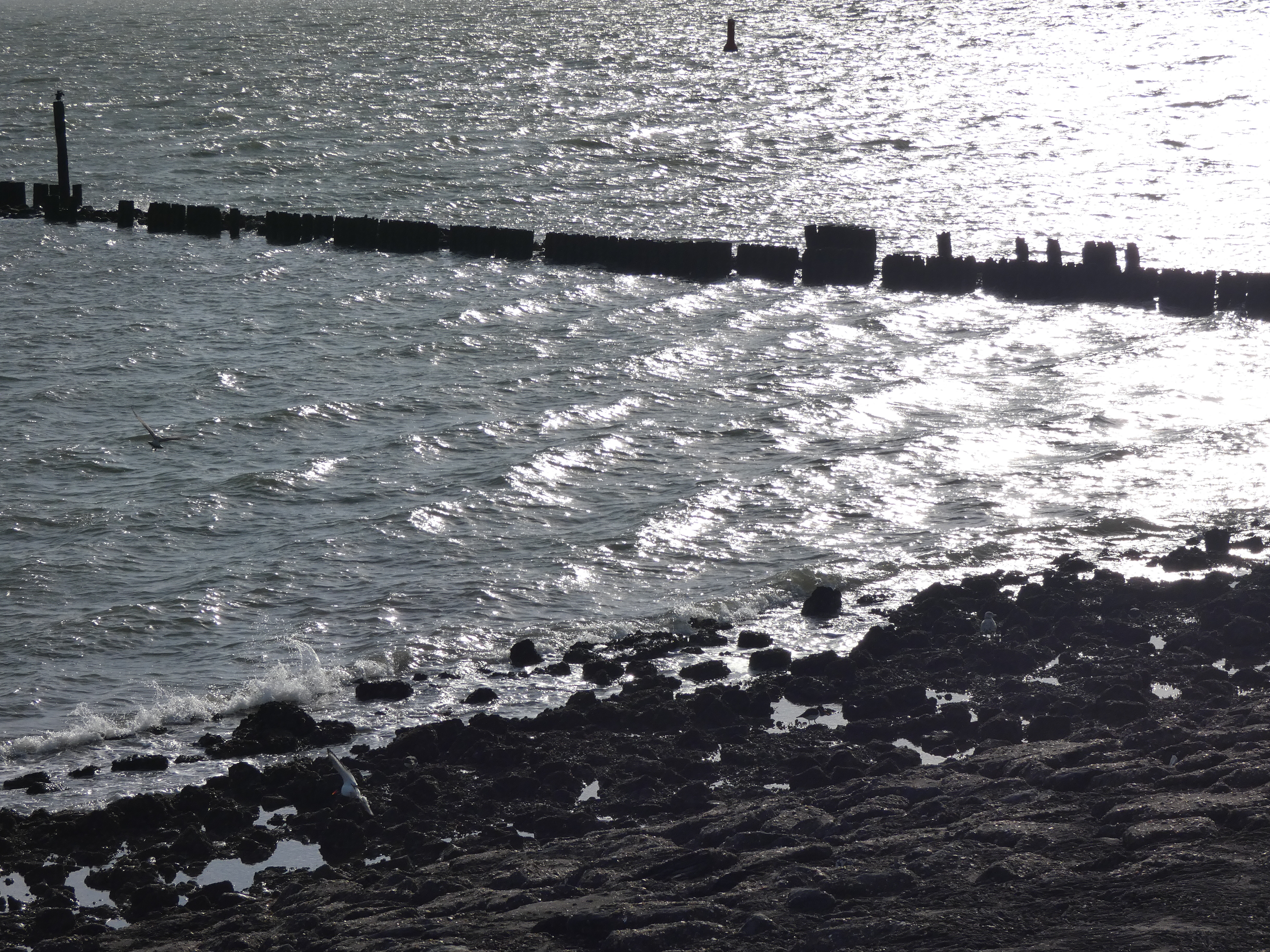 Het is ondertussen bijna volledig eb en het afnemende water legt vanalles bloot. Niets is beter voor het leven van alles wat met water te maken heeft. De staketsels en golfbrekers steken boven het water uit, mosselen en allerlei lekkers aan hun basis. Meeuwen en alle andere watervogels zoeken hun gading in de overvloed en zorgen voor een heel schouwspel, overal waar je kijkt…