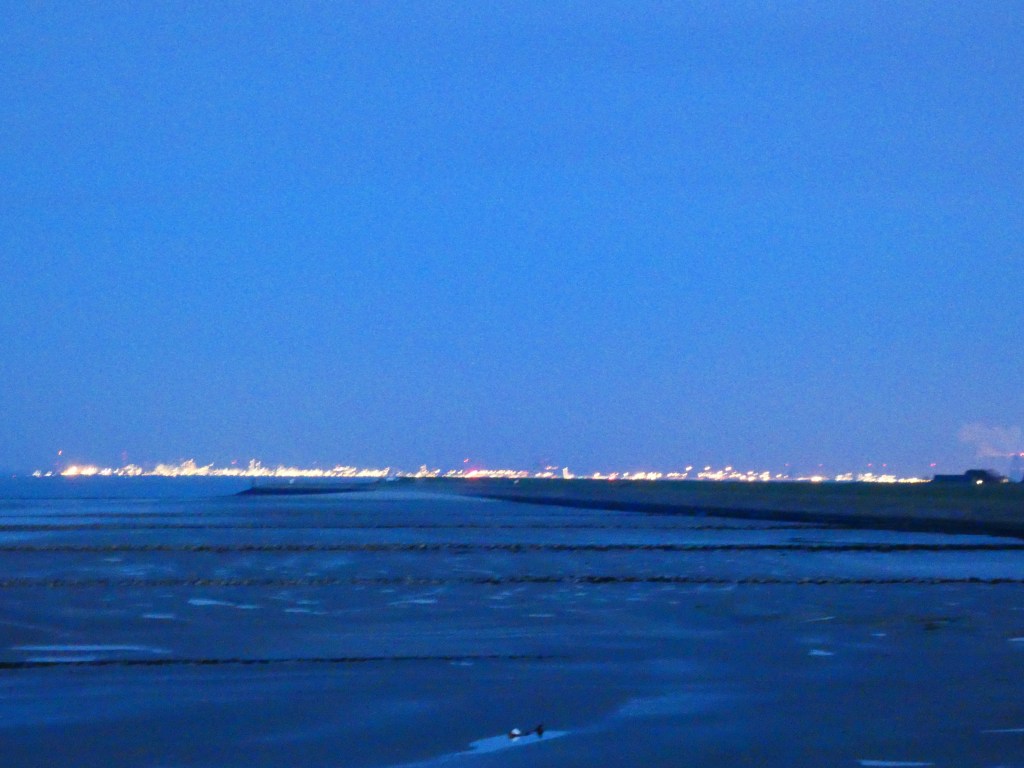 Ik ben op veel plekken iets te lang blijven hangen en kom te laat aan bij de radartoren van Ossenisse. Deze toren heeft trappen rondom en je kan daar omhoog om een geweldig beeld te krijgen van de omgeving. Maar de zon is al onder gegaan en de schemering en de wind zeggen dat mijn hoogtevrees dat nu niet leuk vindt, dus ik zal weer terug moeten komen op een beter moment om daarboven proberen te geraken…Desalniettemin is het uitzicht altijd weergaloos en met de flonkerende lichtjes va de Antwerpse haven in de verte, wordt je gevoel alleen maar nietiger…