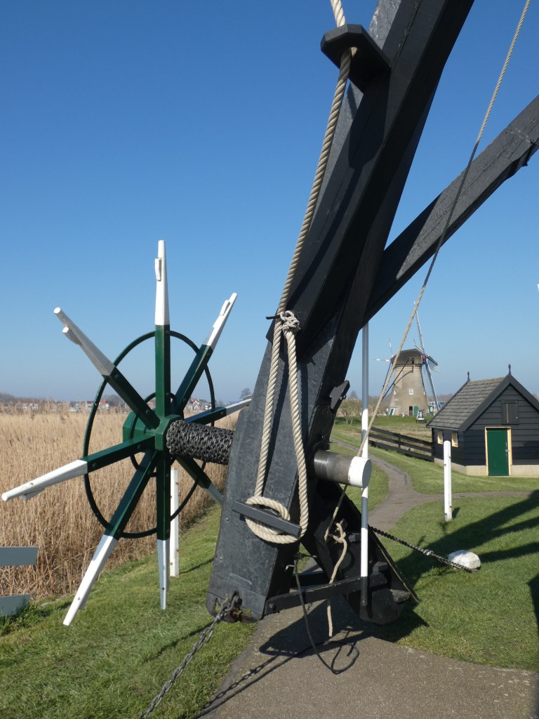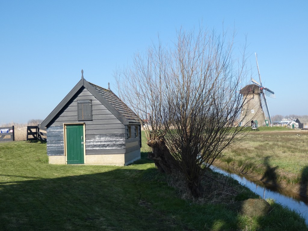 Via een oude stuk van een oude molenwiek loop je over een watertje een natuurpad op, waarlangs je naar de tweede museummolen kan. Deze tweede moelen is een wipmolen, totaal anders gebouwd, met een beneden- en een bovenhuis. Hier kun je uit veiligheidsoverwegingen niet bovenin, maar ze hebben wel gezorgd dat ze het meeste draait van de twee. Je hebt er een prachtig zicht op het achterliggende polderland, de lage boezem, met een hele serie aan slootjes tussen de landerijen…Er is een tuin bij met leuke oude dingen en er ligt een schip, waar je op kan. Het plaatje is compleet…