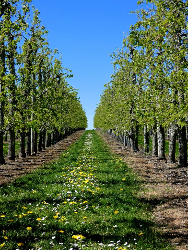 Grotendeels kersen, peren en appels, in diverse variaties en soorten. En het mooie is, ze bloeien bijna tegelijk Eerst de kersen, dan de peren, dan de appels, maar dat loopt zich niet ver uiteen (als de temperatuur wat meewerkt). Dit is allemaal in april en nog wat van mei. Het is pasen en de tweede helft van april breekt aan. Het is prachtig weer en de bloesemmeter op internet geeft aan dat zo goed als alles in bloei staat, dus…de hoogste tijd om te gaan.