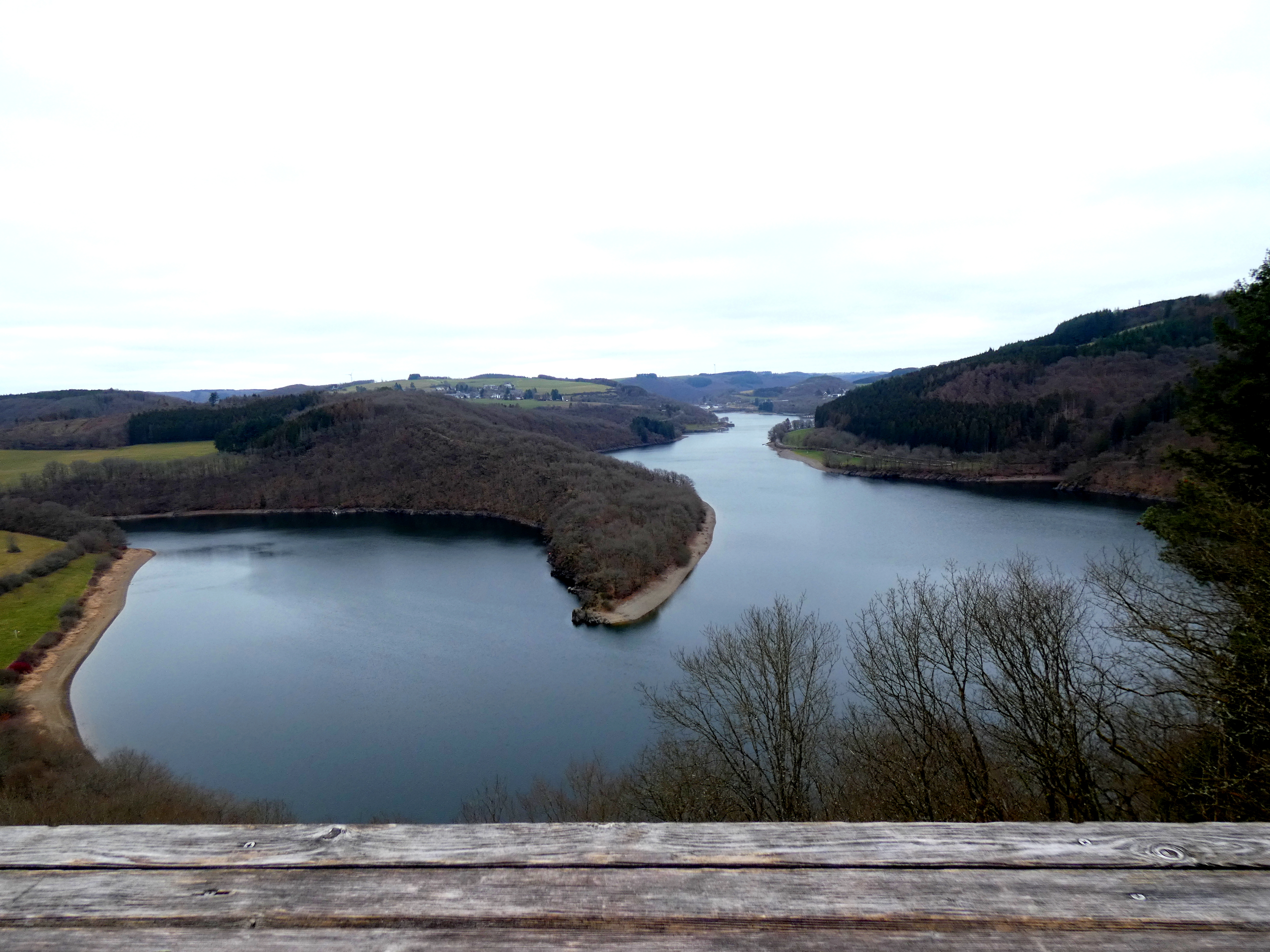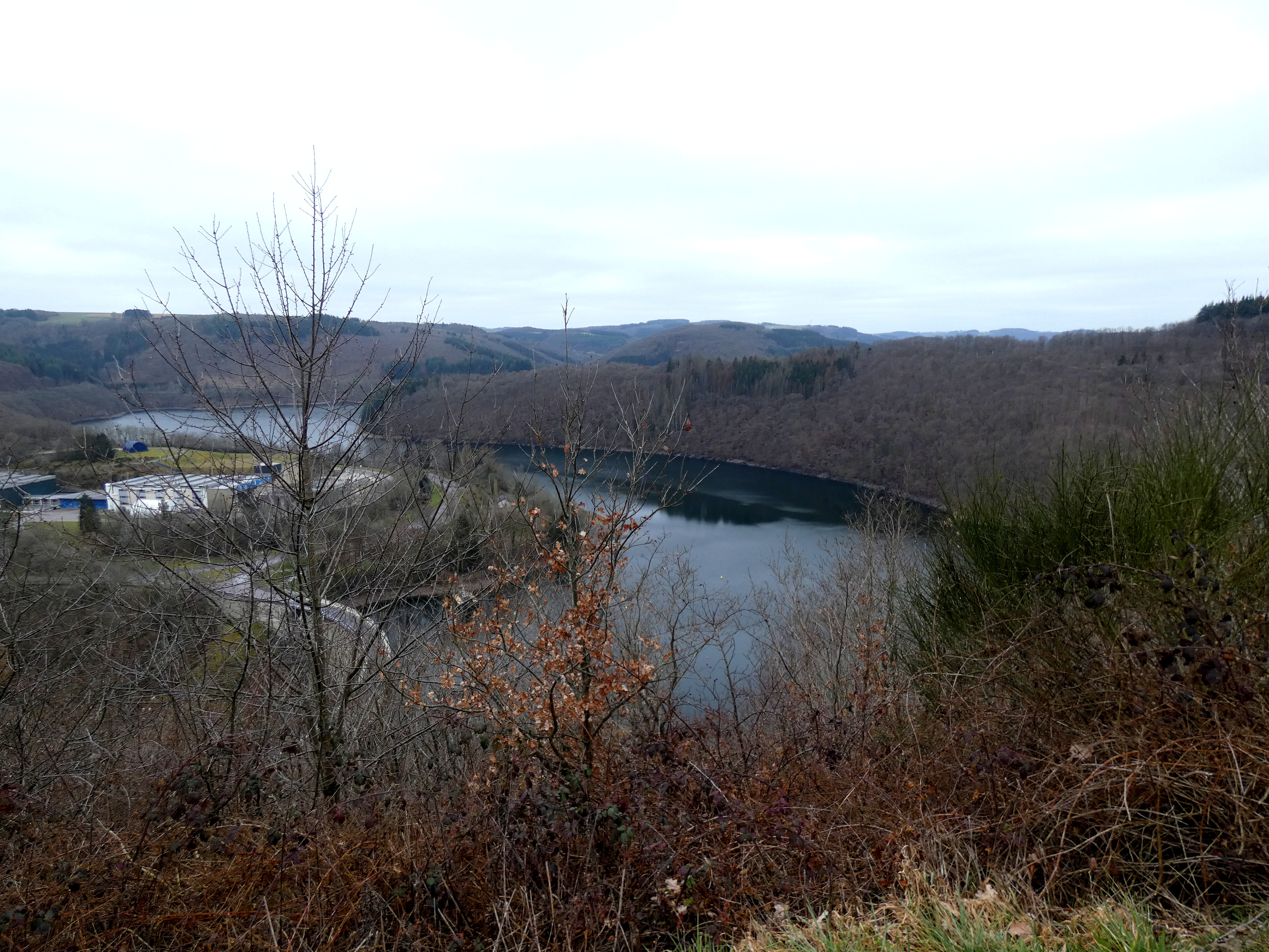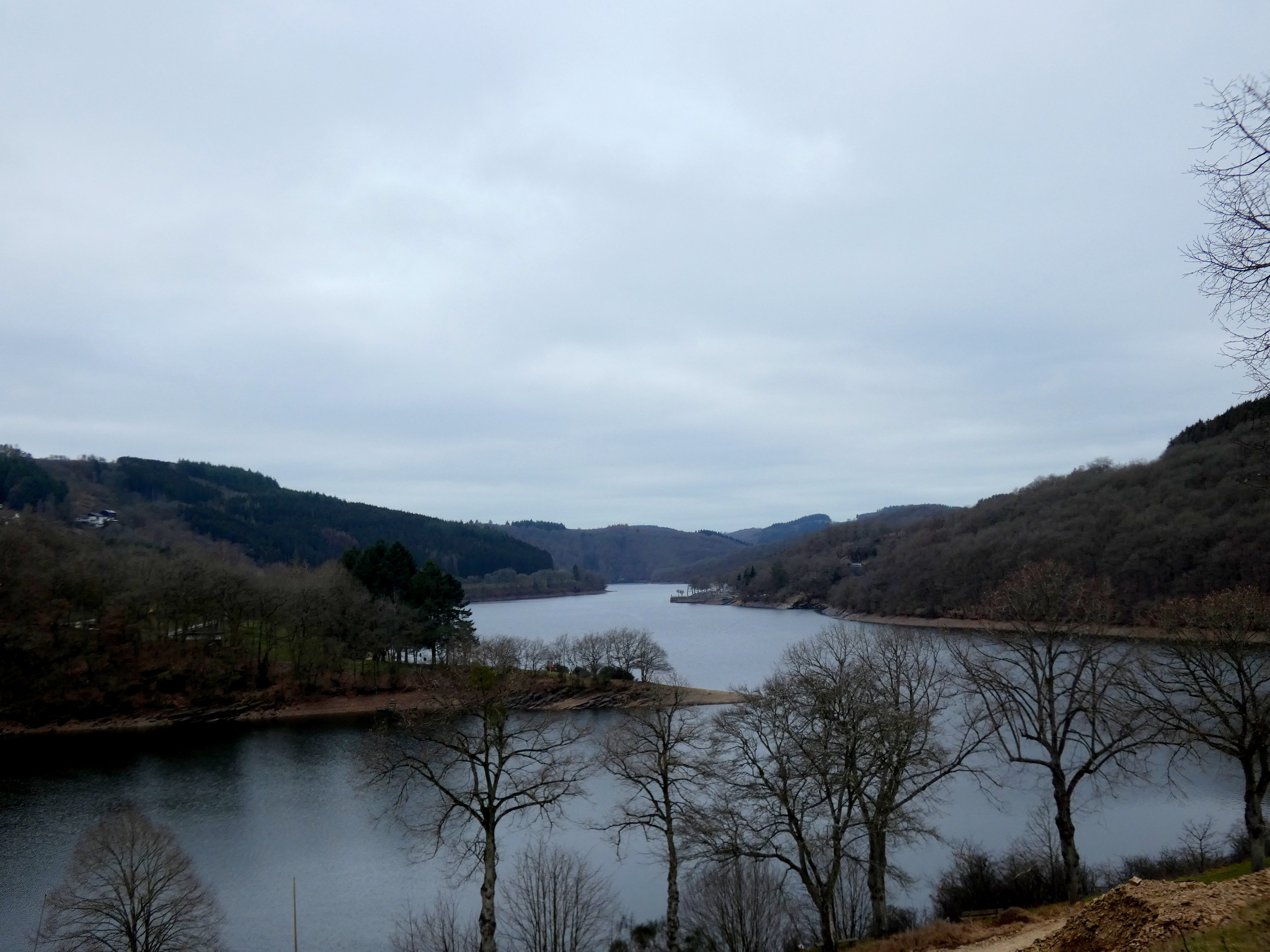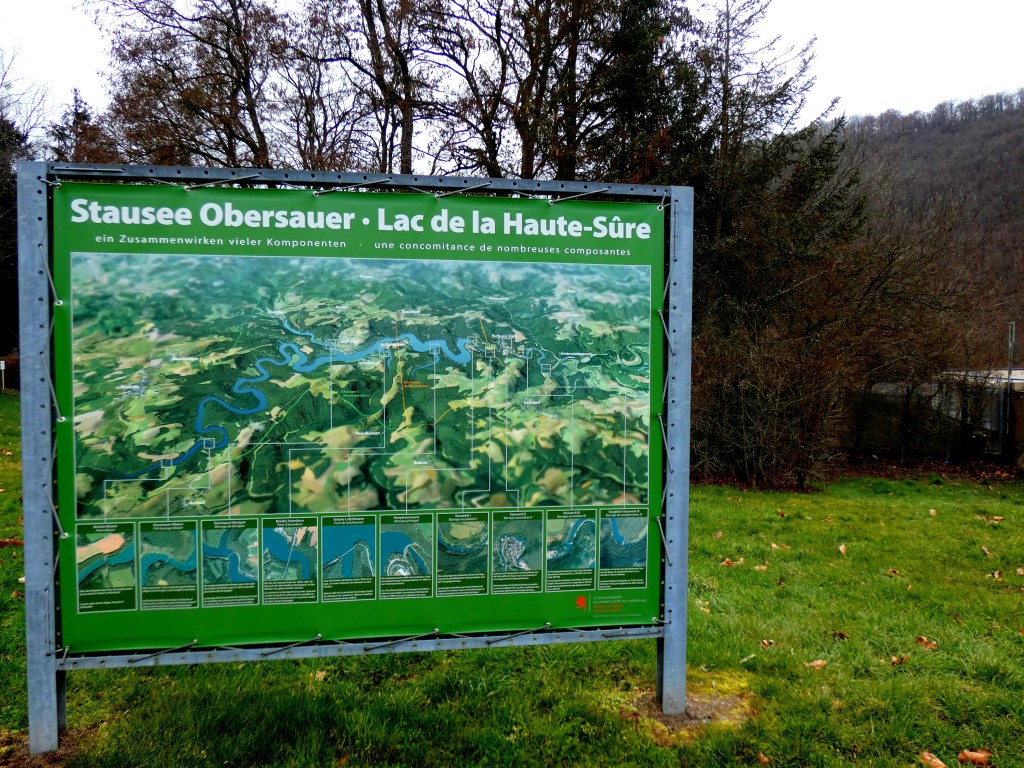 Een goeie tweehonderd kilometer en zo’n tweĆ«eneenhalf uur verder, bereik ik mijn doel, Lac de la Haute-SĆ»re. Een meer dat zich over een oppervlakte van 380 Hectare als een grote slang door de valleien kronkelt. Kunstmatig gevormd rond 1961. Zo’n 59 miljoen kuub water worden in bedwang gehouden door de stuwdam bij Esch-sur-SĆ»re. Logisch, dat deze stuwdam voor elktriciteit zorgt, maar wat haast belangrijker is, is het feit, dat dit meer voor ongeveer 70% van het groothertogdom aan drinkwater voorziet. Het gebied wordt et de grootste zorg omringd. De eerste 5 kilometers vanaf de stuwdam, mogen absoluut niet betreden worden, geen kamperen, zwemmen, varen of wat dan ook. Daarna is varen en zwemmen wel toegestaan, maar kamperen niet. Alles om de waterkwaliteit in puur natuur zo optimaal mogelijk te houden. Dit hele verhaal kan alleen maar mooie plaatjes opleveren. Enige pech is het grijze, vochtige weer, maar de natuur is altijd mooi…