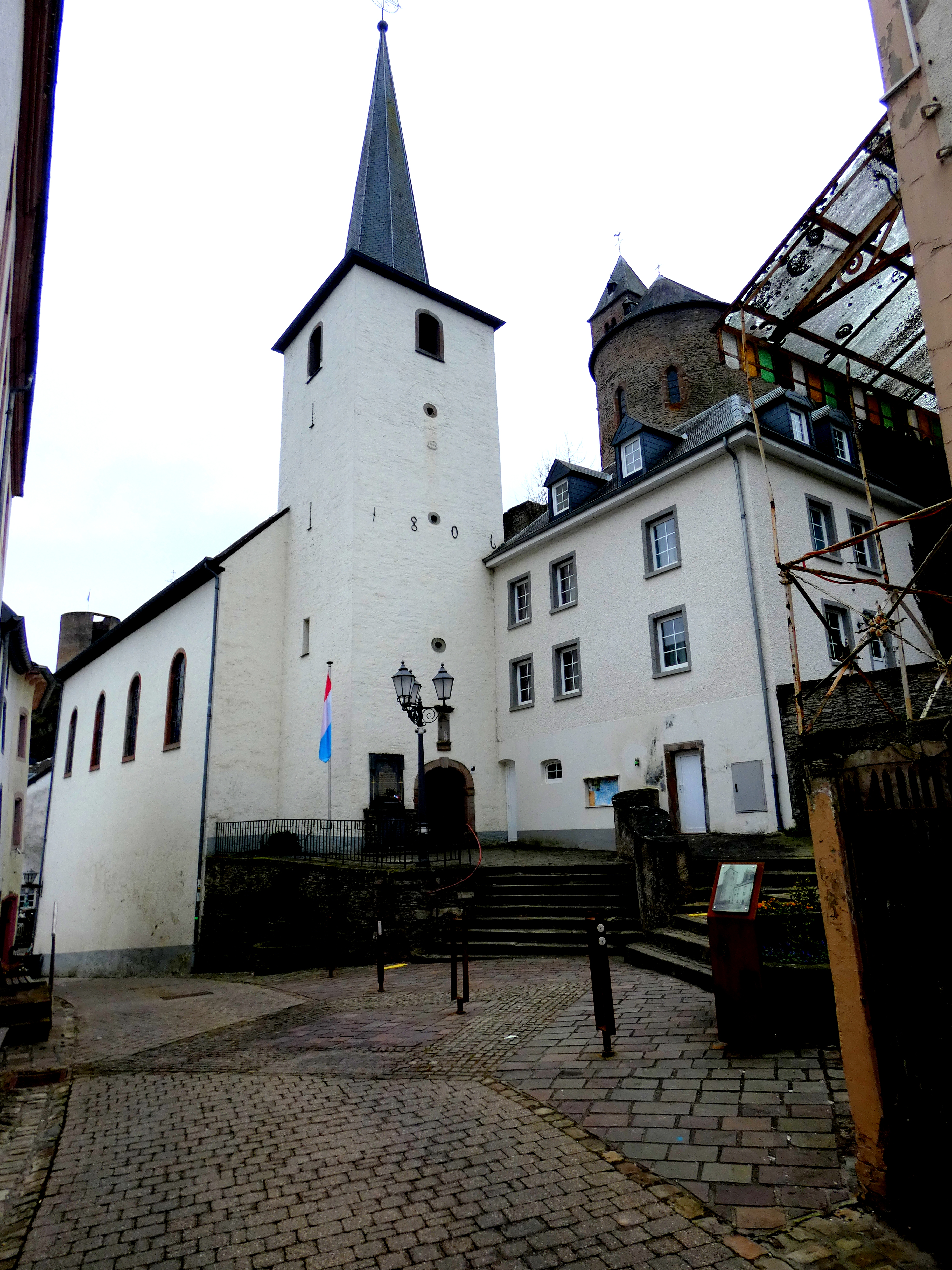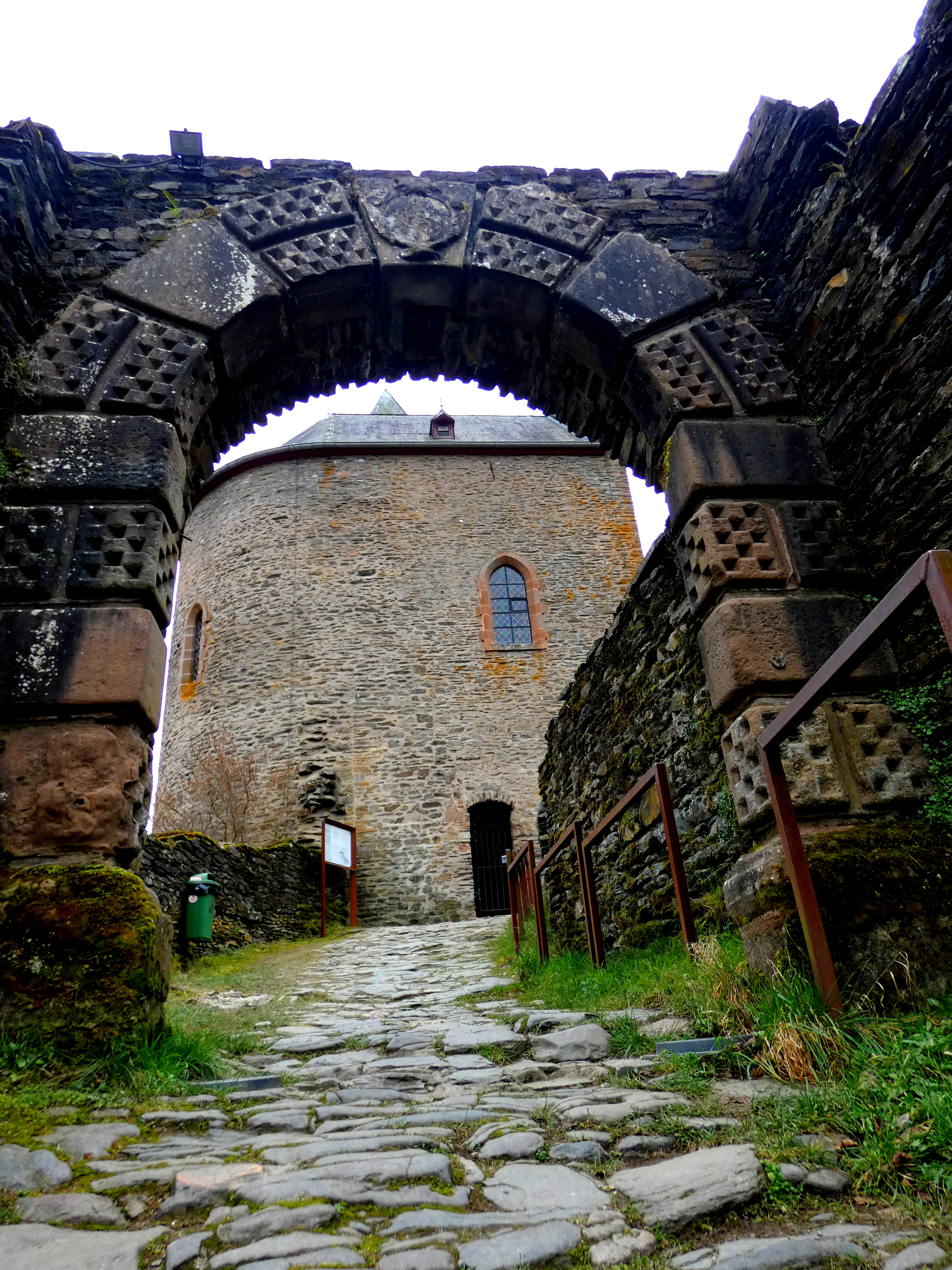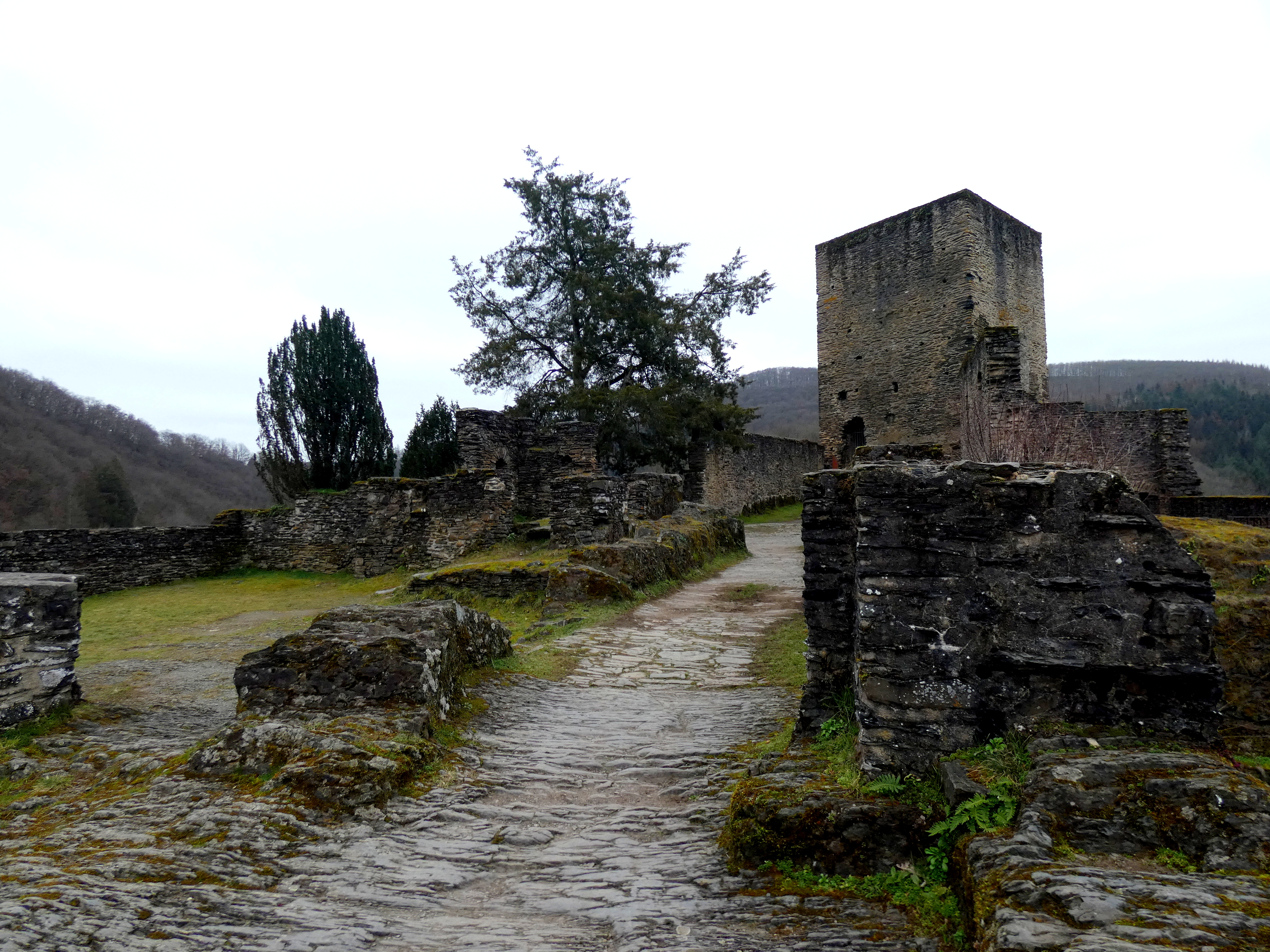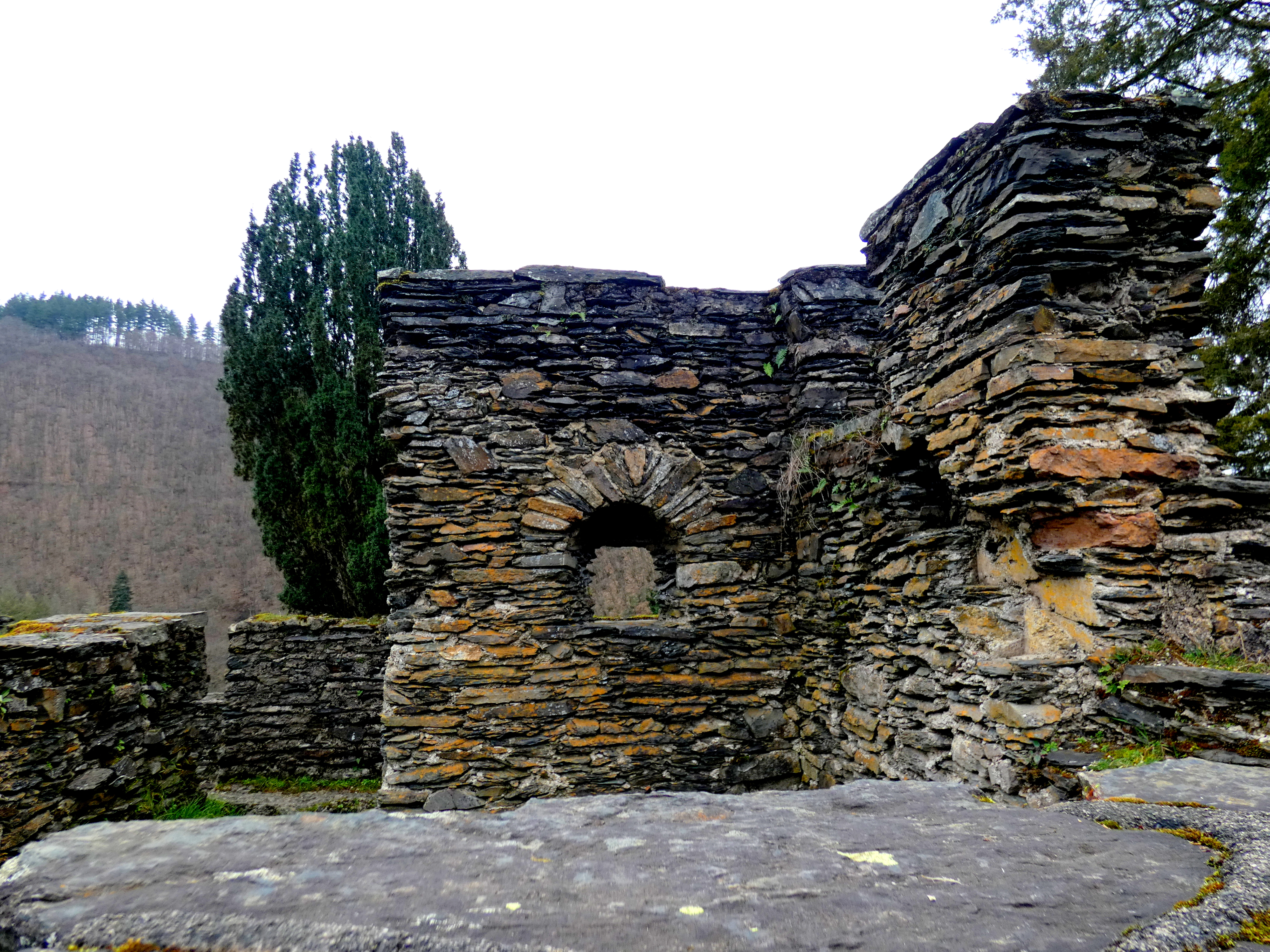 Ik loop over de dam, de weg omhoog en krijg bovenaan het zicht, dat ik verwachtte… Voor me, iets lager gelegen, licht Esch-Sur-SĆ»re. Een klein dorpje, dat in tijd terug gaat tot de middeleeuwen, ligt daar in de vallei genesteld. Met een kasteelberg erbij. The divided castle was een groot kasteel in twee delen, dat daar al gesitueerd is sinds ongeveer de elfde eeuw. Diverse keren van eigenaar(s) gewisseld en veranderd. Nu is het nog een indrukwekkende ruĆÆne-site, met nog een tweetal torens en een kapel.