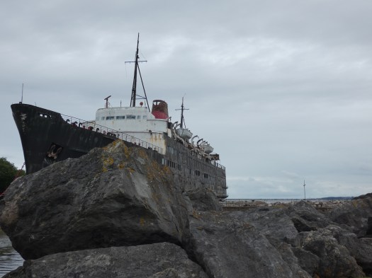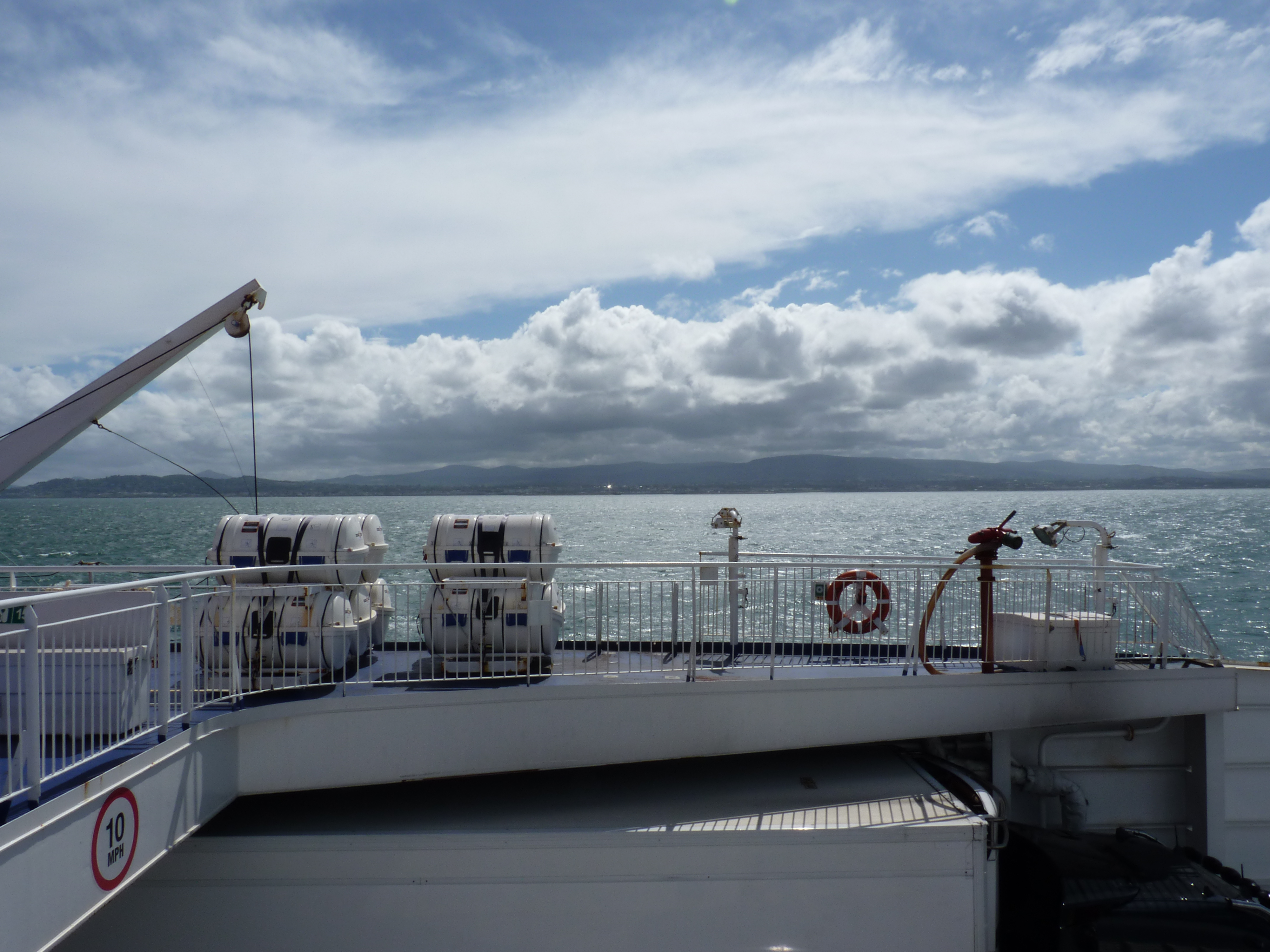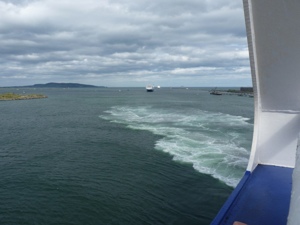 En als de boot de baai uitvaart, kijk ik terug naar de Wicklow Mountains, die het landschap ten zuidwesten van Dublin domineren. Goodbye Dublin, Goodbye Ireland, hopelijk tot snel. het was te kort, maar meer dan de moeite. Nu op naar Holyhead en in het schone Wales een camping zoeken, vooraleer morgen de lange reis naar Dover te maken en naar huis te gaan…. Ik kan nog even extra genieten, want het stormt en er is een ontzettend wilde zee, waardoor het schip heerlijk rolt. Tja, Ik vind dat fijn, dat geeft wat kick, maar veel mensen zijn er niet blij mee, te zien naar al die mensen die zich een weg naar de wc zoeken…Bij minstens 20 auto’s gaan constant de alarmen af, het schip zoekt zich moeizaam een weg door de golven en voor ieder die zich een weg door of over het schip zoekt, is het zaak zich goed vast te houden en berekende stappen te zetten. Toch iets van extra avontuur, altijd grappig…