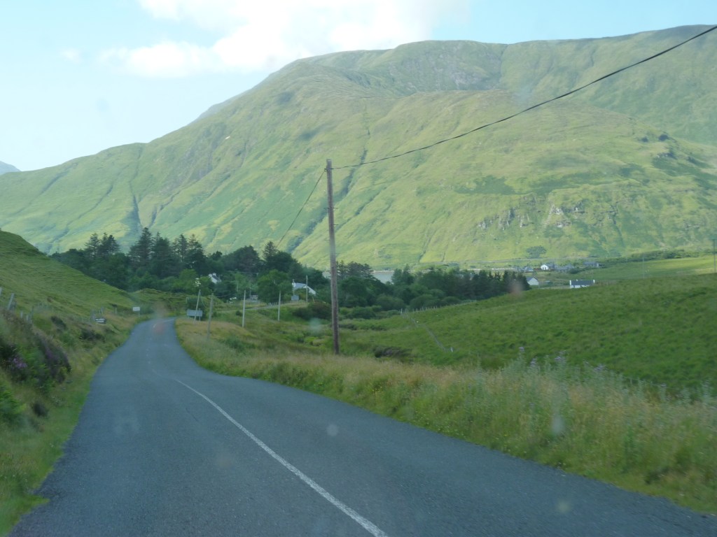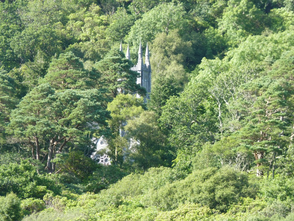 Dan verder naar Clifden. de weg voert langs mooie plekken en uitzichten. Halverwege ligt het groote scoone Kylemore abbey te stralen in de zon. Als je langsrijdt, verandert het zicht constant, van half verscholen in het groen en de bomen, tot een prachtig open zicht…breathtaking…