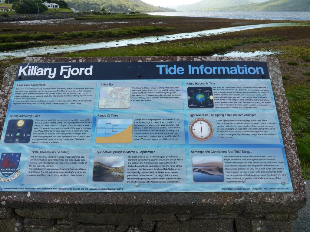 Na een uurtje of twee vervolg ik mijn weg. Ik ben ongeveer op de helft, het gaat voorspoedig. Op naar de volgende mooie plek. Niet direct naar Clifden, maar iets noordelijker, naar Leenane, in het Killary fjord. Een echt fjord, een van de drie die Ierland rijk is. 16 kilometer lang, tussen twee bergen door, met een diepgang van zo’n 45 meter. Vanuit Leenane kun je boottochten maken door het fjord en met wat geluk dolfijnen spotten… A nice place to be, met een mix van natuur, ruige wegen en geschiedenis…