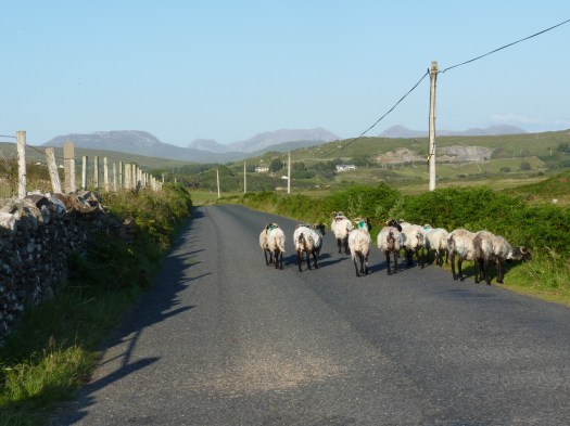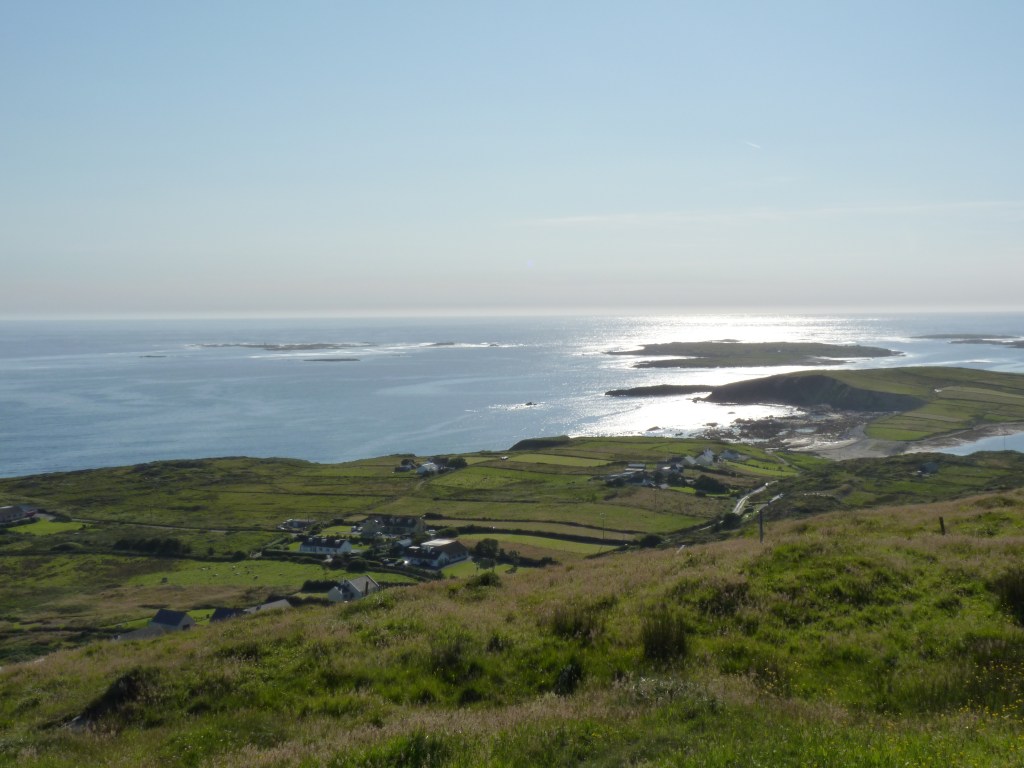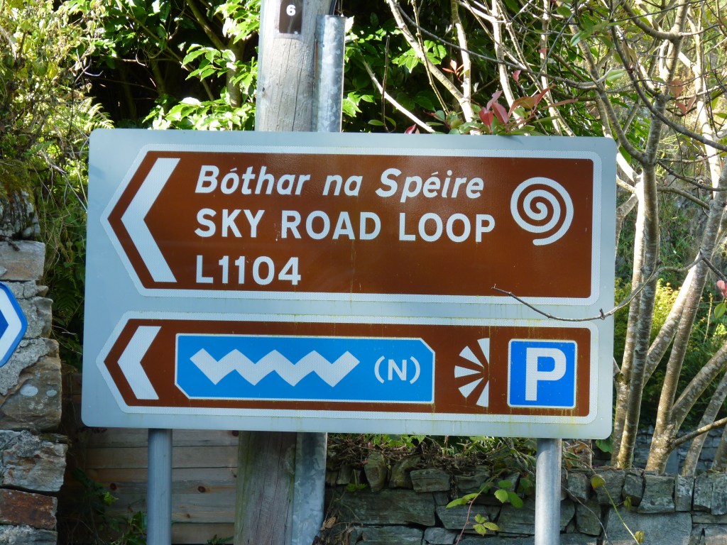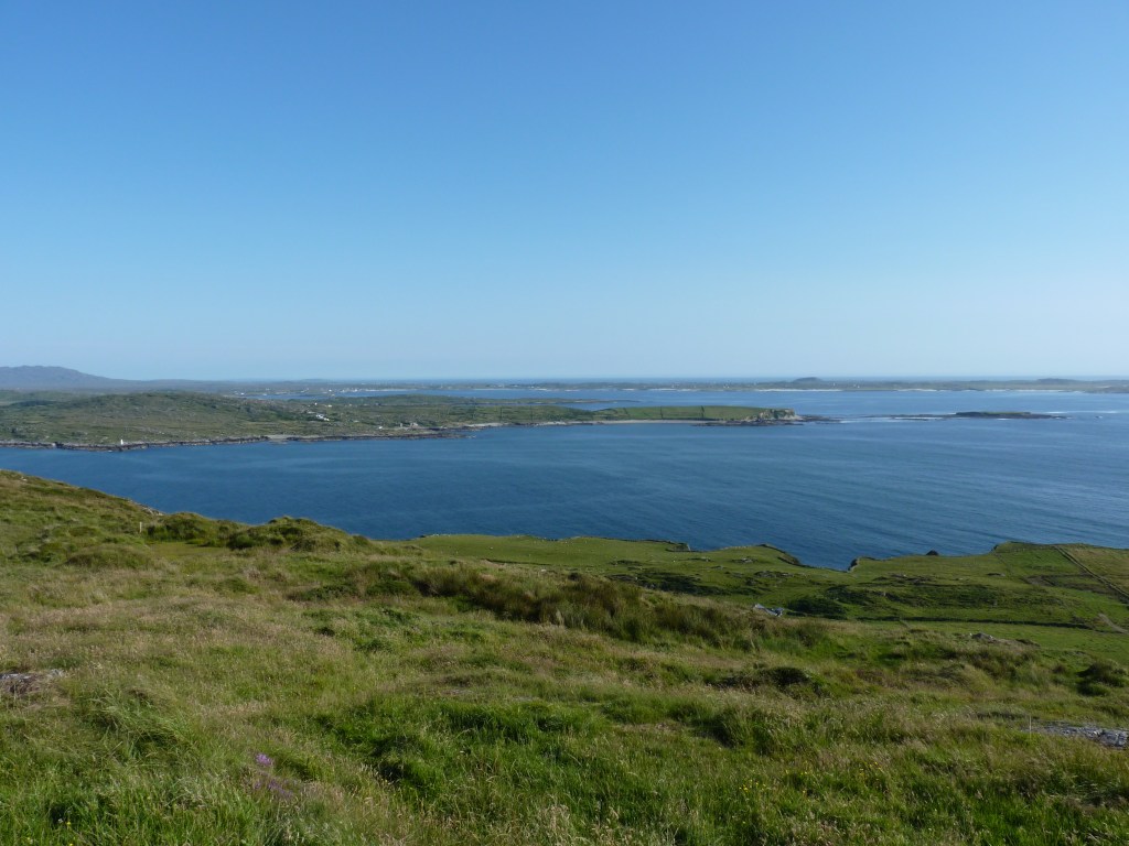 De Wild Atlantic Way is een heel bekende en belangrijke weg die je langs de Atlantische kust van Ierland voert. Ik zie de eerste borden en het maakt me blij. Rijden door de Connemara, een grotendeels veenlandschap, een van de grotere natuurgebieden die Ierland rijk is. Altijd garant voor mooie natuur om je heen. En dan de weg volgen die ik de komende week niet veel ga verlaten…de Wild Atlantic Way… Clifden is een groter dorp. Maar het is niet het dorp waar ik voor kom, maar een speciaal stuk weg, de Sky Road. Deze weg loopt langs de oceaan omhoog en op plaatsen lijkt het alsof je de lucht ingaat, want de horizon is verder leeg, alleen lucht…spectaculair mooi, met vooral bovenaan de mooiste views. De weg is maar anderhalve auto breed en de meeste files worden veroorzaakt door schapen. Ierser kan het niet…