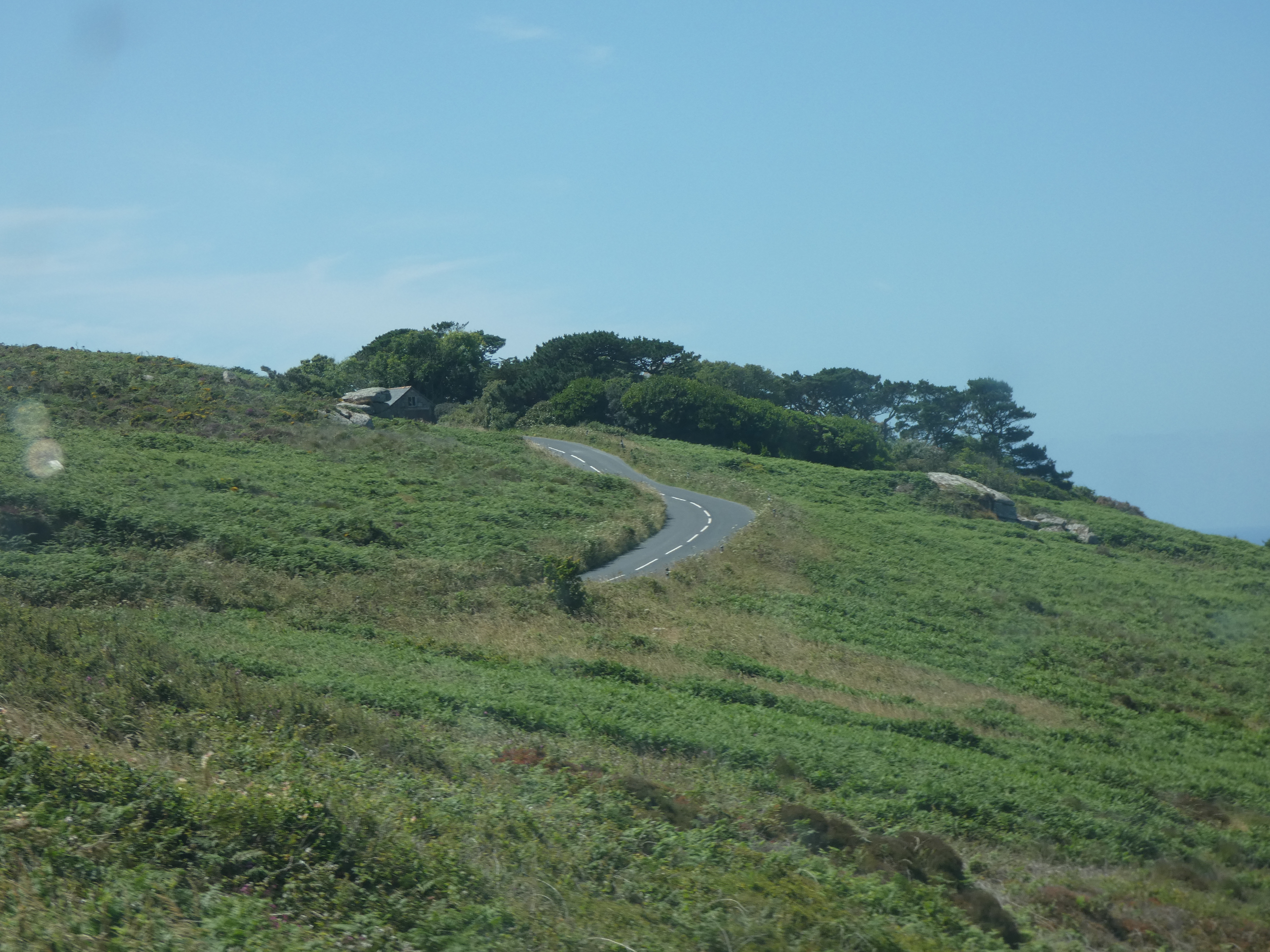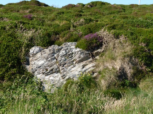 Dinsdag. Een dag waarop ze veertig graden beloven. Ik sukkel op mijn gemak langs de kust. Het wordt al snel heel warm en ik stop bij Pointe du Grouin. Camperplaats langs de weg, met direct uitzicht op zee. Machtig mooie plek om te staan. Een stukje verder is een strandje, een heel stuk lager gelegen en een moezame weg om er te komen, te voet, door rul zand en heel steil en lang. Ik hoop verkoeling te vinden in het water, maar het zand is zelfs te heet om op te lopen. De zon brandt ongenadig en ik werk me zo snel mogelijk terug naar de wagen. Niks te laat. Ik zit niet ver van een zonnesteek. Alles dicht, goed donker en een paar uur op bed doen gelukkig goed. Dat scheelde niks. Teveel zon en warmte zijn niks voor mij, dat blijkt maar weer. Zo gauw de zon onder is, komt de wind opzetten en koelt het snel af. De wereld herademt. Om mij heen komt iedereen naar buiten en zelfs de natuur wordt nog wat wakker. veertig graden is bruut, ik heb het er niks op. Maar die avond toch nog een aangename wandeling kunnen maken naar pointe du Grouin. Dat is beter.