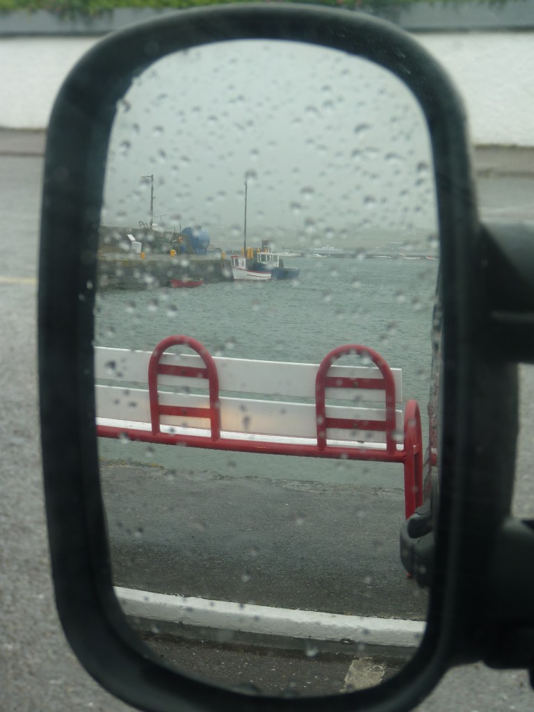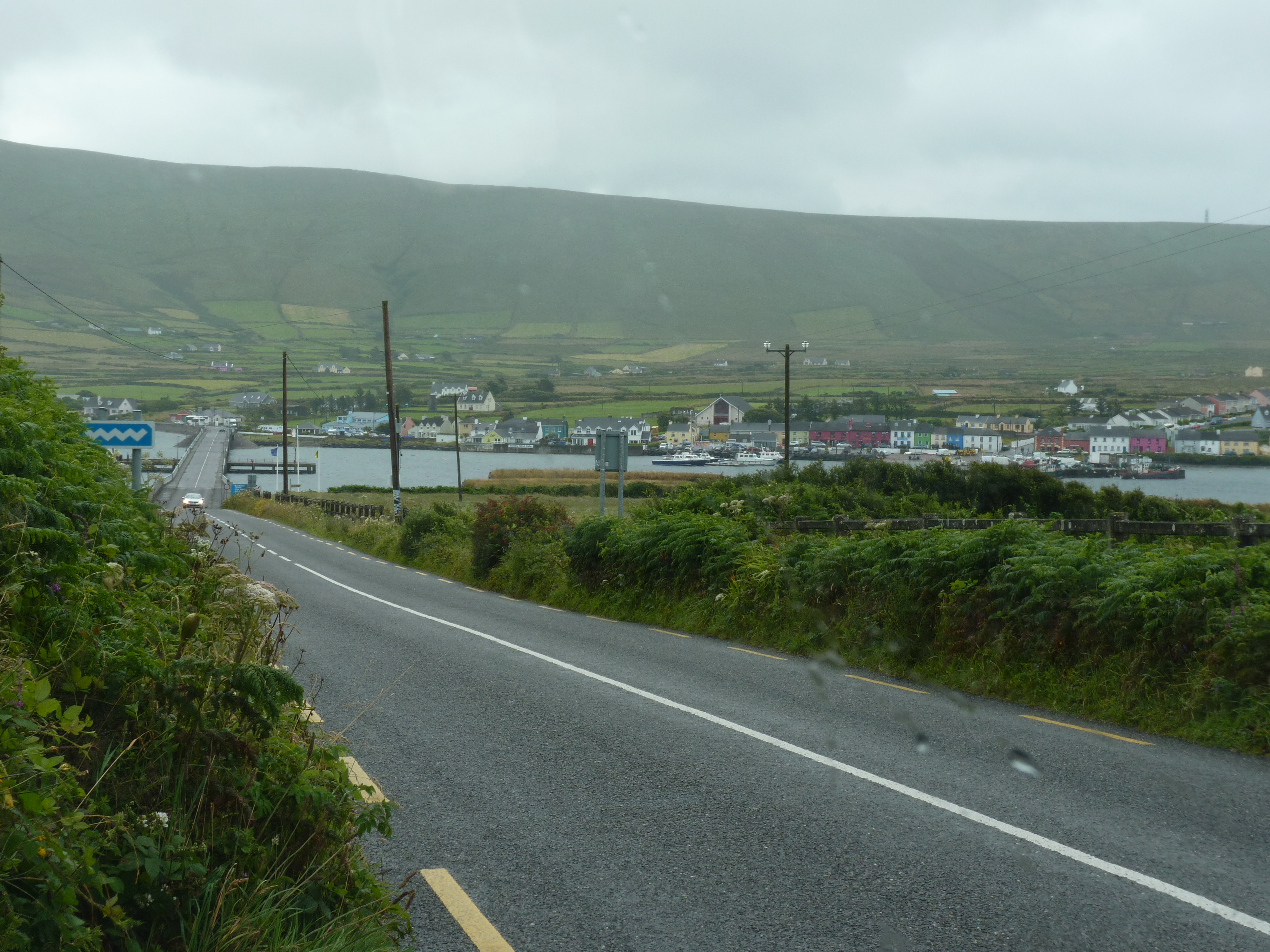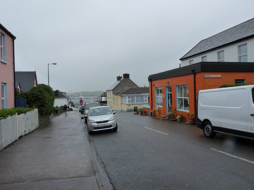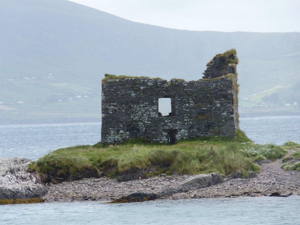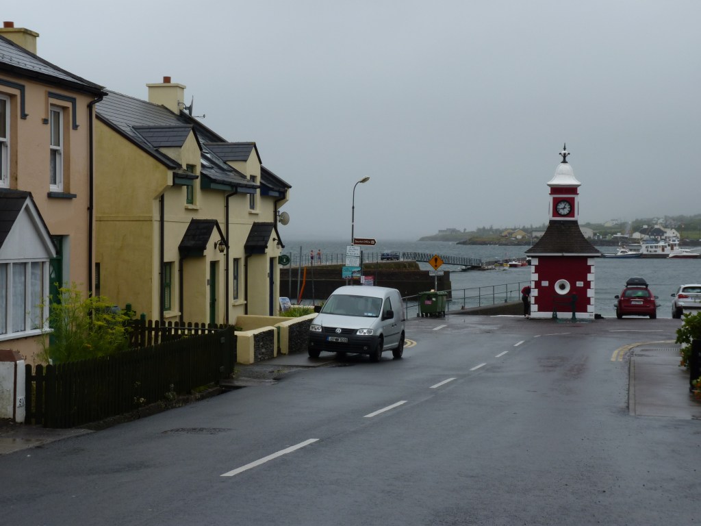 Woensdagochtend…de nacht was weer donker en stil, garant voor een deugddoende nachtrust. Al vroeg op weg. Verder over de ring of Kerry. Ik kan het blijven zeggen, een weg die de kust volgt, met uitzichten om duimen en vingers bij af te likken. geregeld stoppen en foto’s maken, je ogen uitkijken en soms eens in je arm knijpen of je ook echt gezien hebt wat je zag… Als ik voorbij Cahersiveen ben, komt Reenard point in zicht. Hier kun je de veerboot nemen naar Valentia Island….Een echt vakantie eiland. De veerboot komt aan in Knightstown, een ouder plaatsje, dat belangrijk is voor het eiland. Prachtig onderhouden gebouwen. Vorige keer dat ik hier was, was het stralend weer, nu komt er toevallig een fikse bui overzetten. Desalniettemin, een goed gevoel. Als je de film Jaws hebt gezien, en je komt bij Valentia island, krijg je een beetje hetzelfde gevoel als je met de veerboot aankomt. Een echt eiland-vakantiegevoel…
