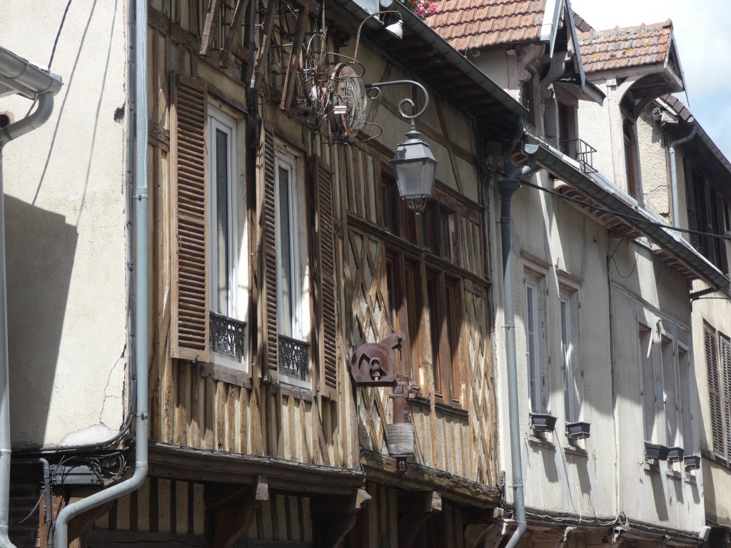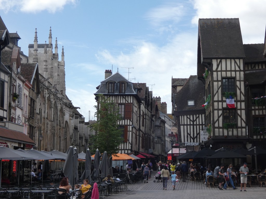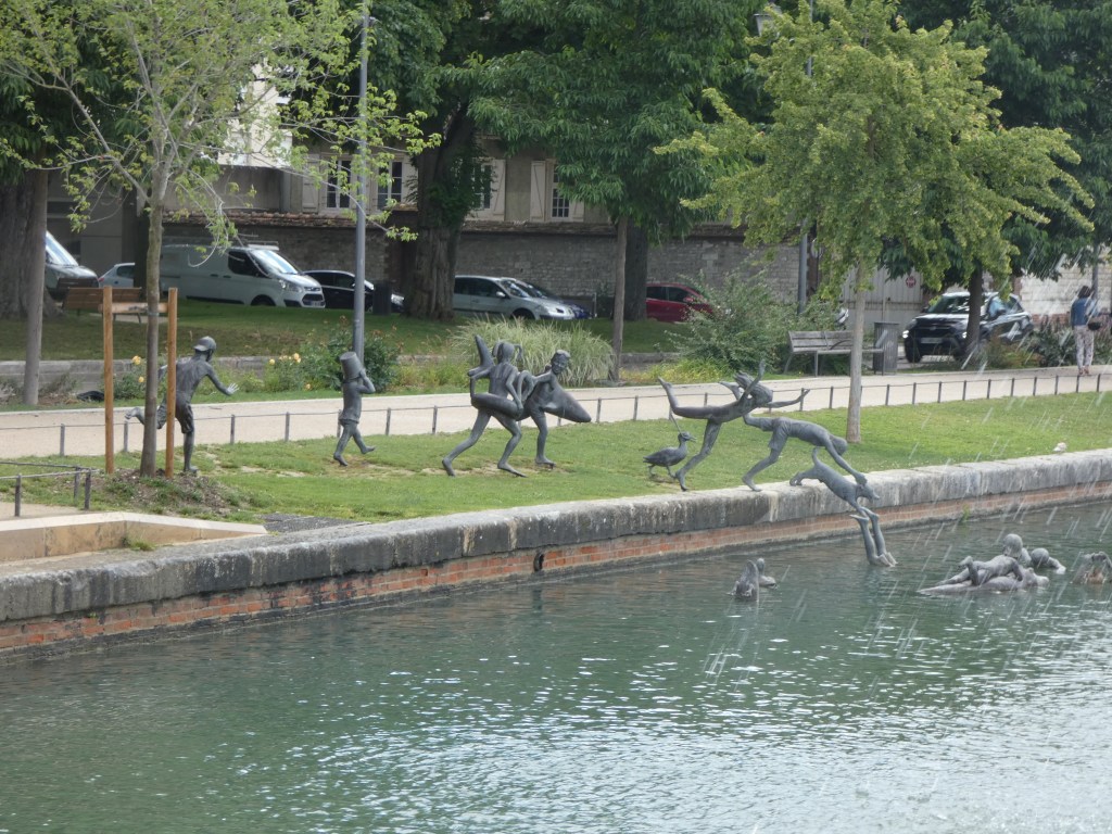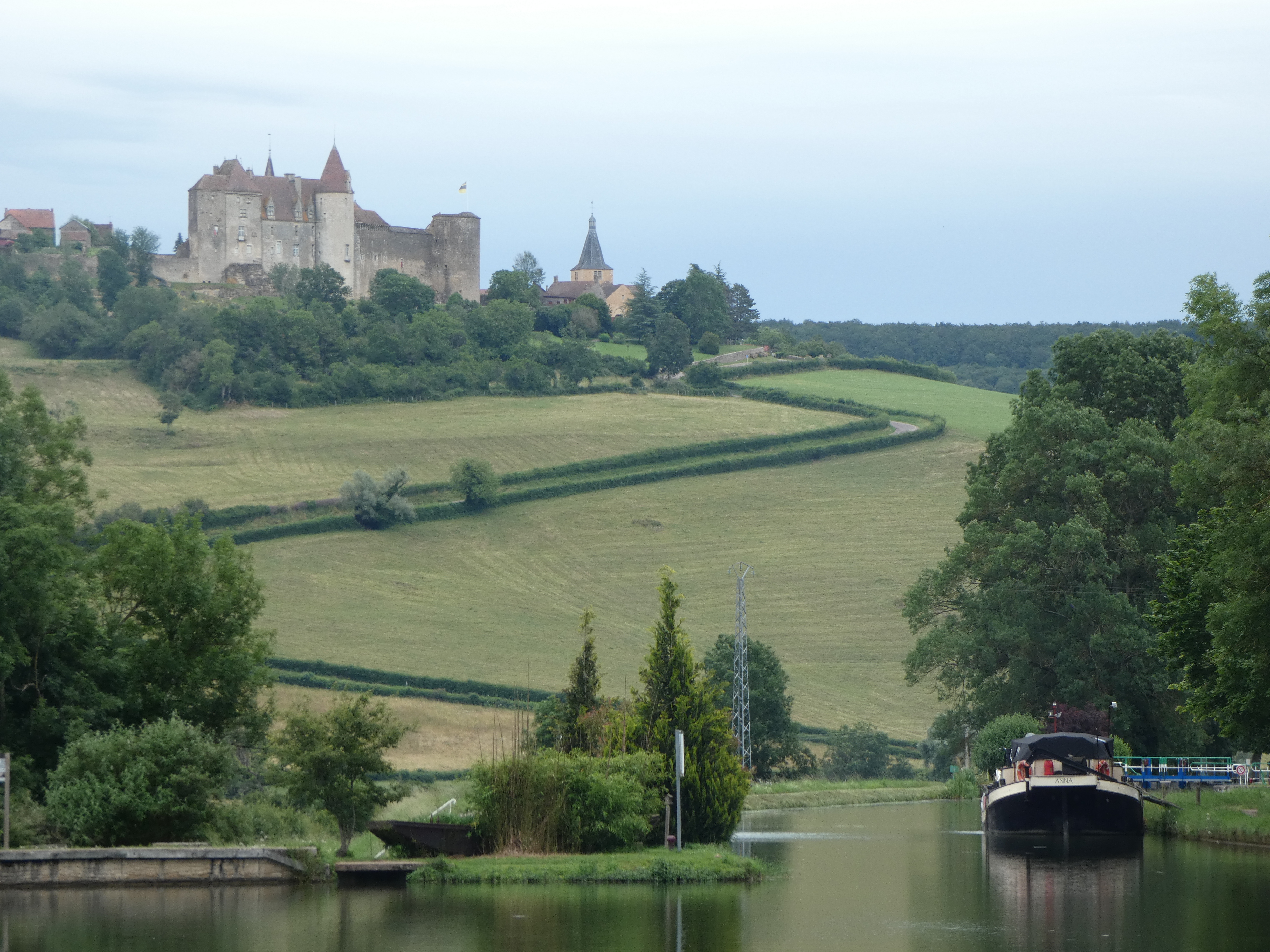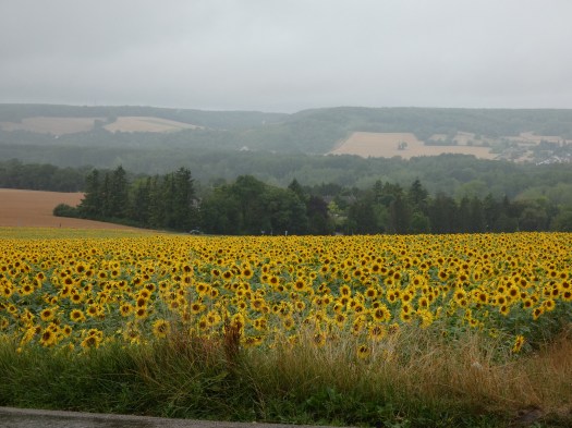 Ik volg de rivier zo close als het kan en meander mee met de stroming om niets te missen. Voor de nacht zet ik me op een parking, bovenaan een helling, met vol zicht op de rustige rivier, waar afentoe een schip voorbijglijdt onder mijn voeten. Rozebottelstruiken en appelboompjes sieren mijn zicht. Aan de andere kant van de weg een enorm veld met zonnebloemen, allemaal met het gezicht naar de zon en als die later die avond achter een heuvel verdwijnt, is het kleurenspel magisch. La douce France op zijn best, een rivier, veel groen, een prachtig uitzicht, een veld met zonnebloemen in een ondergaande zon, wie kan het bijeen bedenken…ik word er heel blij van, in elk geval.