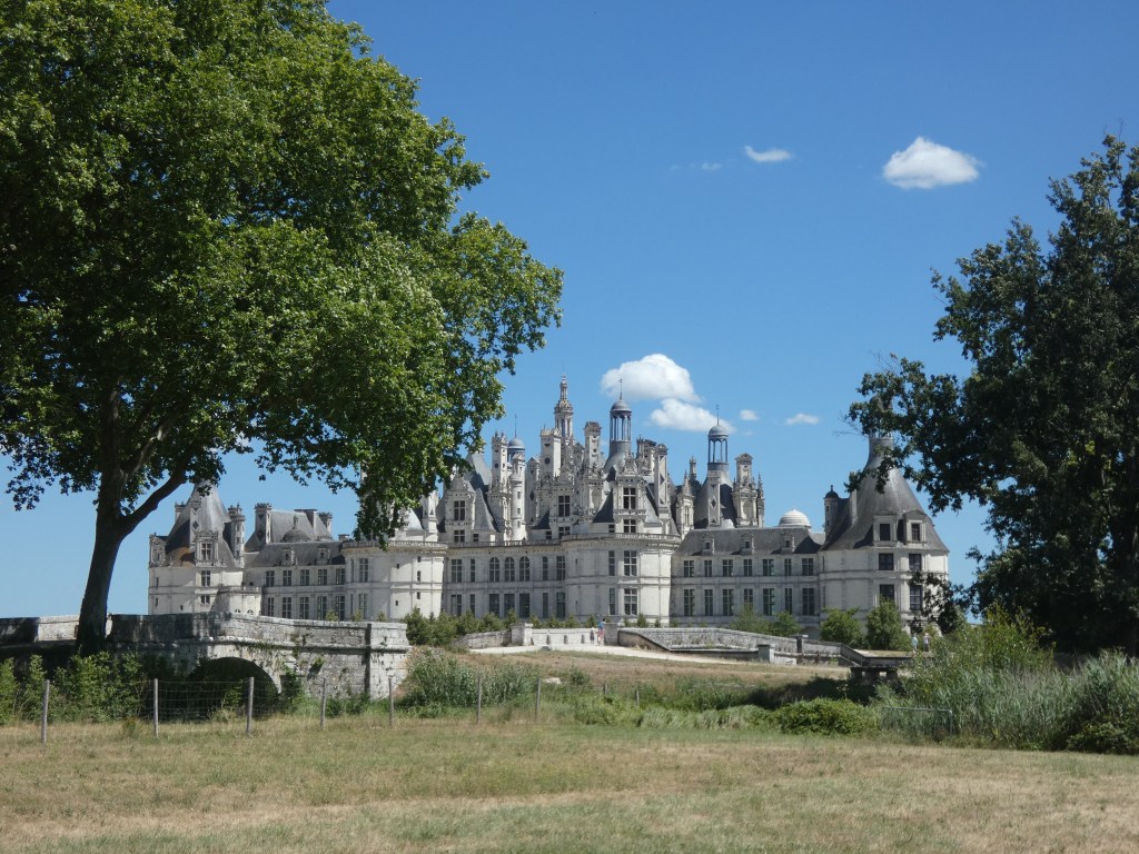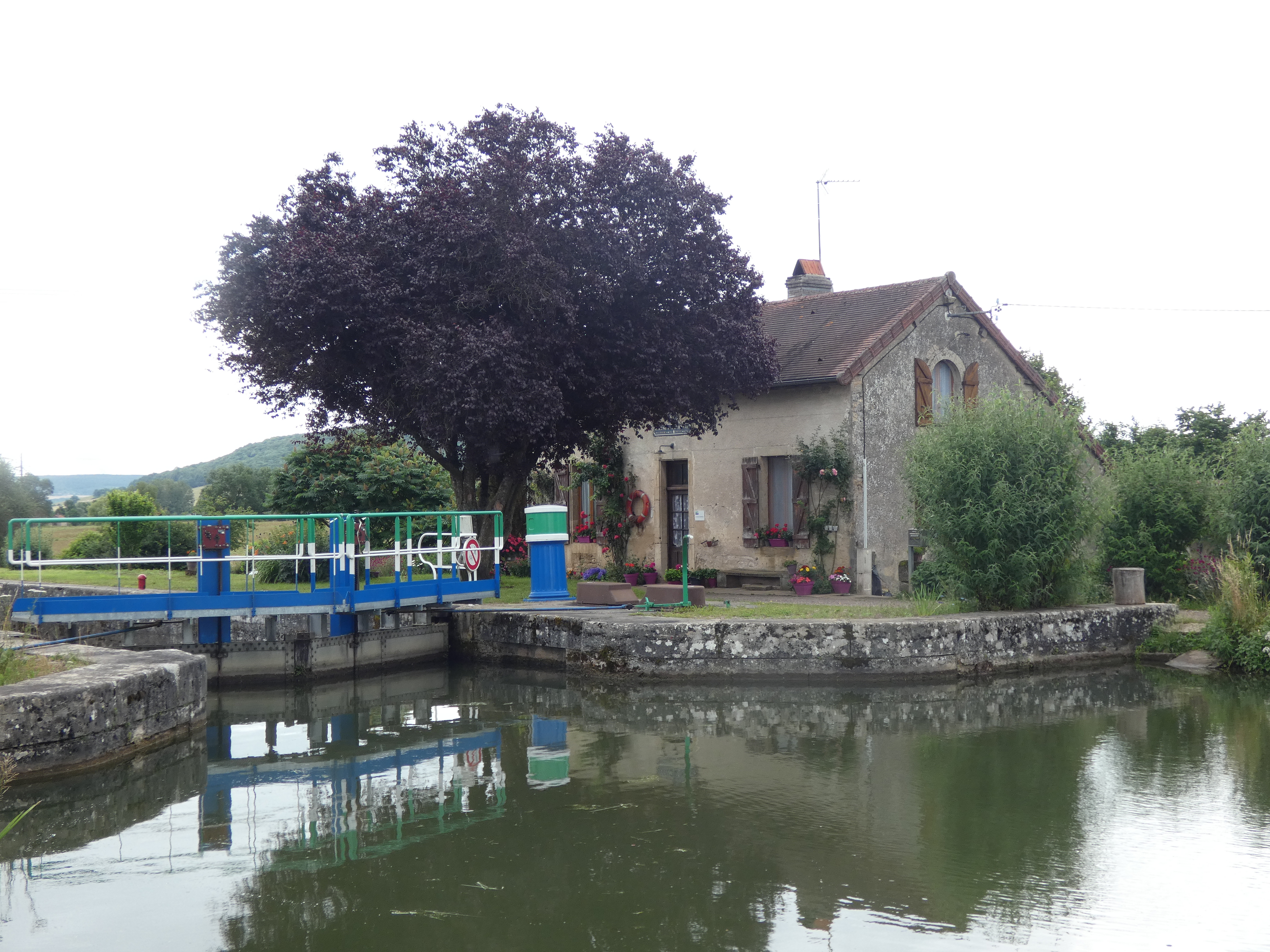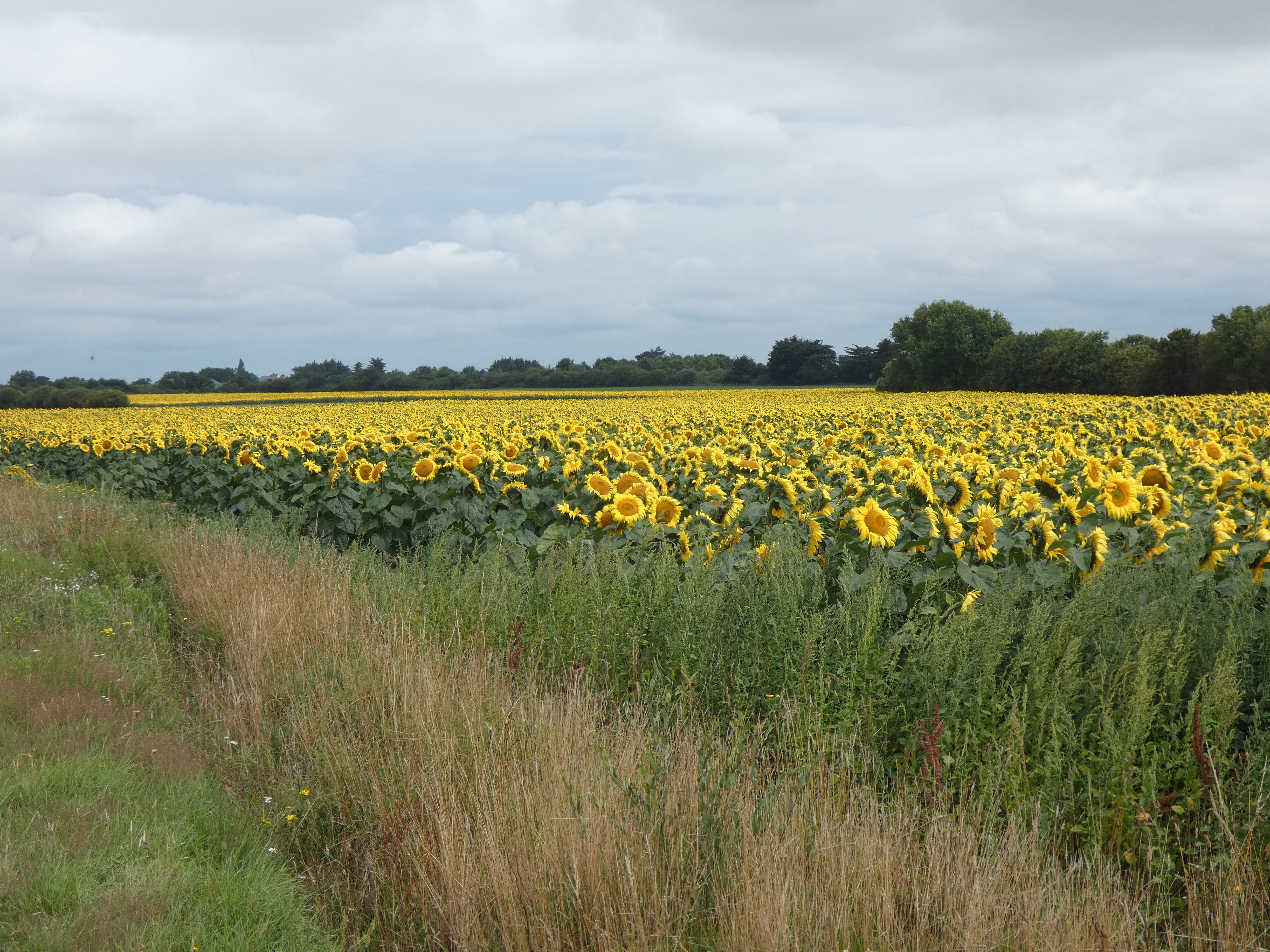 Ik volg de rivier zo close als het kan en meander mee met de stroming om niets te missen. Voor de nacht zet ik me op een parking, bovenaan een helling, met vol zicht op de rustige rivier, waar afentoe een schip voorbijglijdt onder mijn voeten. Rozebottelstruiken en appelboompjes sieren mijn zicht. Aan de andere kant van de weg een enorm veld met zonnebloemen, allemaal met het gezicht naar de zon en als die later die avond achter een heuvel verdwijnt, is het kleurenspel magisch. La douce France op zijn best, een rivier, veel groen, een prachtig uitzicht, een veld met zonnebloemen in een ondergaande zon, wie kan het bijeen bedenken…ik word er heel blij van, in elk geval.