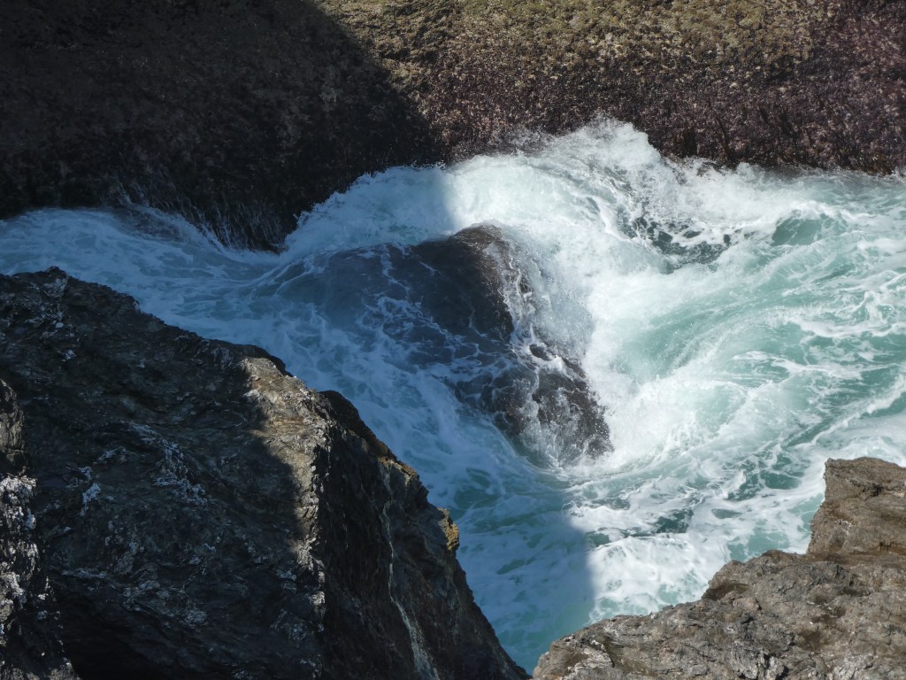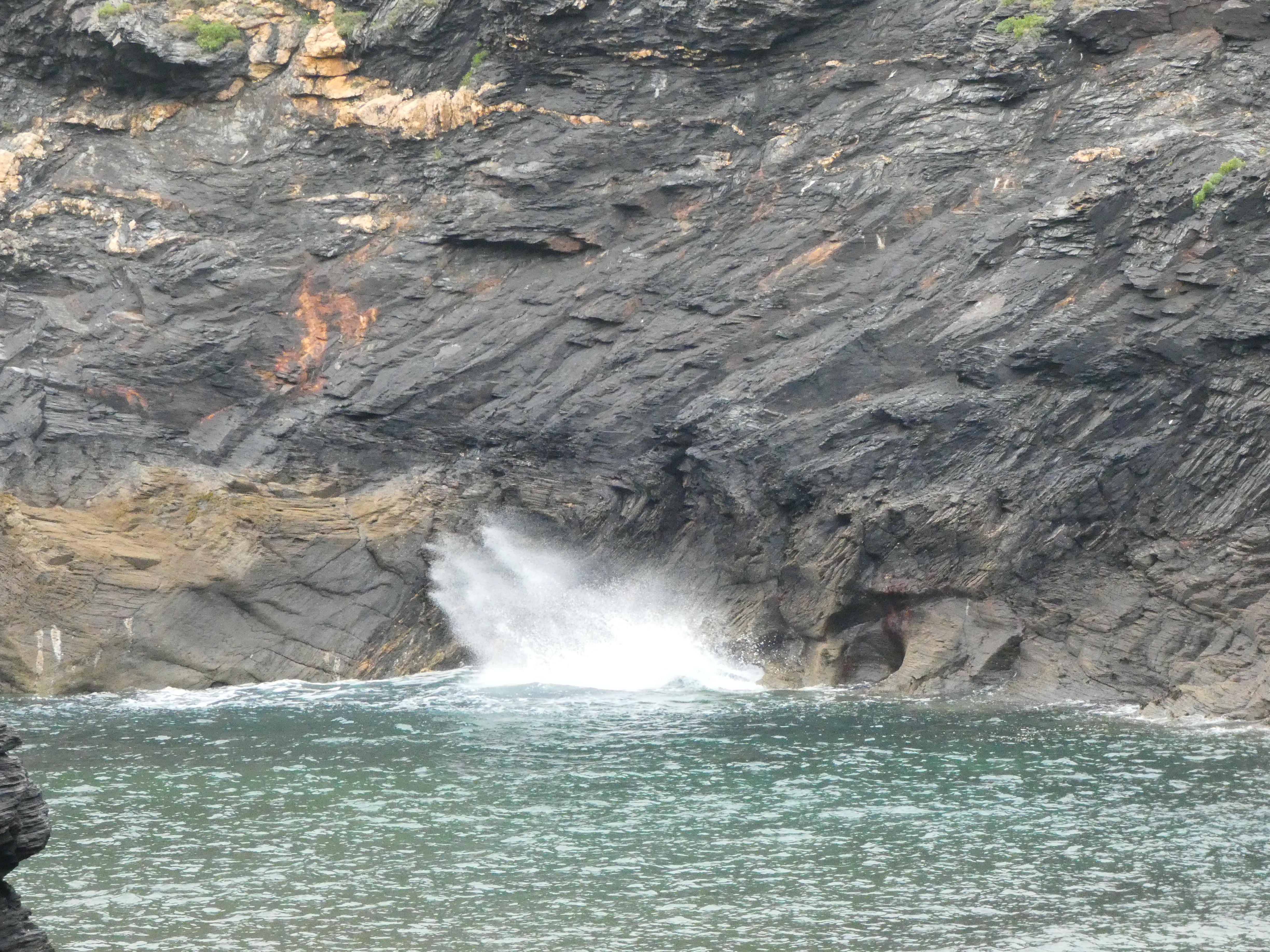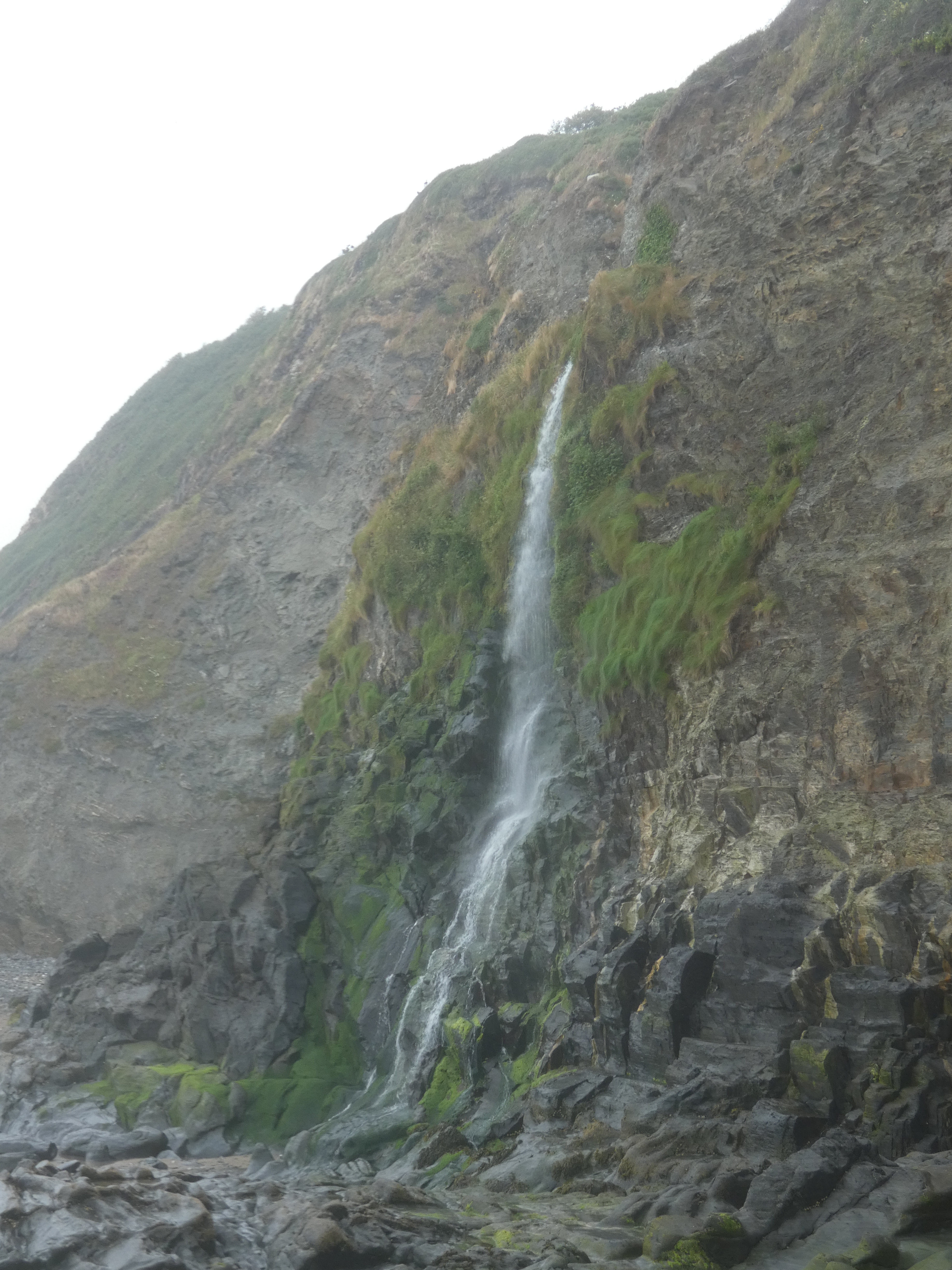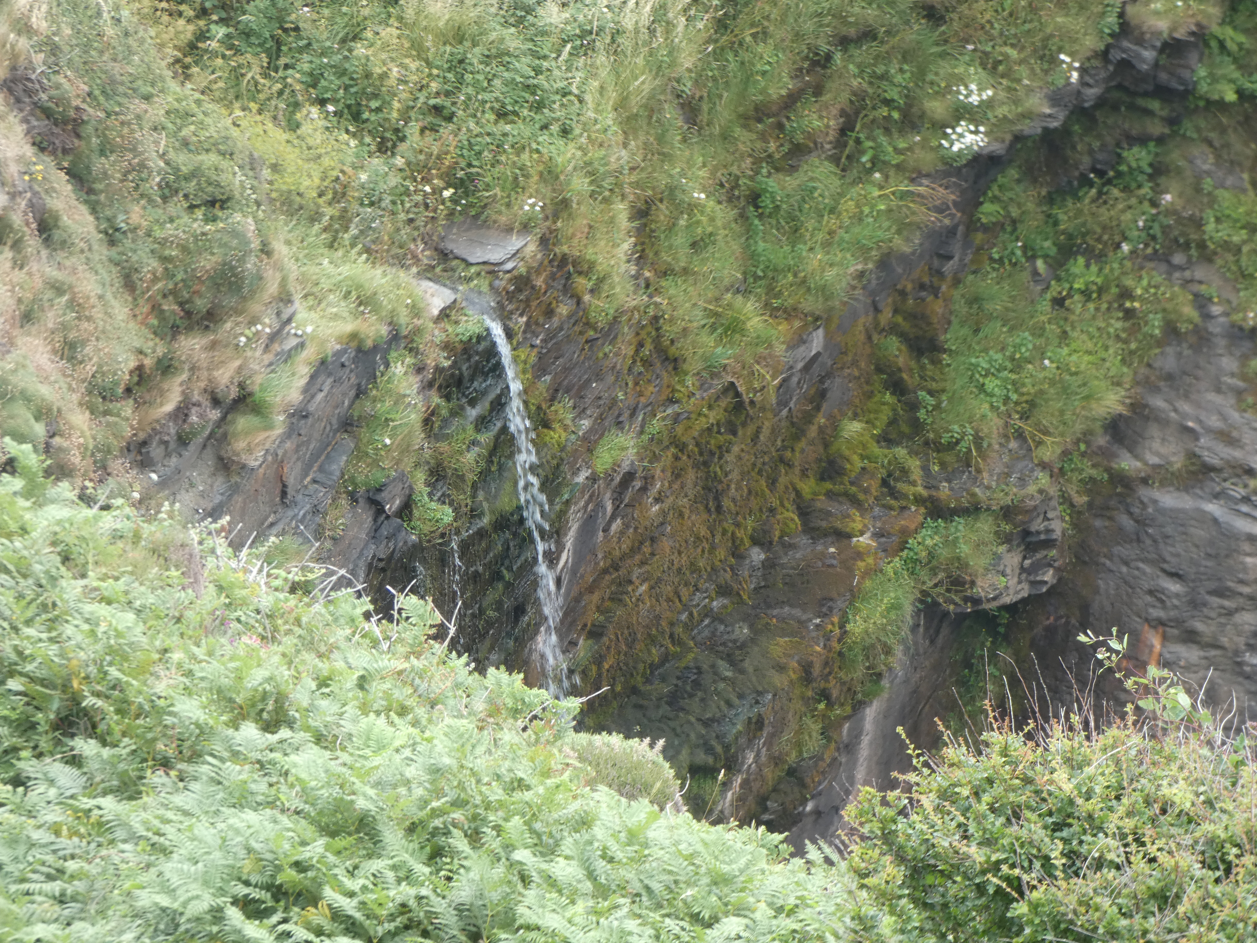 Tresaith op zich is niet zo belangrijk, maar ik wil toch wel even het strand op, omdat daar nog een waterval is, die hoog uit de klif komt gespoten en op de rotsgrond naast het strand klettert. Speciaal om te zien, dat zeker. Aan de andere zijde van het strand nog wat ondiepe grotten in de rotswand. Blij, dat ik hier toch even de moeite voor genomen heb…