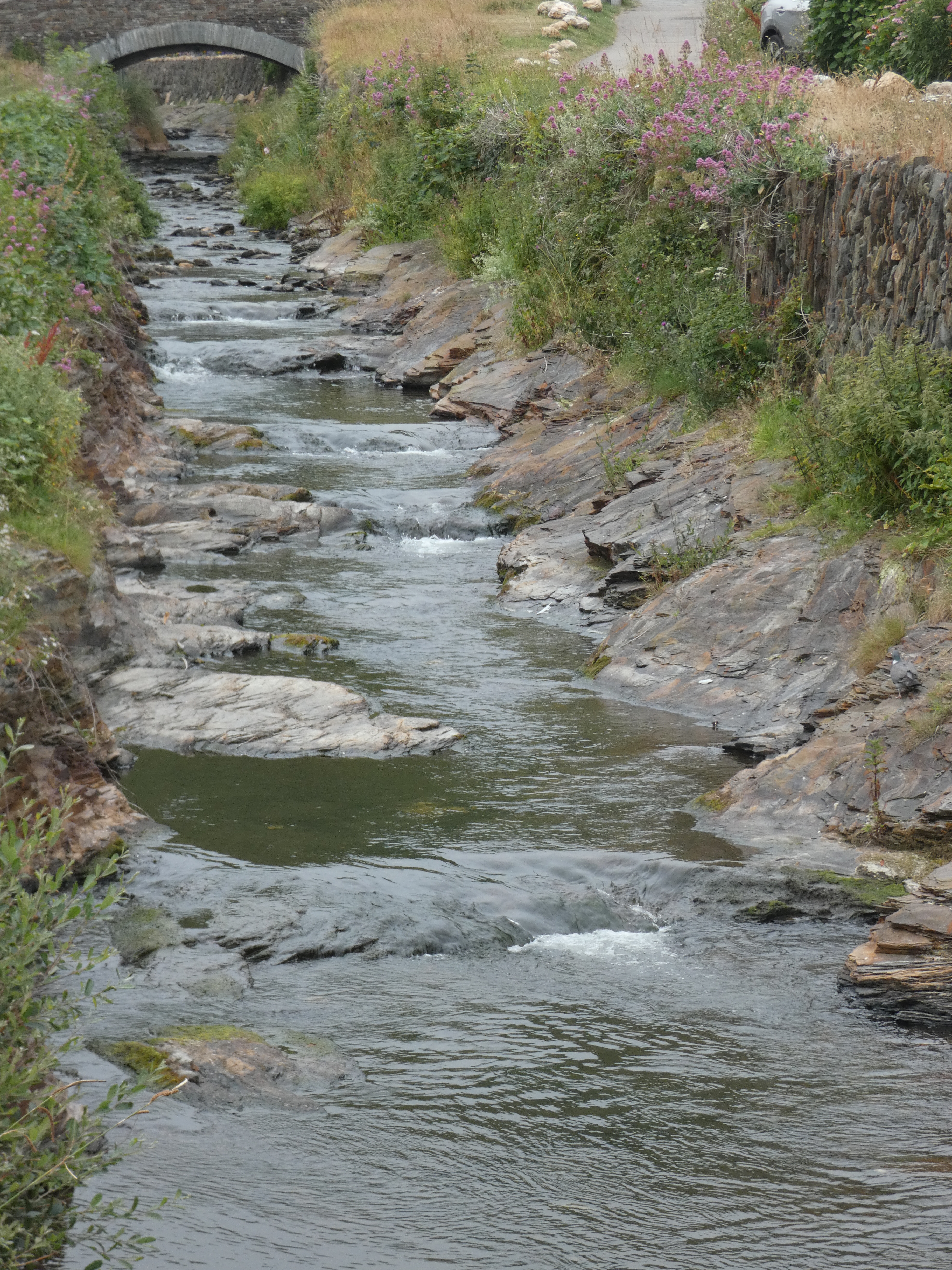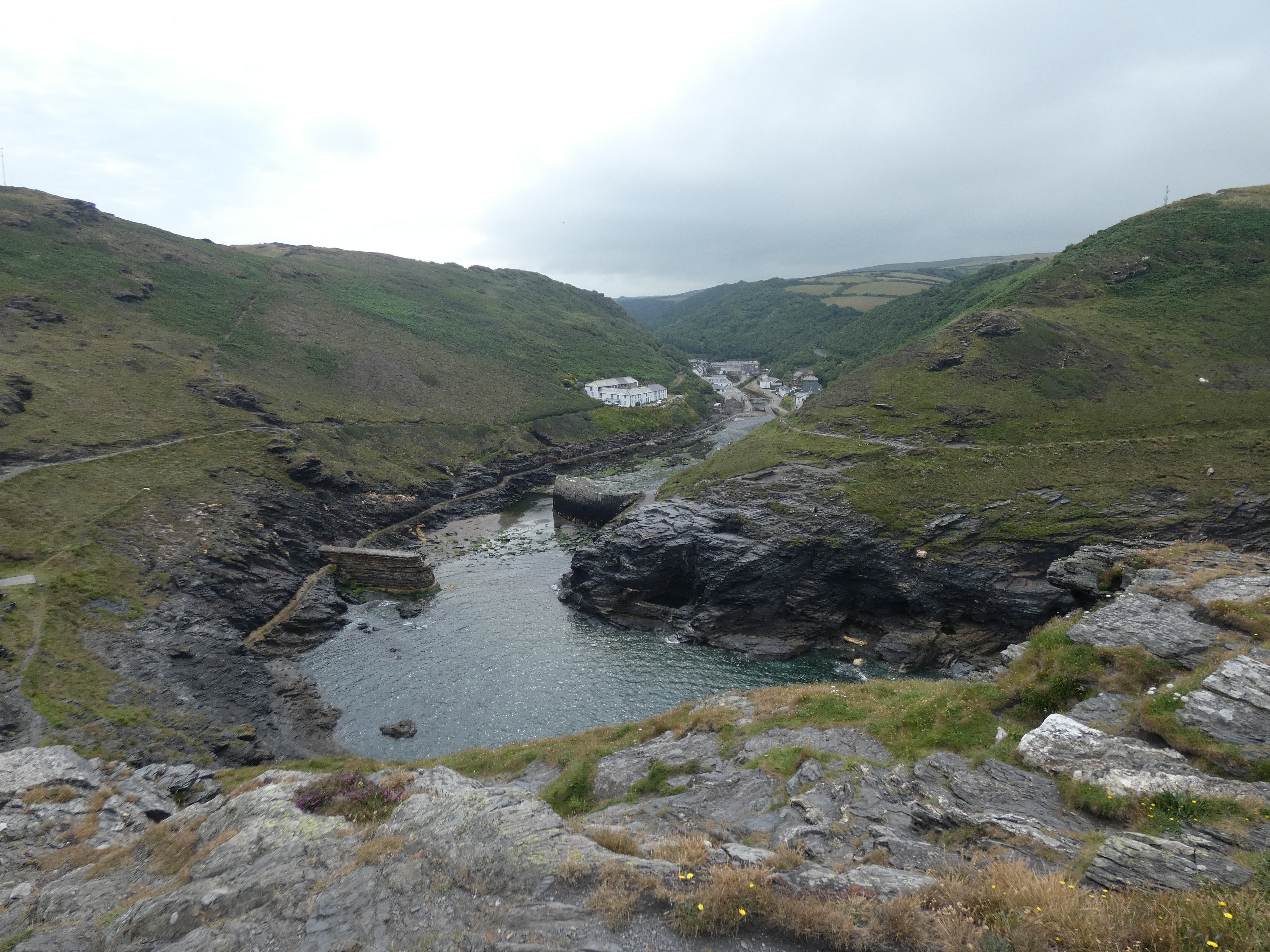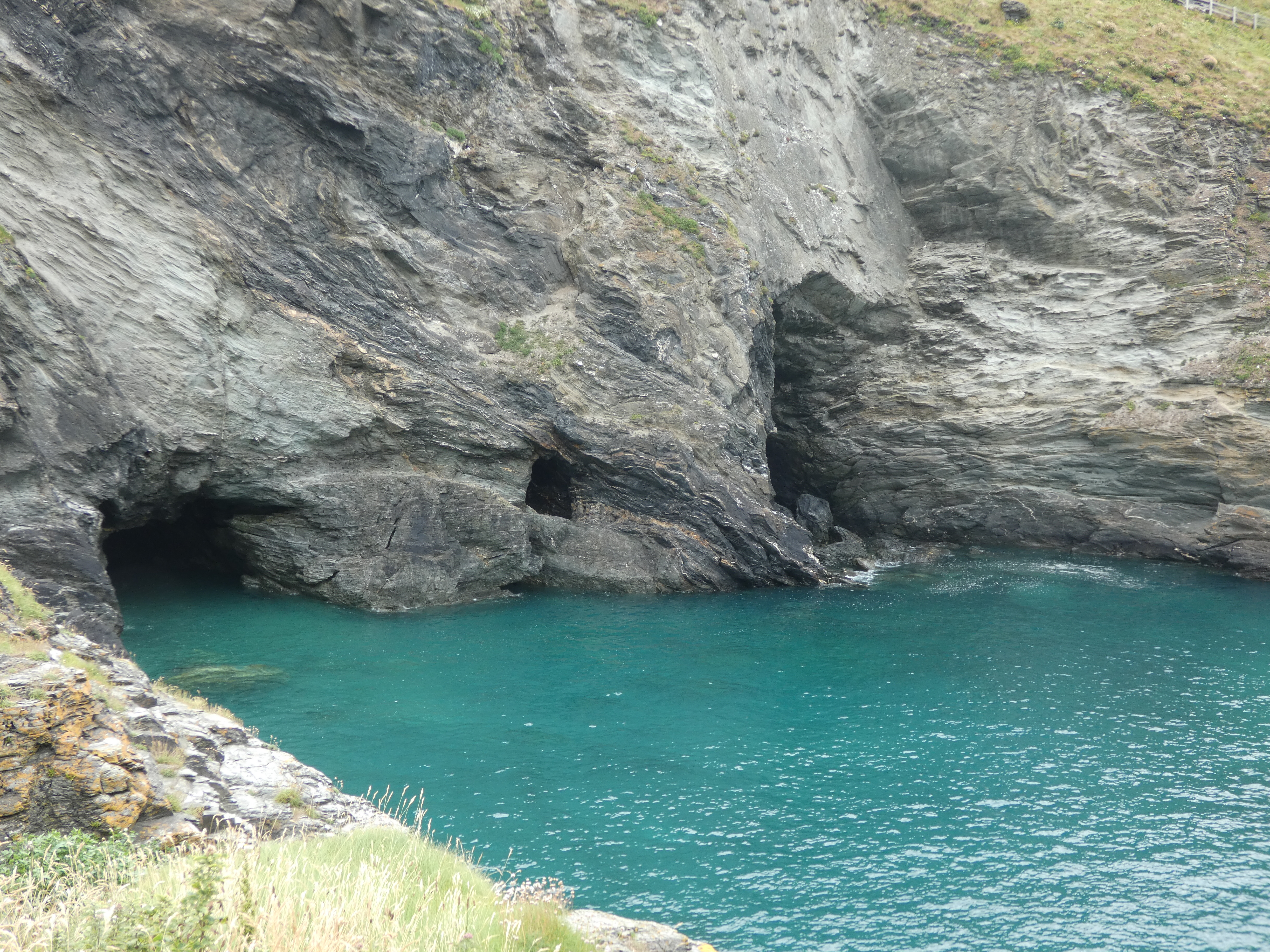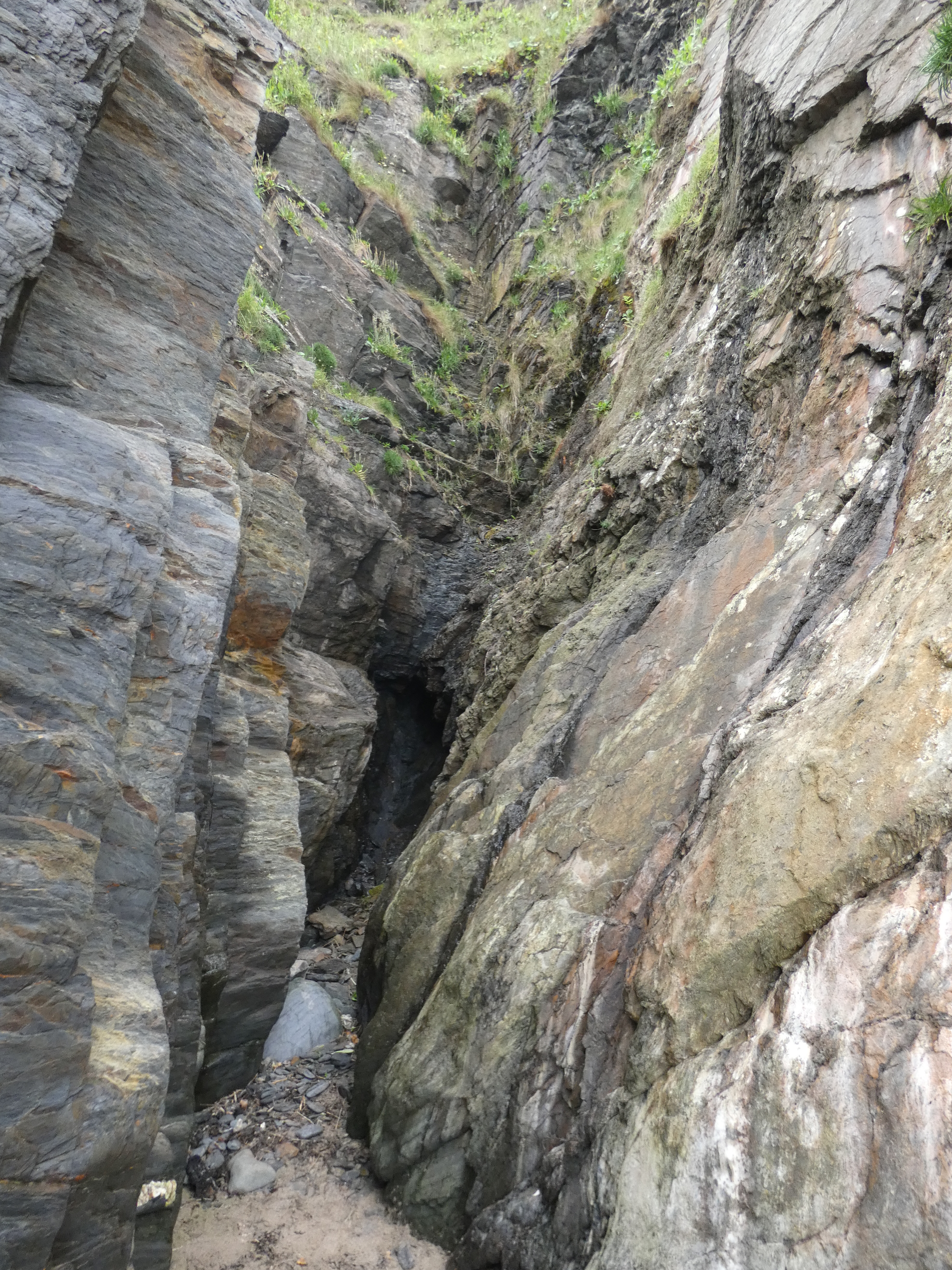 Tresaith op zich is niet zo belangrijk, maar ik wil toch wel even het strand op, omdat daar nog een waterval is, die hoog uit de klif komt gespoten en op de rotsgrond naast het strand klettert. Speciaal om te zien, dat zeker. Aan de andere zijde van het strand nog wat ondiepe grotten in de rotswand. Blij, dat ik hier toch even de moeite voor genomen heb…