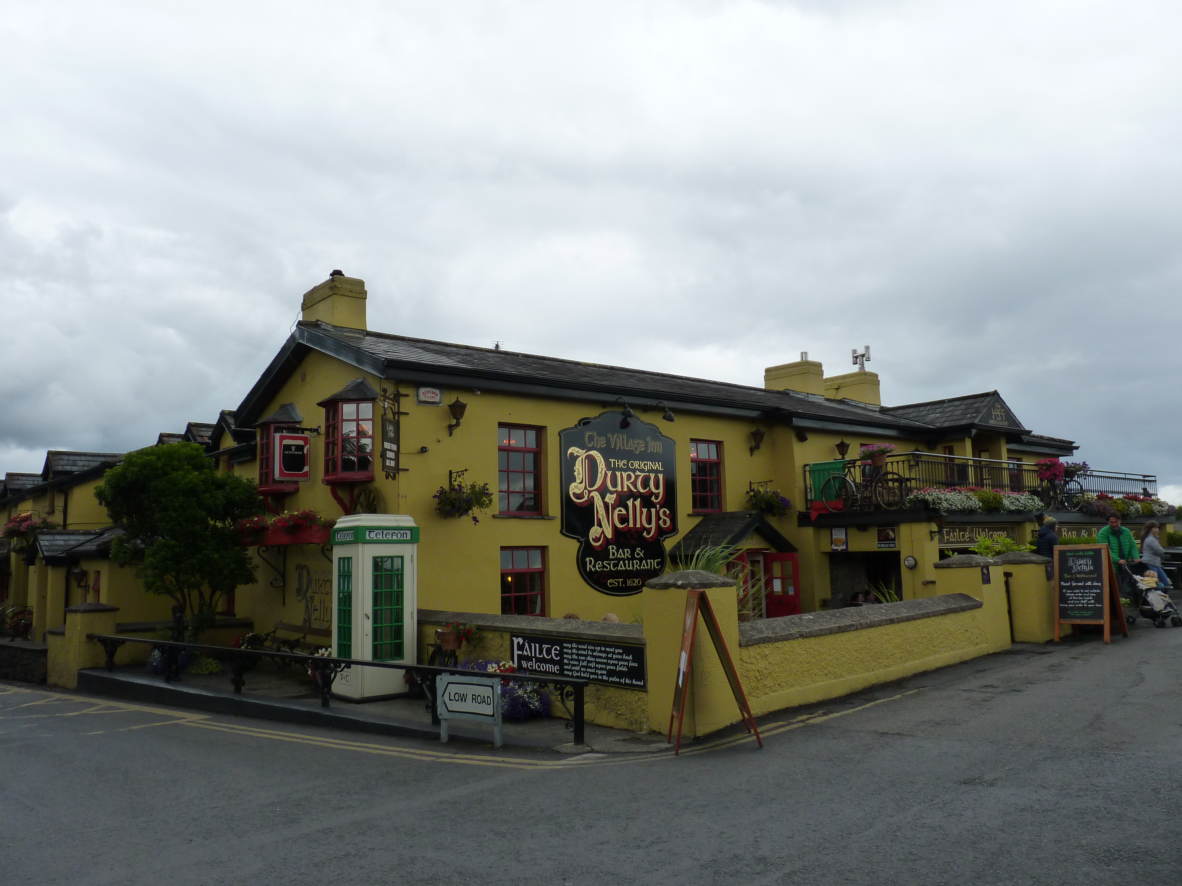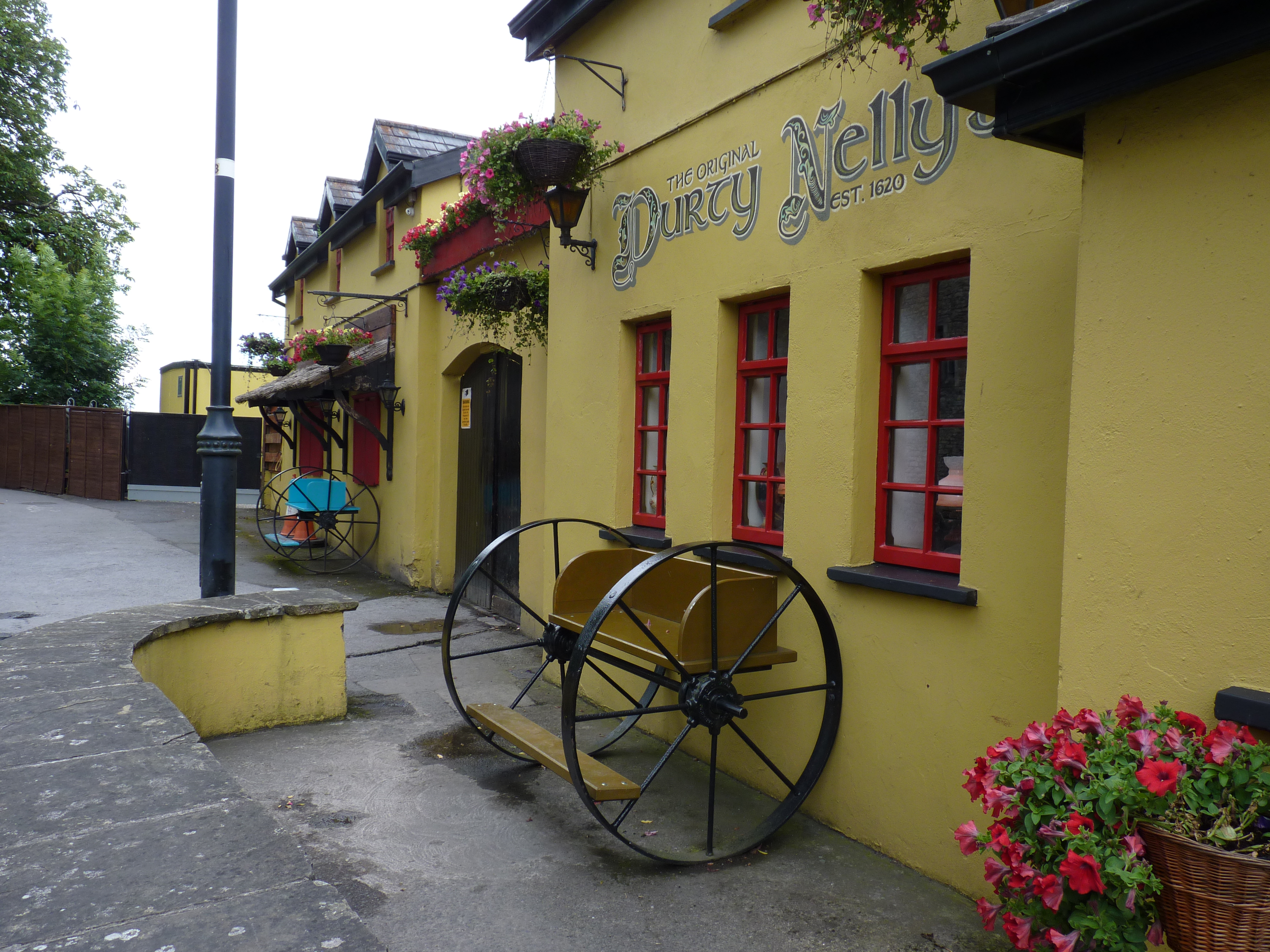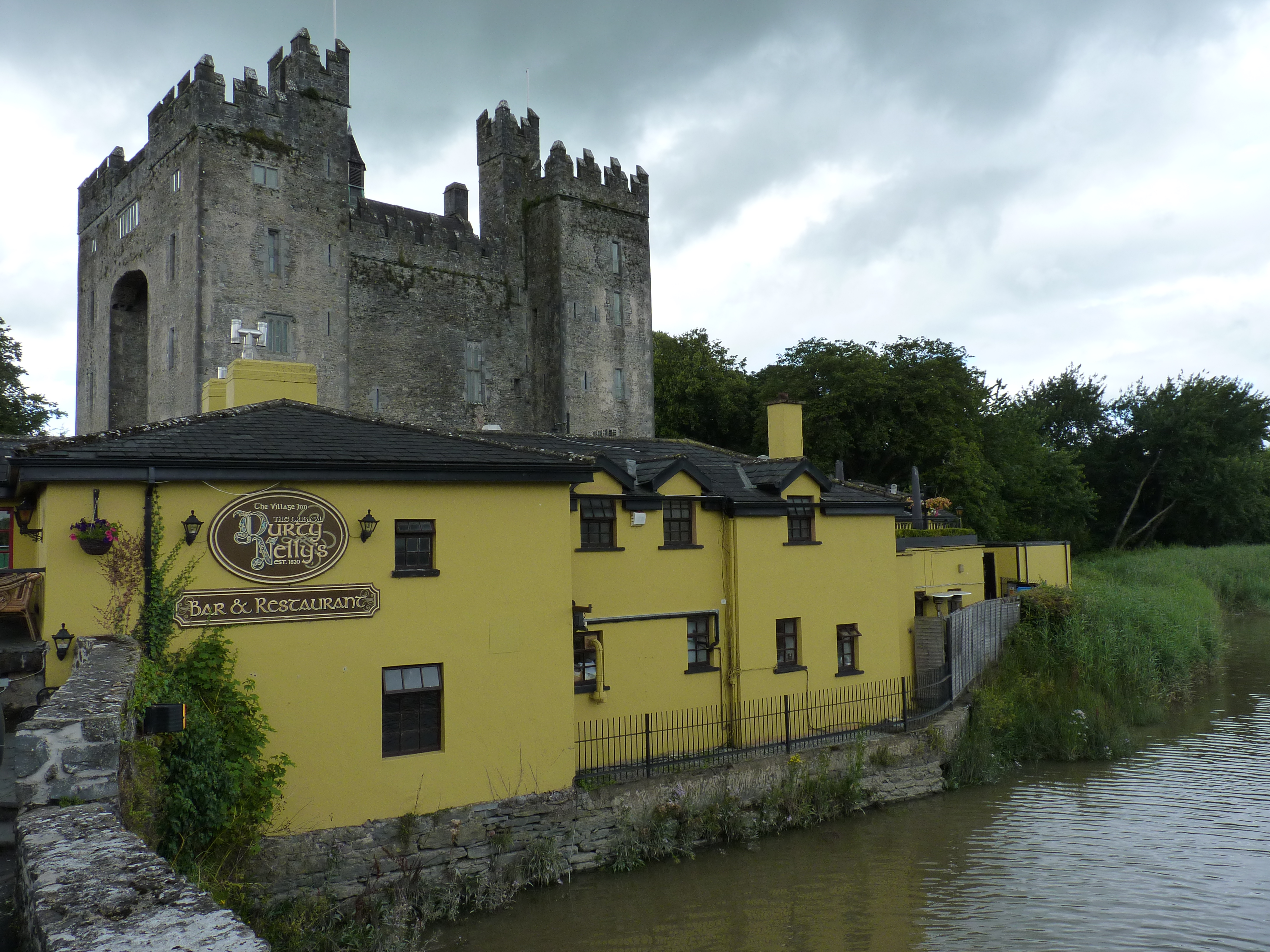 Een uur of vier later sta ik weer bij mijn auto, nog even een tas koffie scoren ergens en op weg weer. Nog zo’n 160 kilometer te gaan, hier is dat zo’n 2,5 uur rijden. De bedoeling is om nog in Bunratty te geraken, niet ver van Limerick. Een leuke plek, met een oud kasteel, waar zelfs nog banketten gehouden worden in middeleeuwse stijl. Ernaast een openluchtmuseum. En , heel belangrijk, vlakbij, Durty Nelly’s. Een vierhonderd jaar oude pub, die gekend is door heel Ierland. Onlosmakelijk verbonden met het kasteel. Iets om volledig in sfeer te raken. Met zorg onderhouden en ingericht, veel ziet nog uit zoals het altijd was. Met wat fantasie, zie je de oude reizigers halthouden voor wat rust, een goed maal en de nodige drank. Zowel buiten als binnen is het goed toeven, in de schaduw van het machtige kasteel… Al is het maar voor even, het is toch een plek waar je met plezier terug blijft komen. En een goed pubmeal is in Ierland nooit weg…