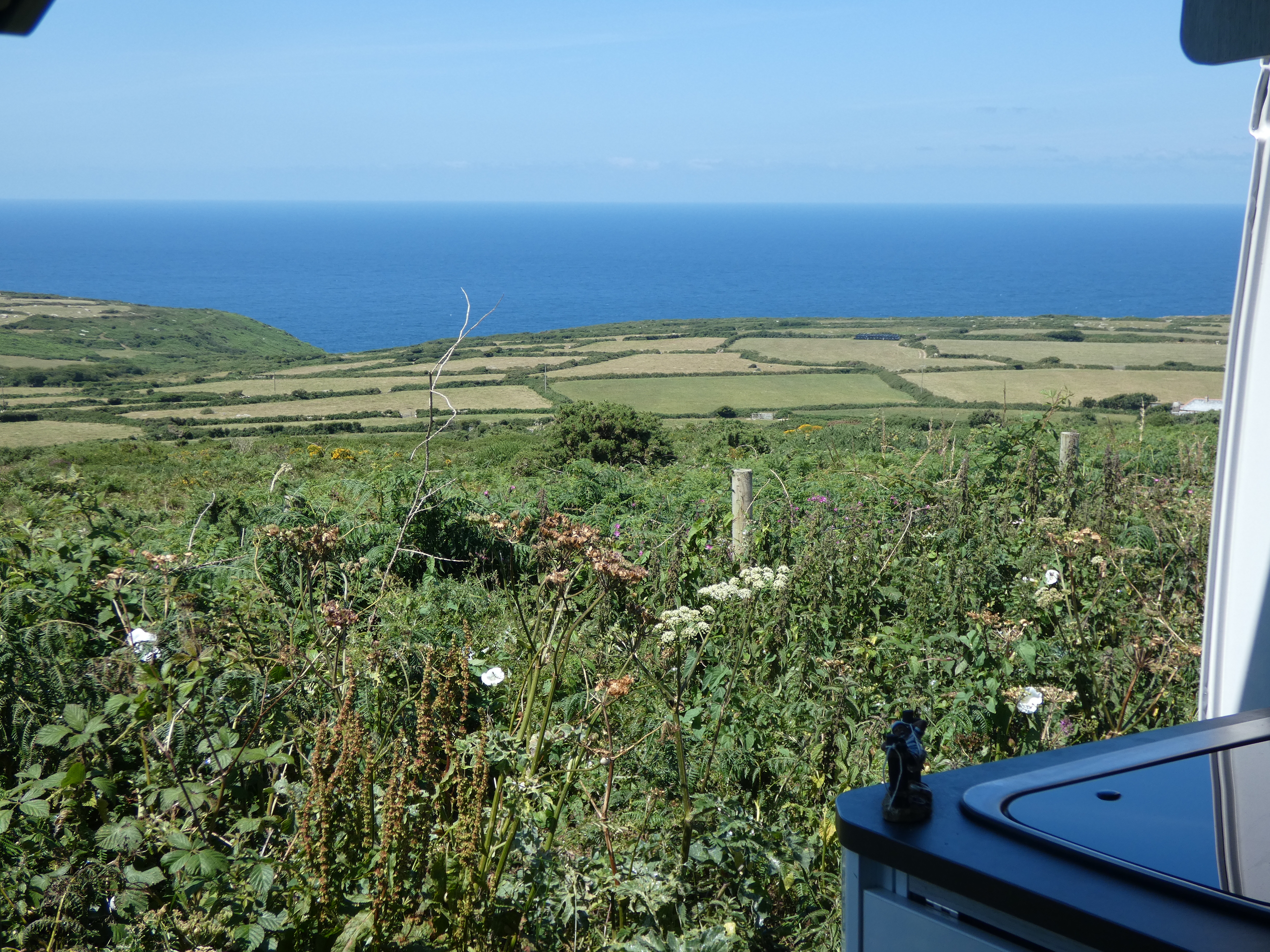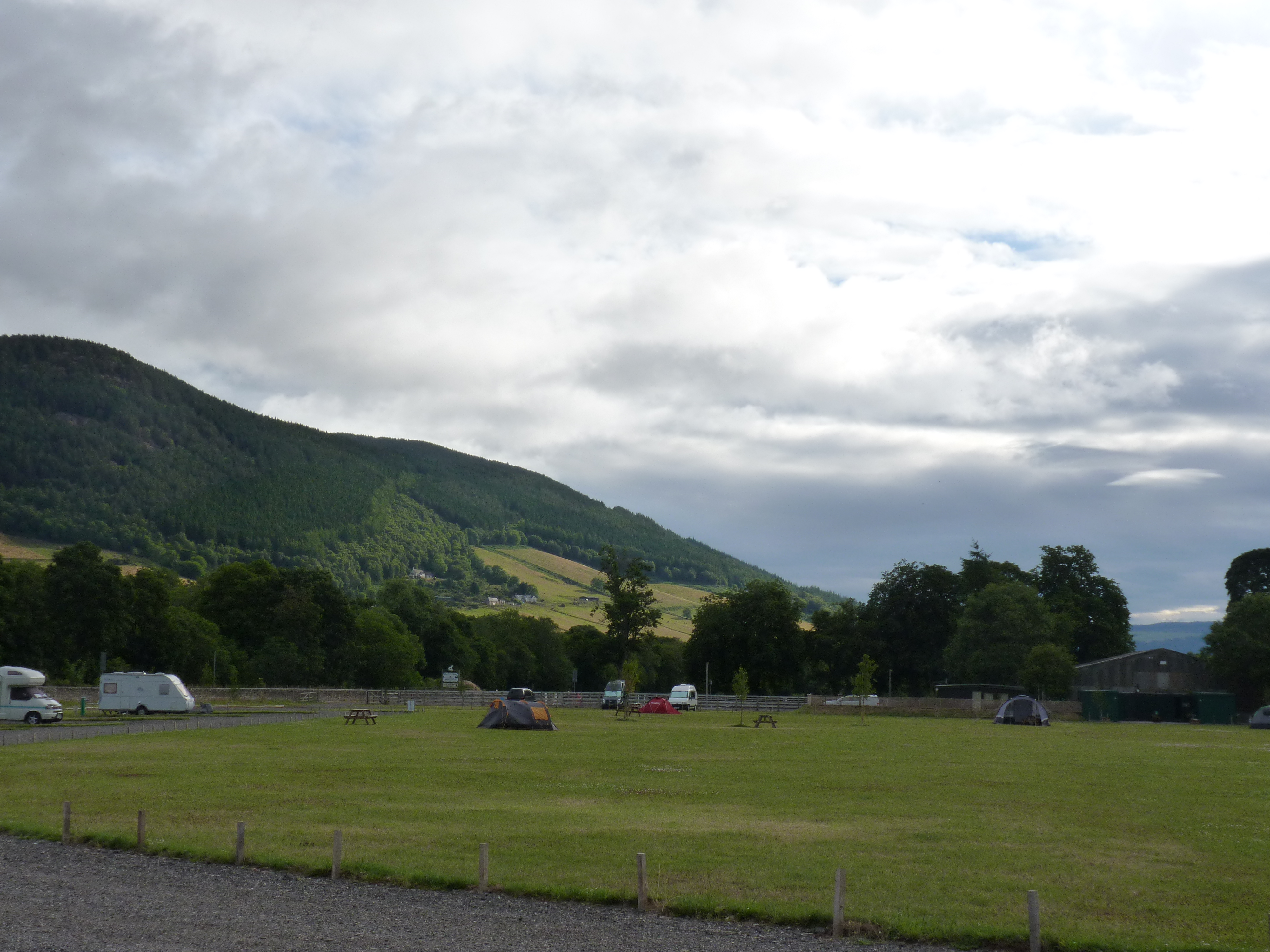 Maar nu is het tijd om door te gaan, nog makkelijk een uur of twee te gaan en nog een camping zoeken… Rond half zes rijd ik de Schotse grens over, kan niet missen met zo’n grote Schotse vlag langs de weg. En rond half zeven sta ik op een kleine boerencamping met een view om in weg te smelten. Een aangename avond met een lange wandeling na het eten. Doet altijd zo deugd…