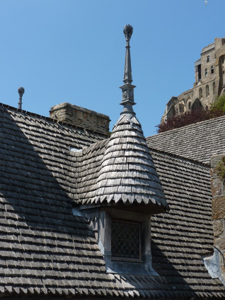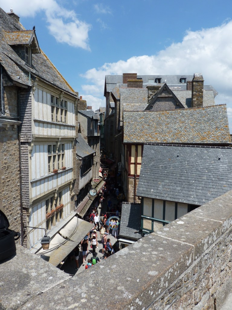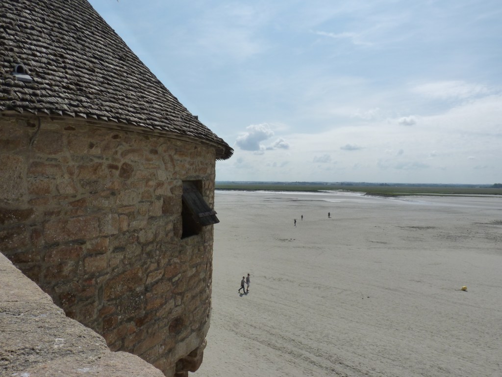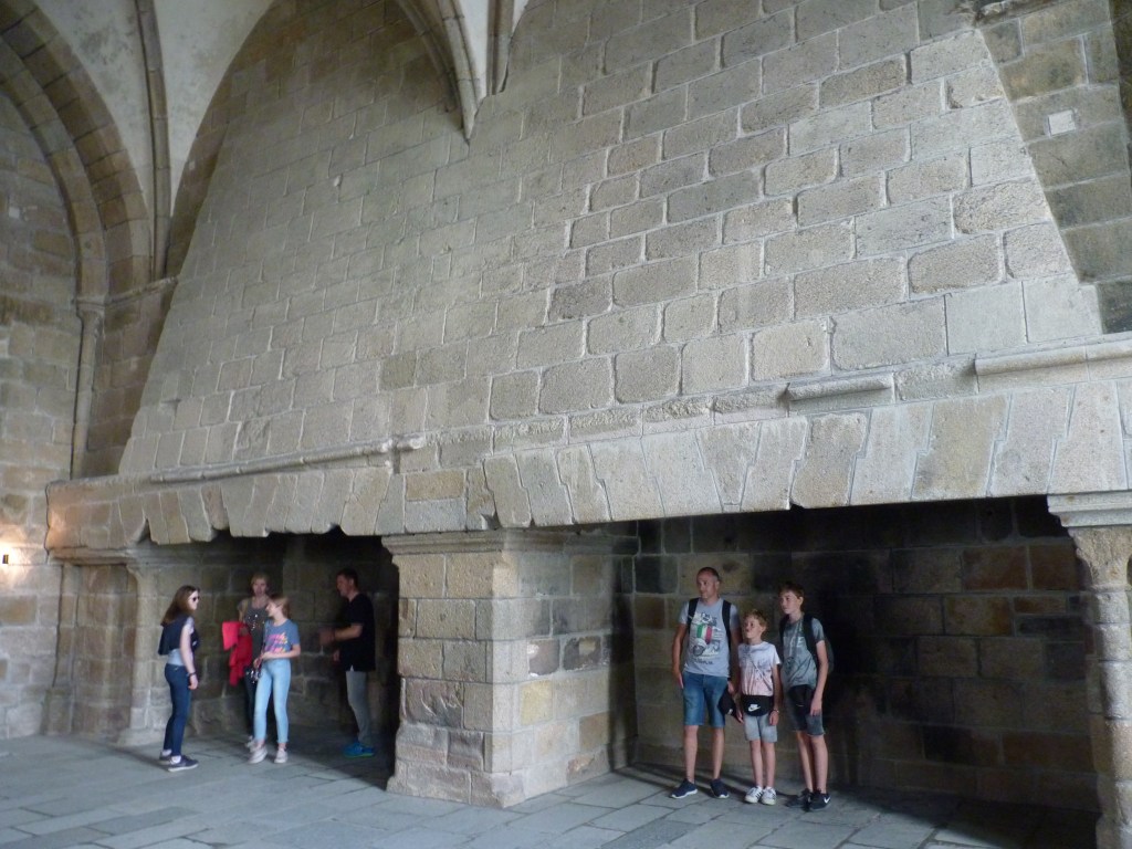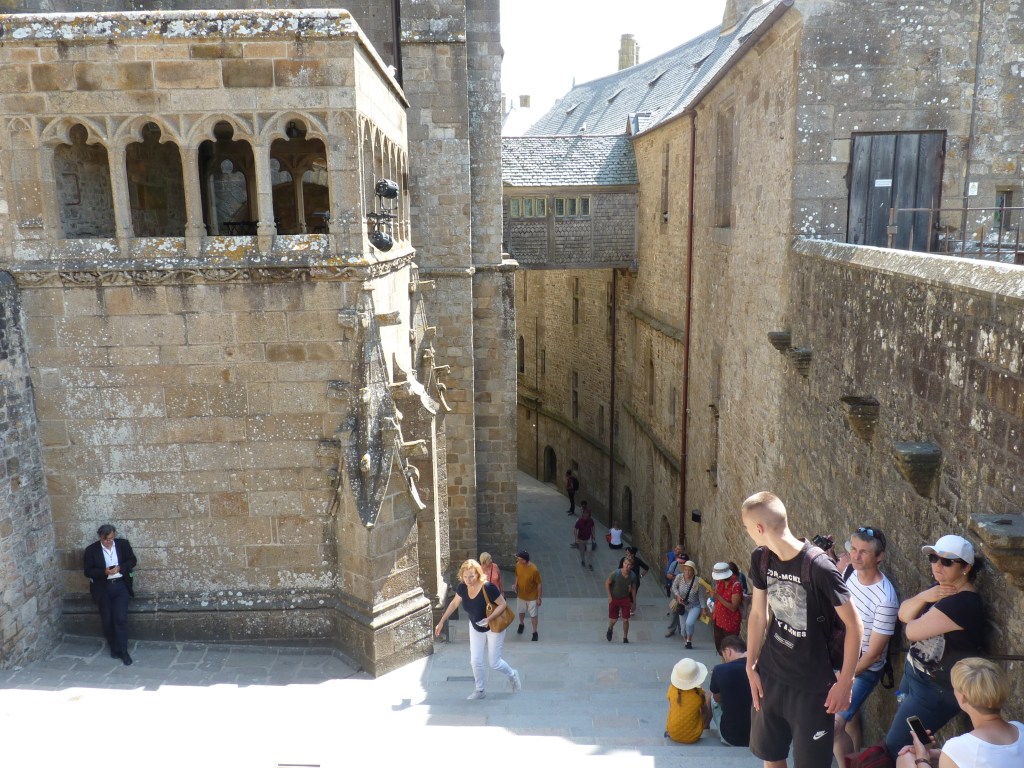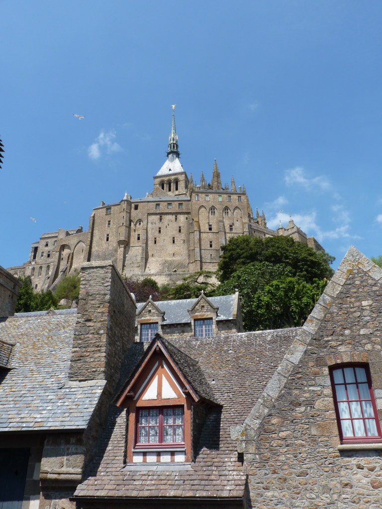 Mont Saint Michel….even wat geschiedenis…Gesticht door de heilige Aubert rond 700 (toen was hij natuurlijk nog niet heilig, maar ondertussen wel). Hij kwam graag op het eiland om te bidden en in rust in de natuur te zijn. Volges de legende is aartsengel Michaël aan hem verschenen en hj kreeg een visioen van een kerk op de rots. Na heel wat bouwen, van kapel naar kerk, naar klooster, was er in de 9e en tiende eeuw alleen maar een klooster op het eiland. Bewoond door Bendictijner monniken. Voor de bevoorrading voor de monniken gebruikte men sloep of schip. In 966 kwamen de Noormannen (Normandiërs). Ze vonden het een uitgelezen plek en bouwden onderaan en rondom het eiland huizen op de rotshellingen. De Benedictijnen werden met rust gelaten. De stenen die gebruikt werden voor de gebouwen komen van de eilanden Jersey en Guernsey, die 22 kilometer verderop liggen…