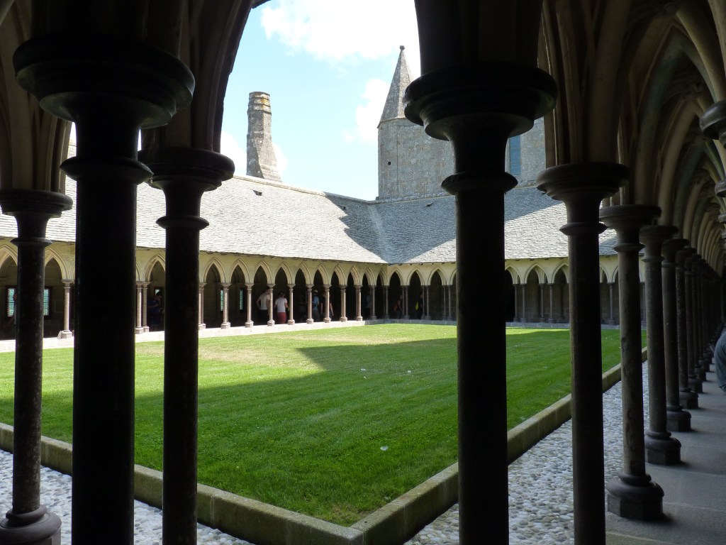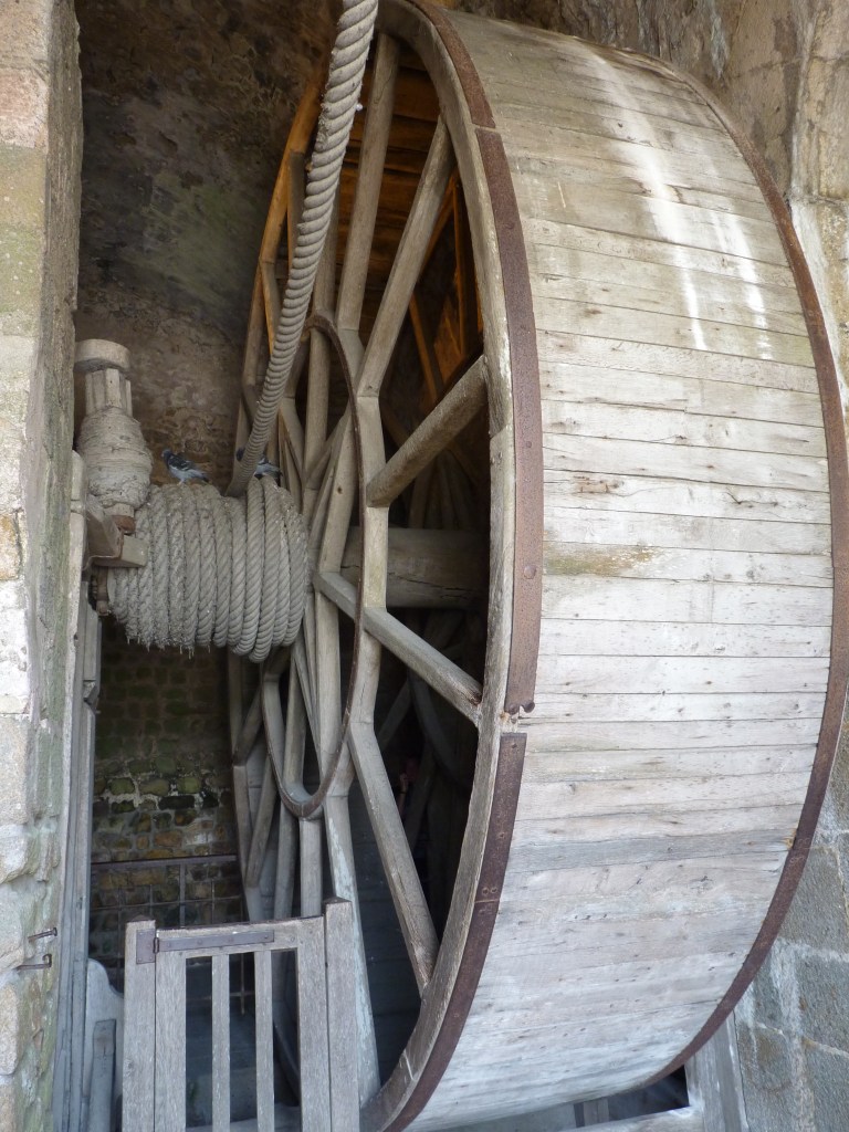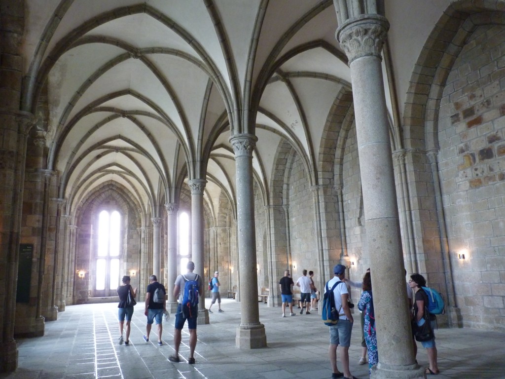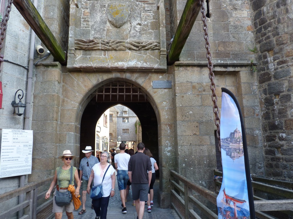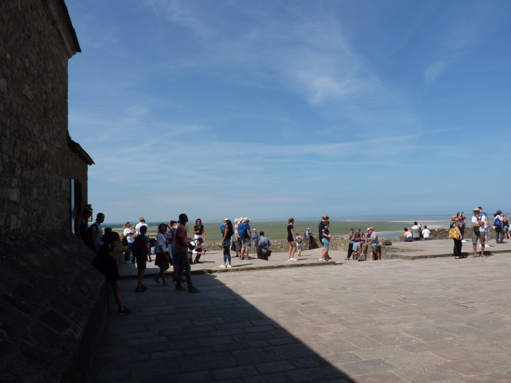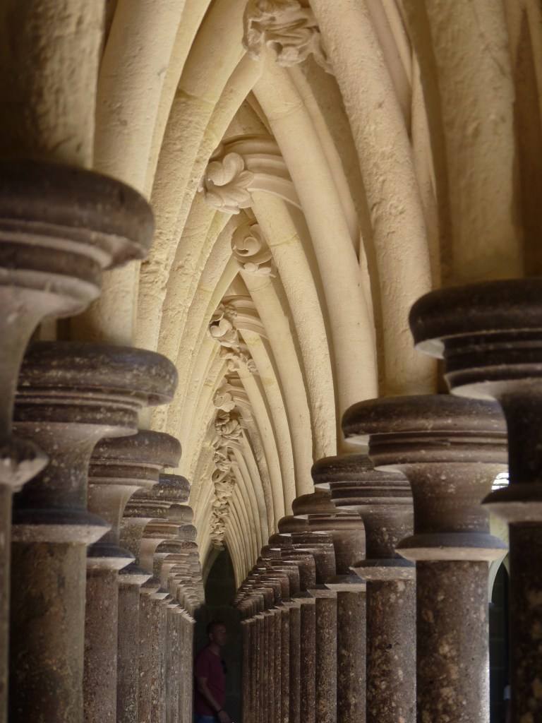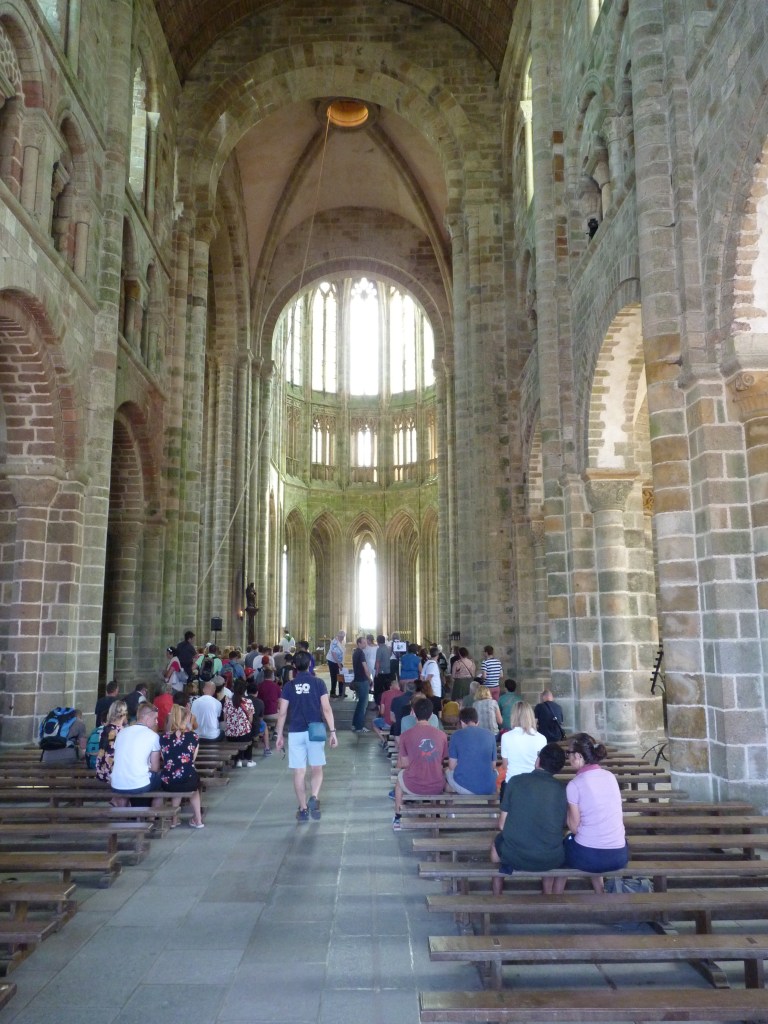 Mont Saint Michel….even wat geschiedenis…Gesticht door de heilige Aubert rond 700 (toen was hij natuurlijk nog niet heilig, maar ondertussen wel). Hij kwam graag op het eiland om te bidden en in rust in de natuur te zijn. Volges de legende is aartsengel Michaël aan hem verschenen en hj kreeg een visioen van een kerk op de rots. Na heel wat bouwen, van kapel naar kerk, naar klooster, was er in de 9e en tiende eeuw alleen maar een klooster op het eiland. Bewoond door Bendictijner monniken. Voor de bevoorrading voor de monniken gebruikte men sloep of schip. In 966 kwamen de Noormannen (Normandiërs). Ze vonden het een uitgelezen plek en bouwden onderaan en rondom het eiland huizen op de rotshellingen. De Benedictijnen werden met rust gelaten. De stenen die gebruikt werden voor de gebouwen komen van de eilanden Jersey en Guernsey, die 22 kilometer verderop liggen…