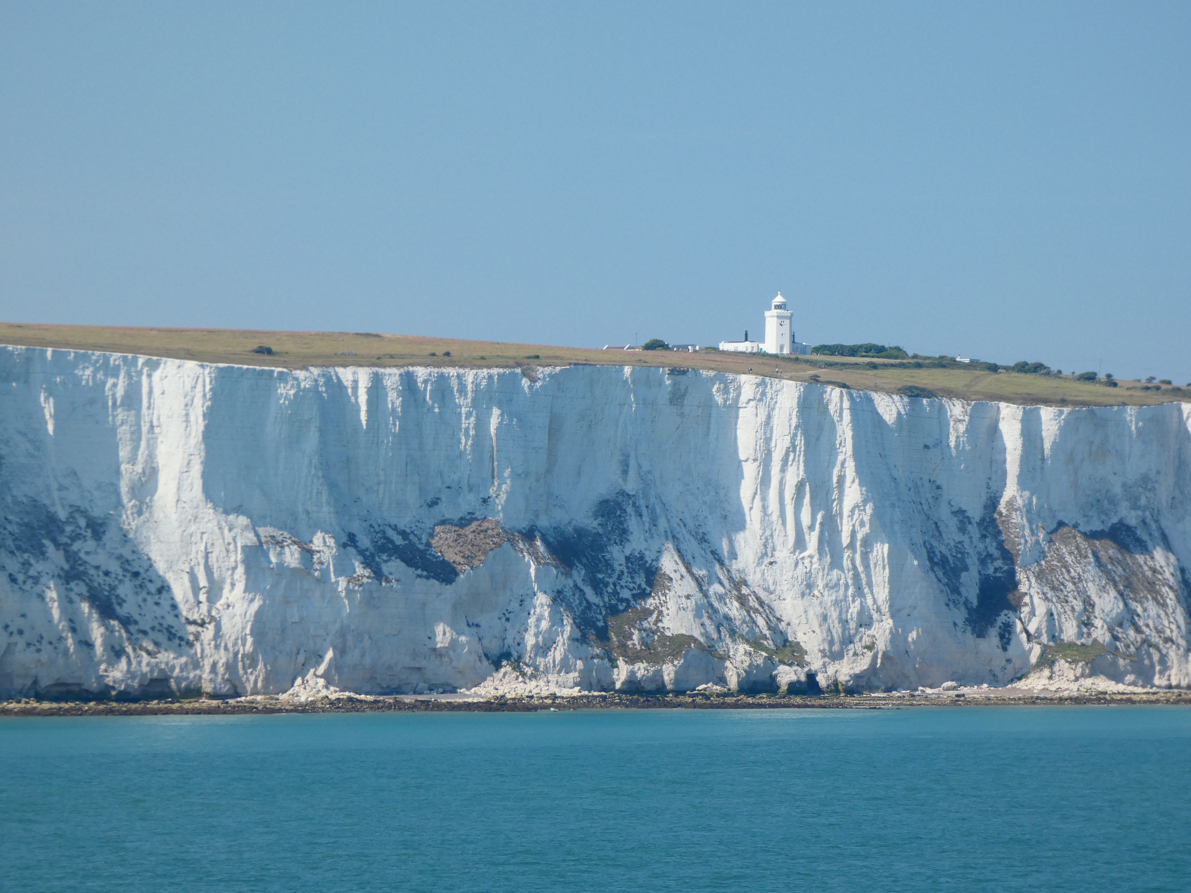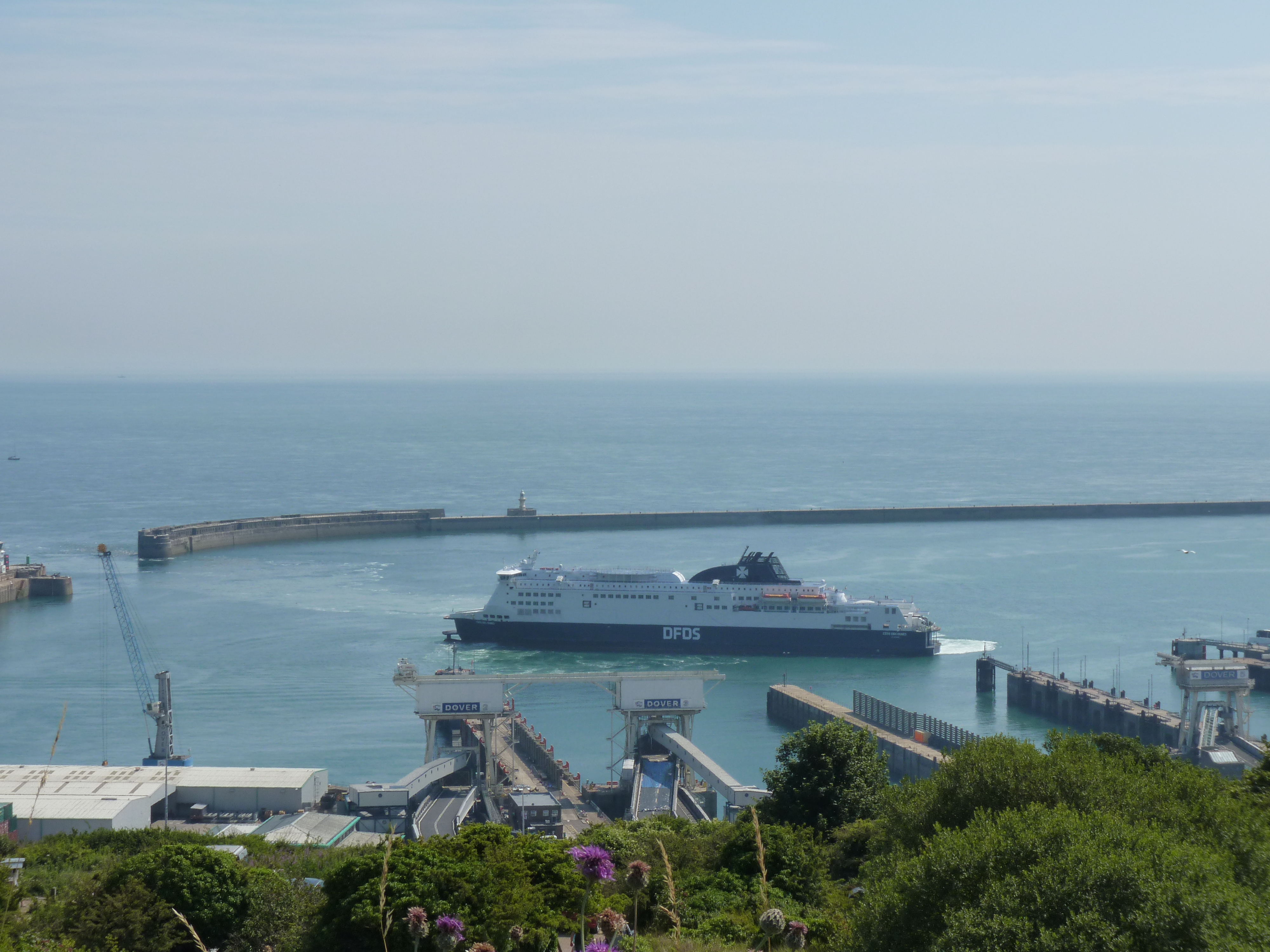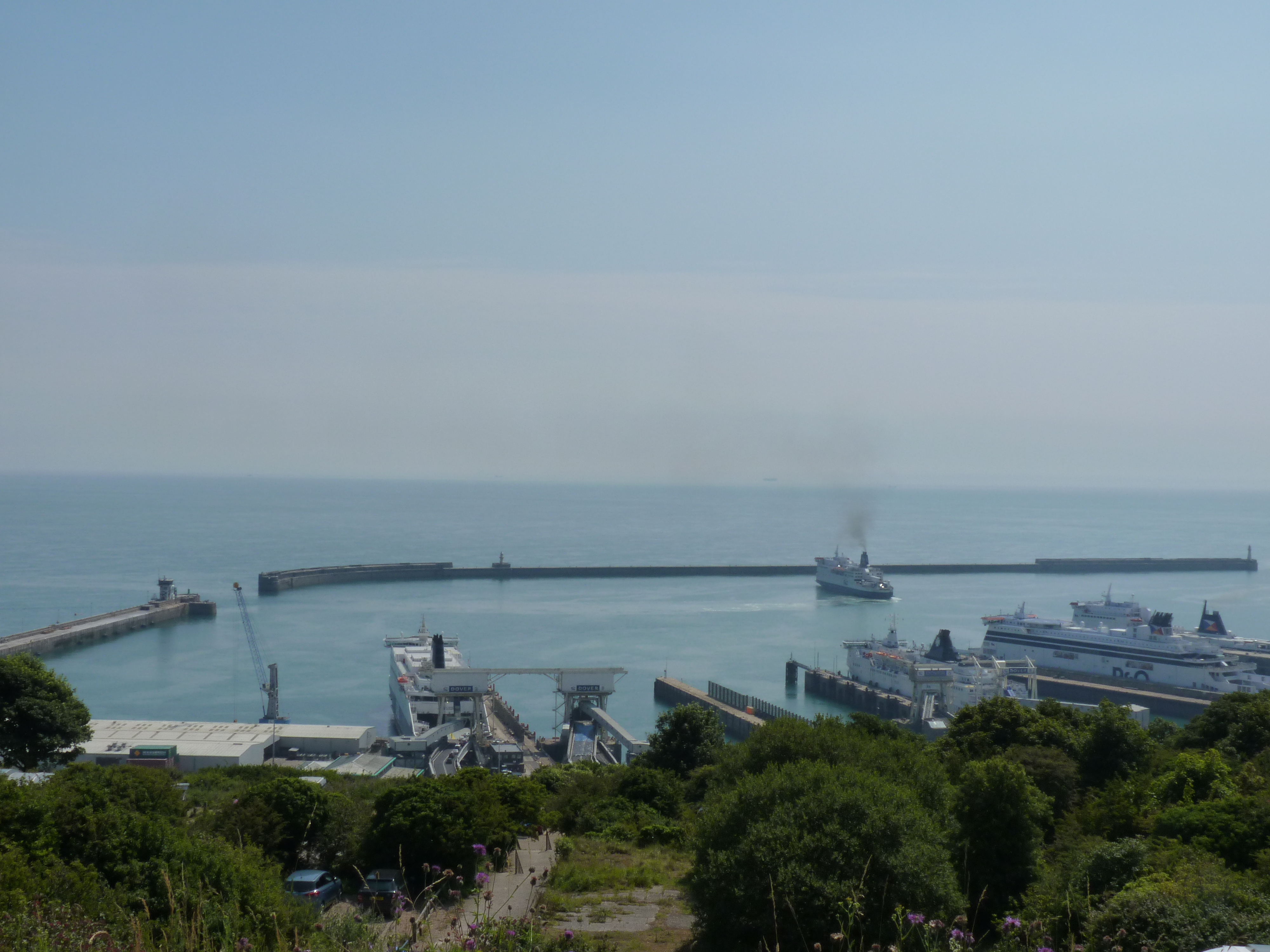 Eerst naar Dover, een 250 kilometer kachelen, uurtje of vier… Langzaam maakt de regen plaats voor zon en tegen dat ik in de buurt van Dover begin te komen, schijnt de zon weer vrij en blij en geeft de meter weer 25 graden aan.