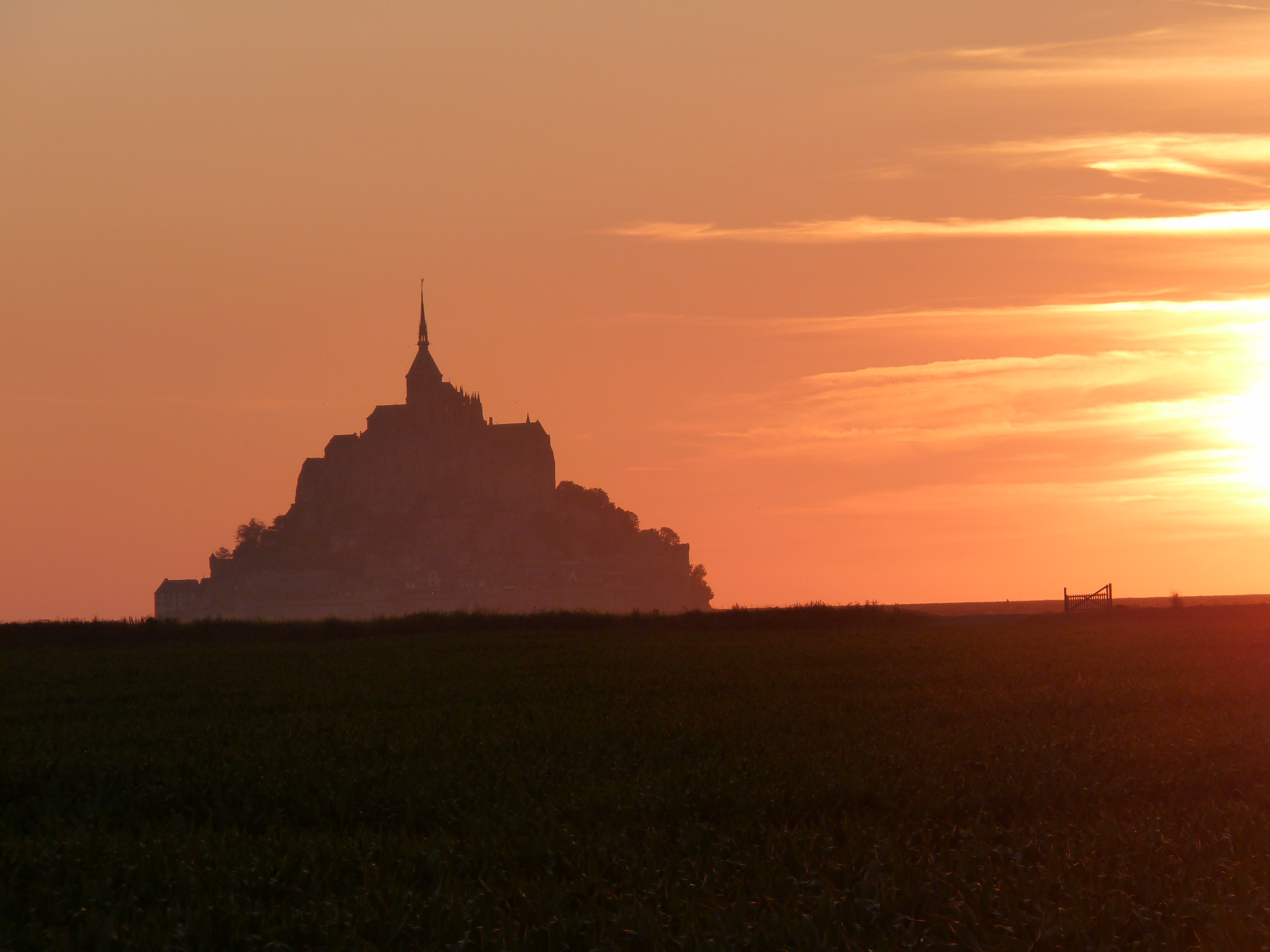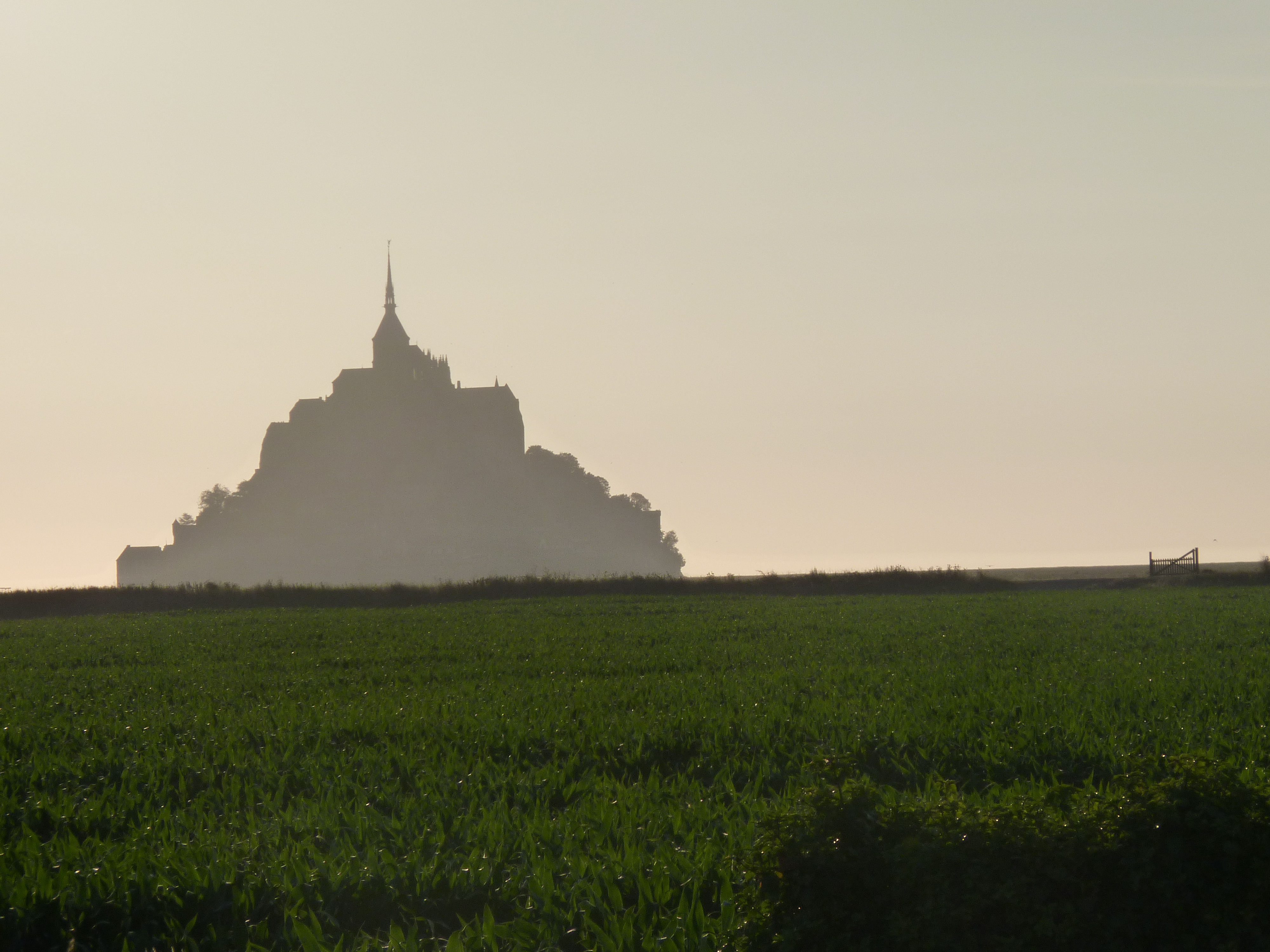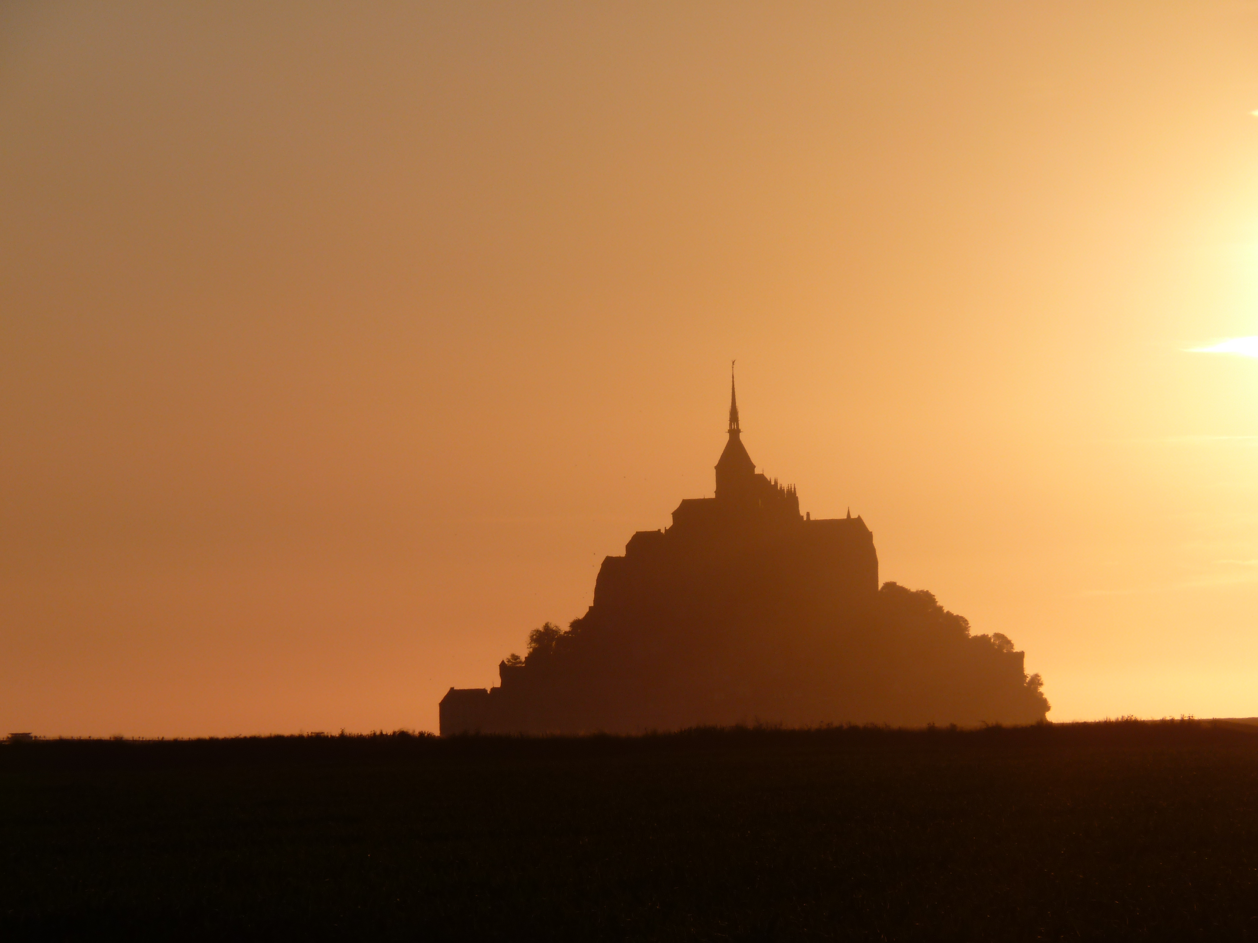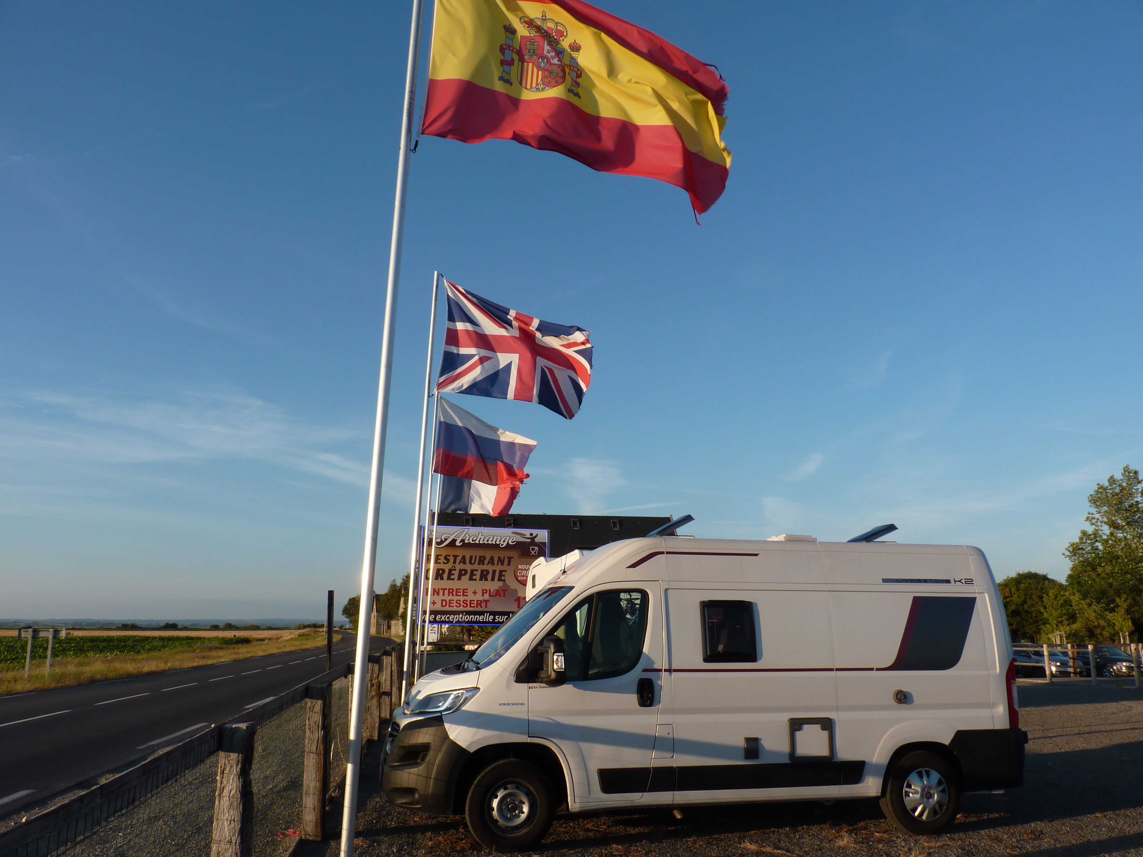 Een rit van 637 kilometer. Ik start ’s morgens om half elf, rij bijna direct een dikke file in, maar goed, who cares… Behoorlijk ongeluk, dat me zeker anderhalf uur vertraging oplevert. ’s middags rond half vijf kom ik bij de pont de Normandie. Daarna nog twee keer file, maar ik kom toch op mijn slaapplek aan rond half acht ’s avonds. Gemiddelde snelheid van deze dag 78 kilometer per uur… MIjn slaapplek…een pannenkoekenrestaurant, langs de weg naar de mont saint Michel, met zicht op het eiland. Op nog een kilometer of 4 ervanaf, maar je ziet het goed liggen over de velden en de zonsondergang laat me genieten… Restaurant l’Archange (in Huisnes sur mer) ligt langs een belangrijke aanvoerweg voor het eiland, er is behoorlijk veel verkeer, maar later op de avond en ’s nachts is dat verwaarloosbaar. Op het eerste zicht lijkt het niet de beste keuze, maar ik zal het even verklaren… Er is verderop, vlakbij het eiland, een camperplaats bij een boerderij, maar dat is achter de slagboom, niet heel duur, maar de slagboom kost ook best wat, dus kom je op een 15tal euro’s. Op de parking van het eiland is een heel grote camperplaats, waar je kan overnachten en blijven staan voor het bezoek (met gratis shuttle), die kost 18 euro en je staat in een zee van wit met al die (100) campers. Druk en bij volop zon geen pretje in mijn ogen. En een kilometer of 6 verder nog een camerplaats voor 16 euro. Waar ik sta, 6 euro. Voor 24 uur. Dus ook daar kan ik gewoon blijven staan.Ik kan te voet (lange wandeling langs de velden), maar ik kan ook met de fiets. Je kan fietsen tot aan de passerelle, van waar iedereen te voet verder moet. In mijn ogen een stuk goedkoper, ik sta niet in een grote drukte en ik hoef nergens rekening mee te houden. Ik sta, een lekkere tas koffie en genieten van de zon die het eiland in een speciale gloed zet. Een zicht dat nooit verveelt… Net zoals wanneer de ochtendzon het eiland al vroeg in volle glorie zet en het avontuur lonkt…