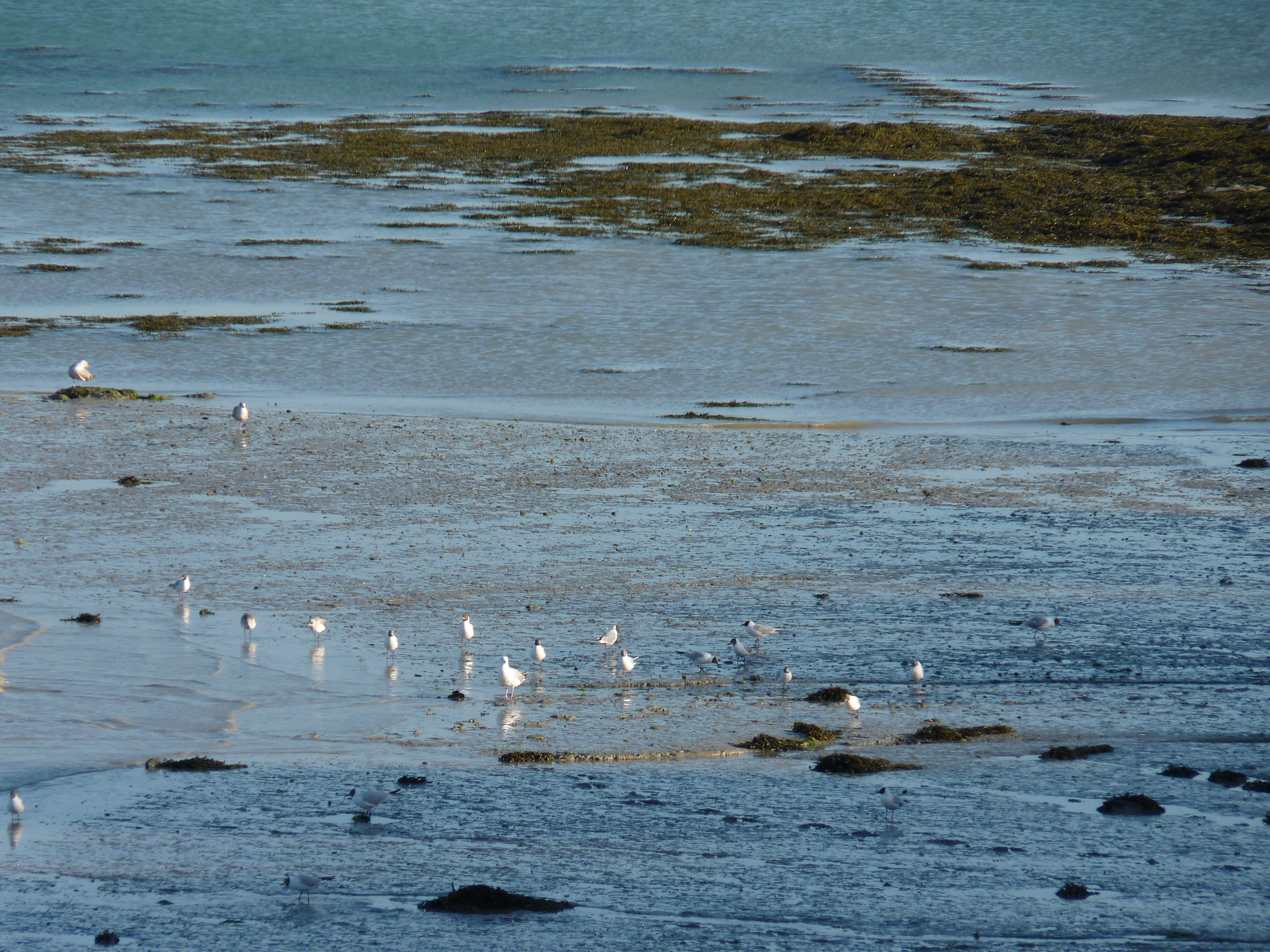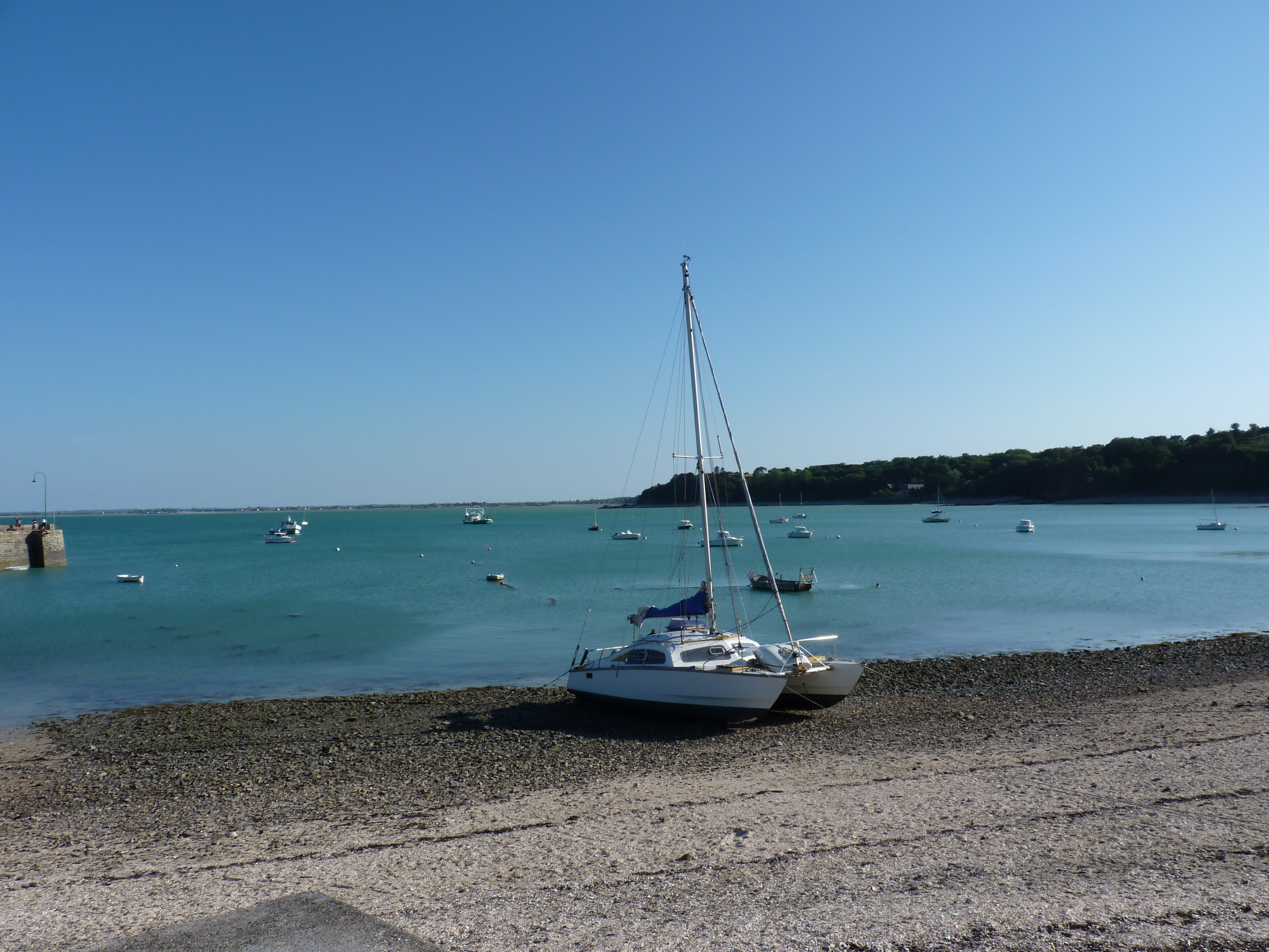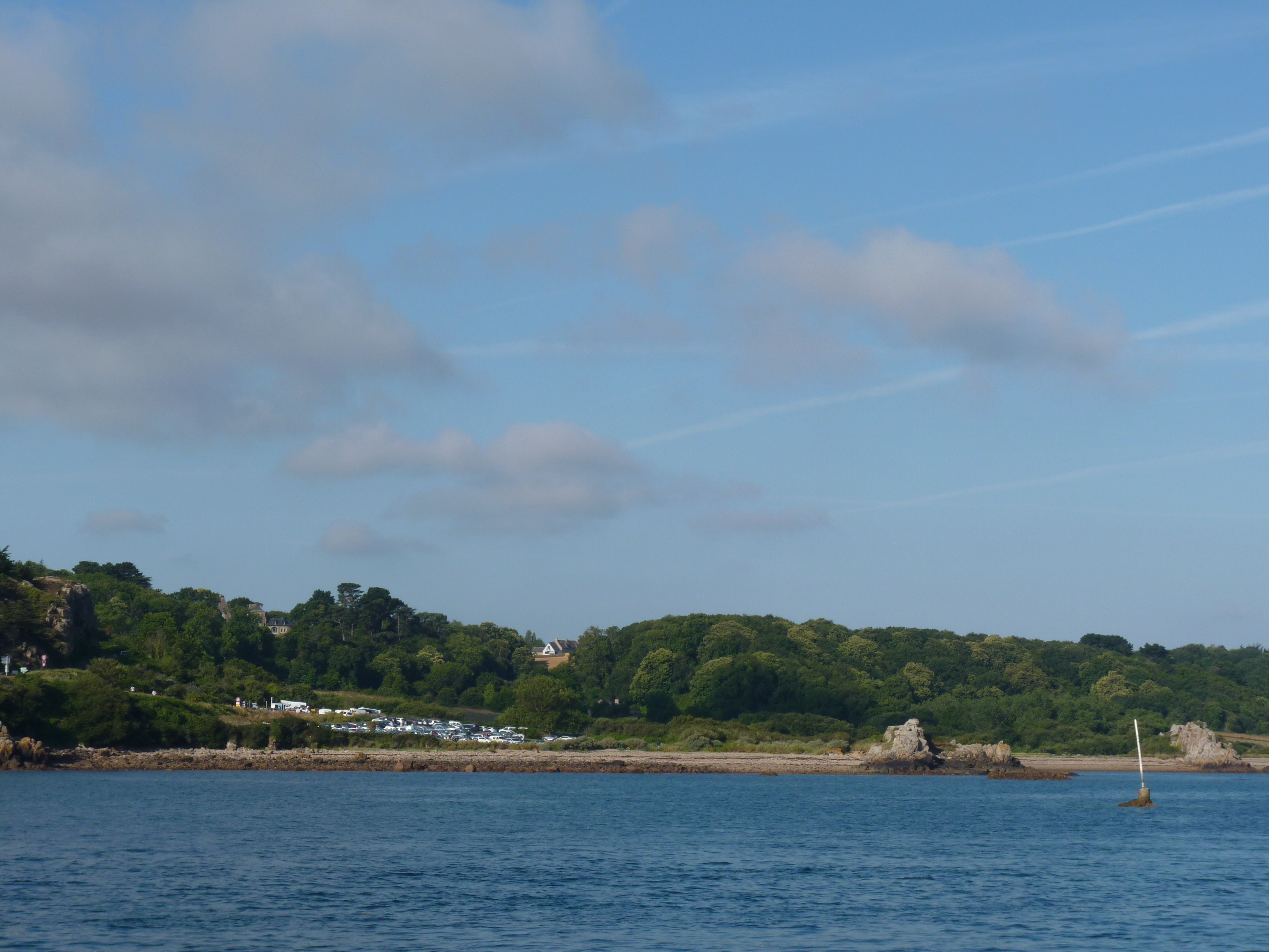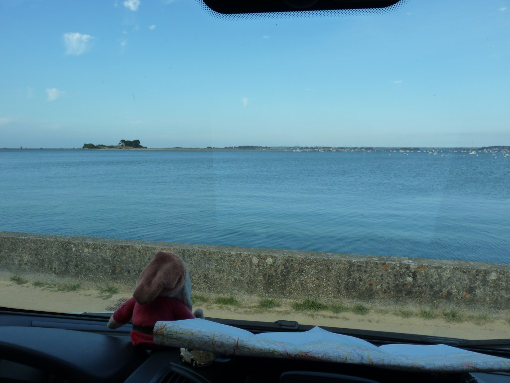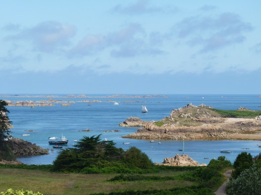 Ik kom aan op Pointe de lÁrquest. Op zich geen spannende plaats, ware het niet, dat hier de boot vertrekt naat Ile de Brehat, het bloemeneiland. En daar kijk ik naar uit. Hier krijg je niet echt het idee van zee, want de baai ligt bezaaid met rotsige eilandjes, daar om Ile de Brehat heen, maar het is hier zalig. Een plek waar je zou kunnen aarden… Ik zet mijn wagen op de camperplaats, een stukje hoger dan de immense parkeerplaats, waar iedereen parkeert om naar het eiland te gaan. Geen superfijne plek, weinig bomen, veel los grind en stof, maar het uitzicht is weergaloos. Je kunt zo naar Ile de Brehat kijken, het lijkt op een steenworp te liggen. Die avond is het eb en ik kan een heel stuk de zee in over de rotsen. Een leuke wandeling…