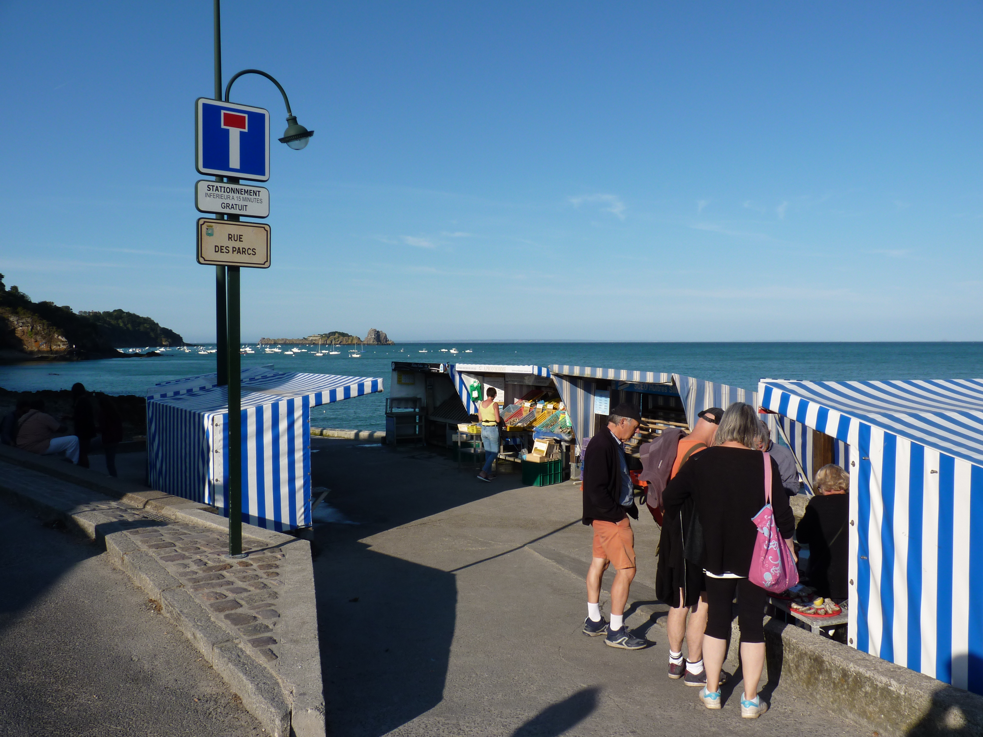 Niet veel later kom ik weer dichter bij de kust en kan ik doen wat ik het liefst doe, de kust volgen, zo dicht mogelijk. Dat levert de mooiste zichten op… Ik kom aan in Cancale. Een klein, oud havenstadje. Jammer genoeg geen camperplaats aan het water, maar niet te ver ervanaf. En morgenvroeg komt de bakker rond. Zalig. Mijn logboek bijwerken en een goede maaltijd. Na de afwas een lange avondwandeling, langs het strand, langs de haven. Doet deugd…