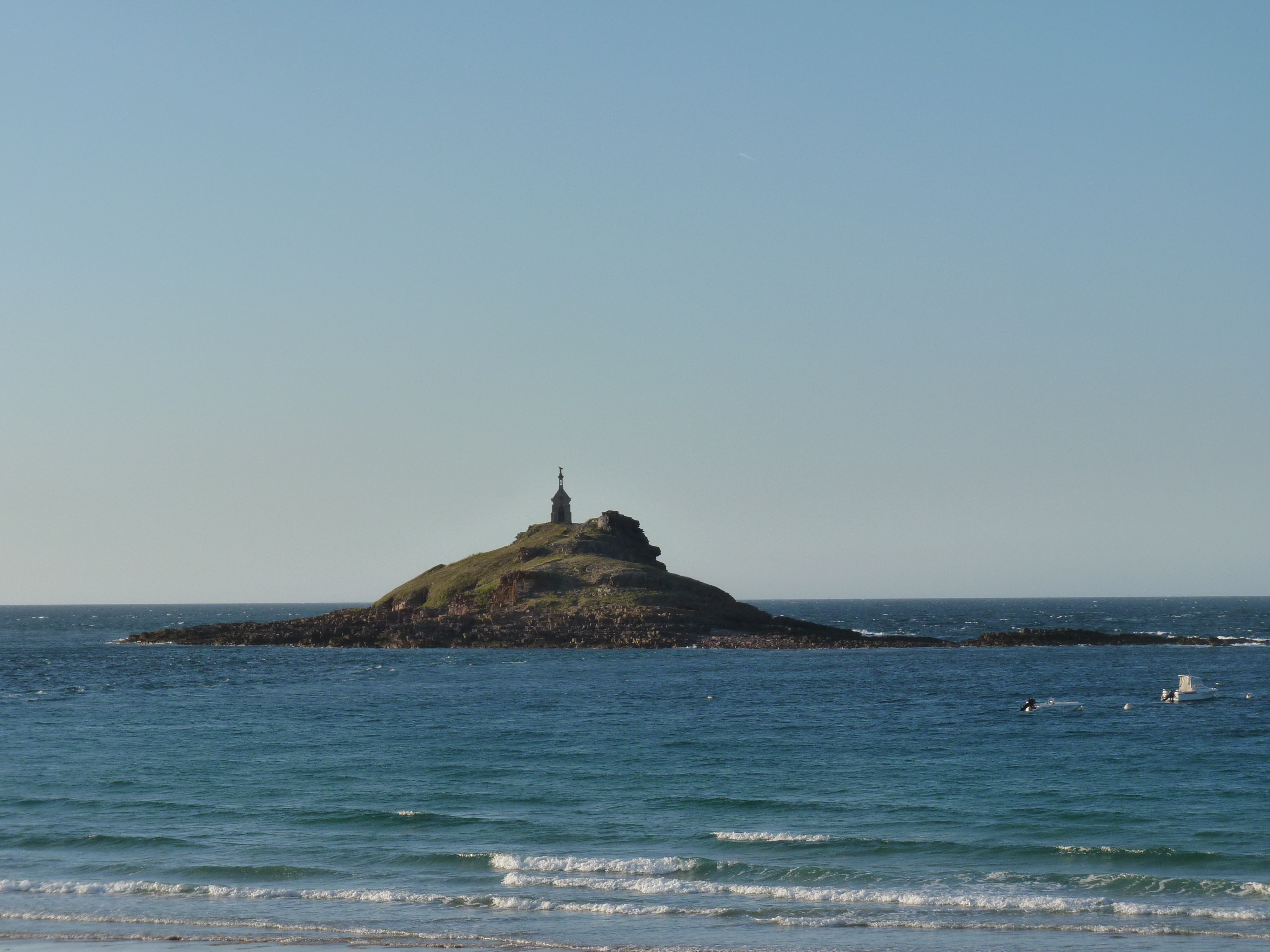 Mijn campercontact- app belooft mij een mooie slaapplek bij Cap Frehel. Het levert niet meer op dan een fijne wandeling en een aantal mooie foto’s, want de camperplaats is overvol. Zonde, als je niet echt op tijd komt, zijn de plaatsen weg. Maar zoals ik al zei, ik ben zwerver, ik ben onderweg om dingen te zien, dus ik kom wat later. Ik heb geen camper om overal een dag of twee dagen gezellig te gaan staan en te niksen. Dus verder zoeken is het devies…Een stuk verder, bij Erqui, is een mooie camping aan zee, bij het eilandje Saint Michel, waar een klein kapelletje op staat, een stuk verder voor de kust. Onbereikbaar eilandje, maar leuk om te zien. Een aangename plek, met bomen voor schaduw, een goeie douche, een mooi plekje met zeezicht en genoeg te wandelen voor de avond…