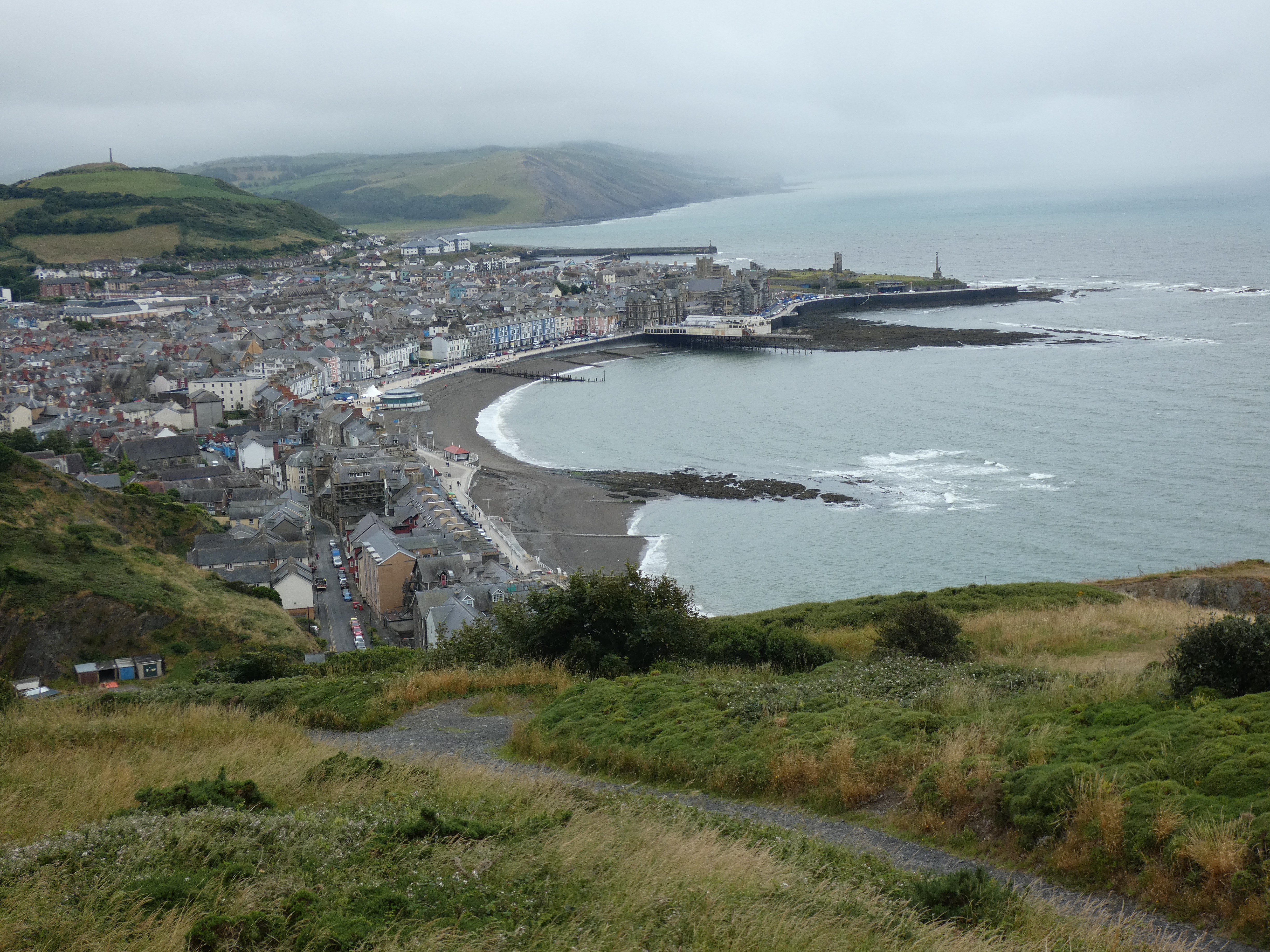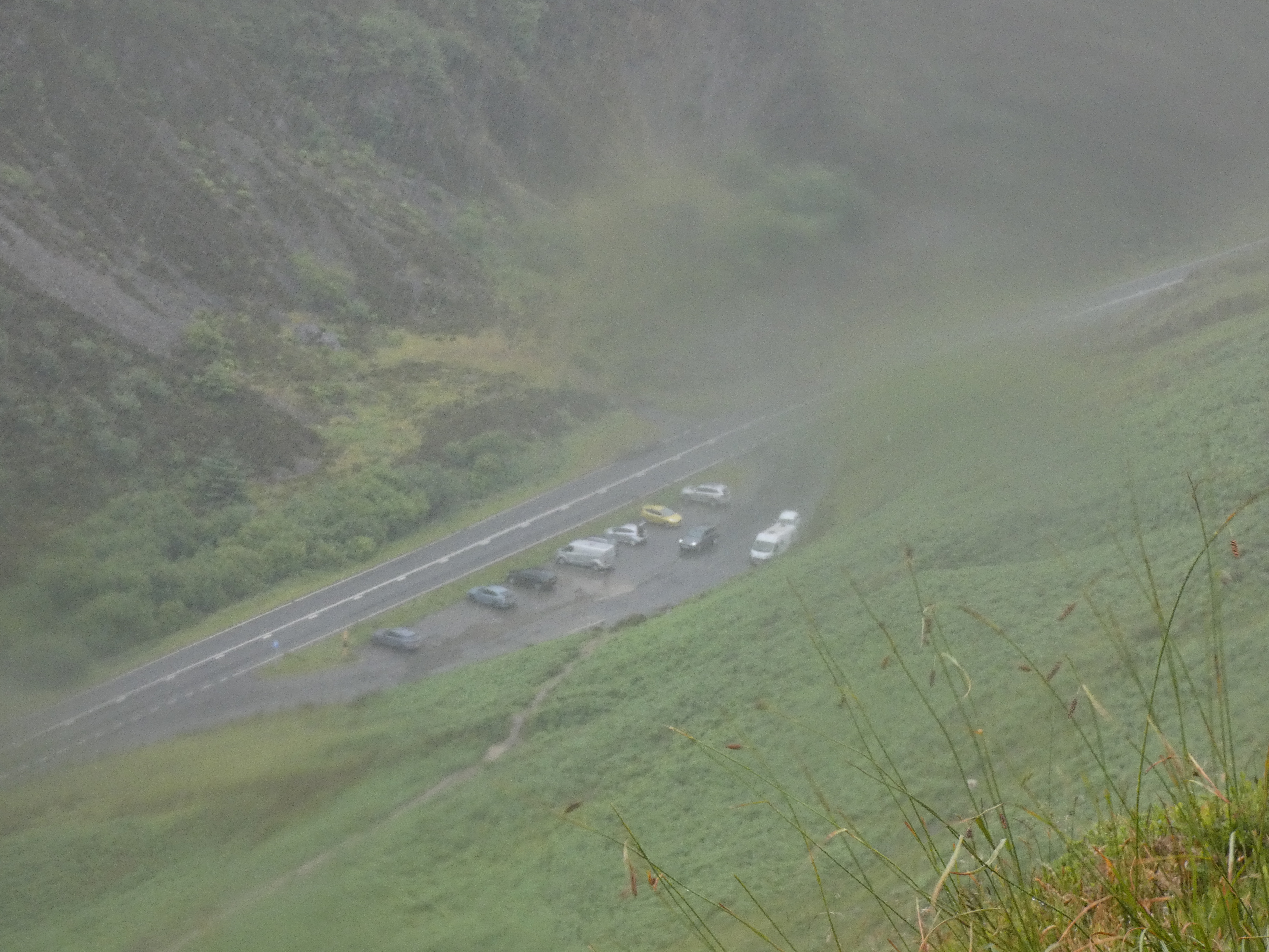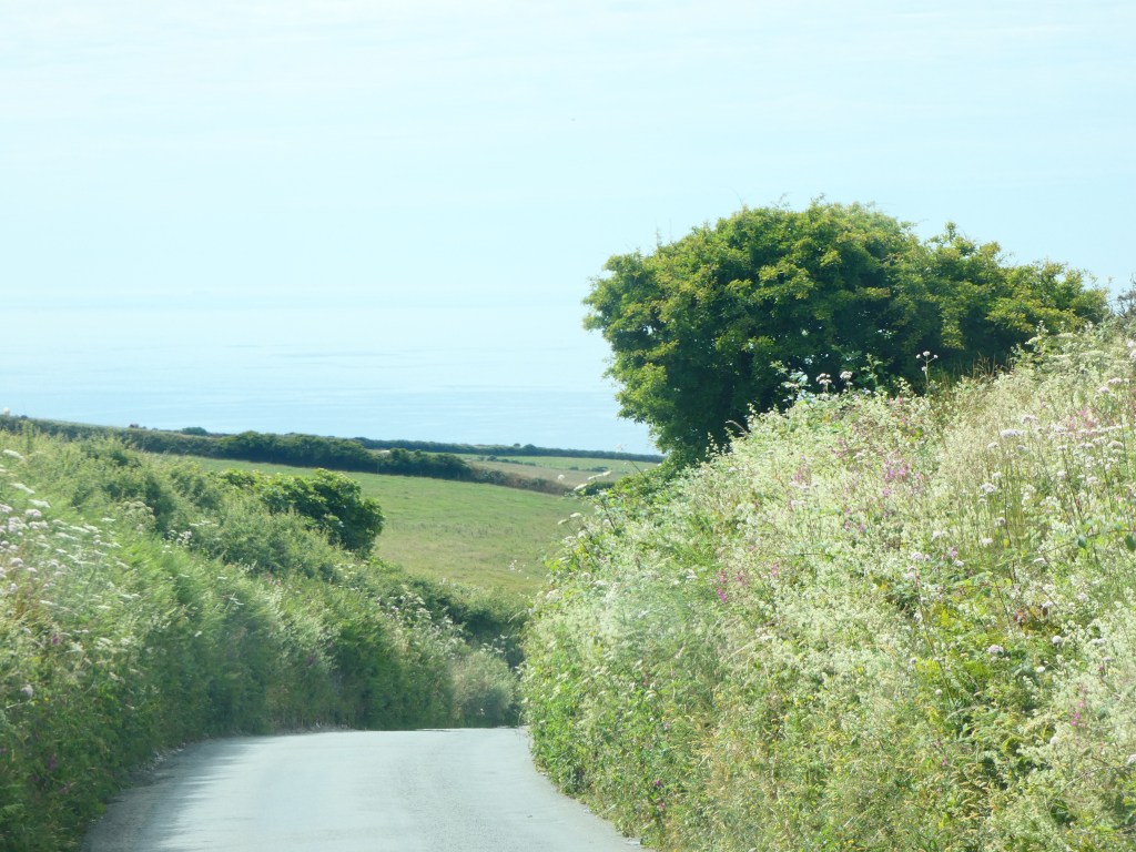 Bij Aberystwych de weg zuidwaarts langs de kust, richting de Pembrokeshire coast, immens natuurgebied, direct aan de kust. Eerste doel Tresaith. de weg brengt me hoog langs de kust, zelfs een stuk door wolken, wat niet echt leuk is. Mist is dan nog beter dan die wolken, die flarden van wel en niet zicht geven en volle concentratie vergen.