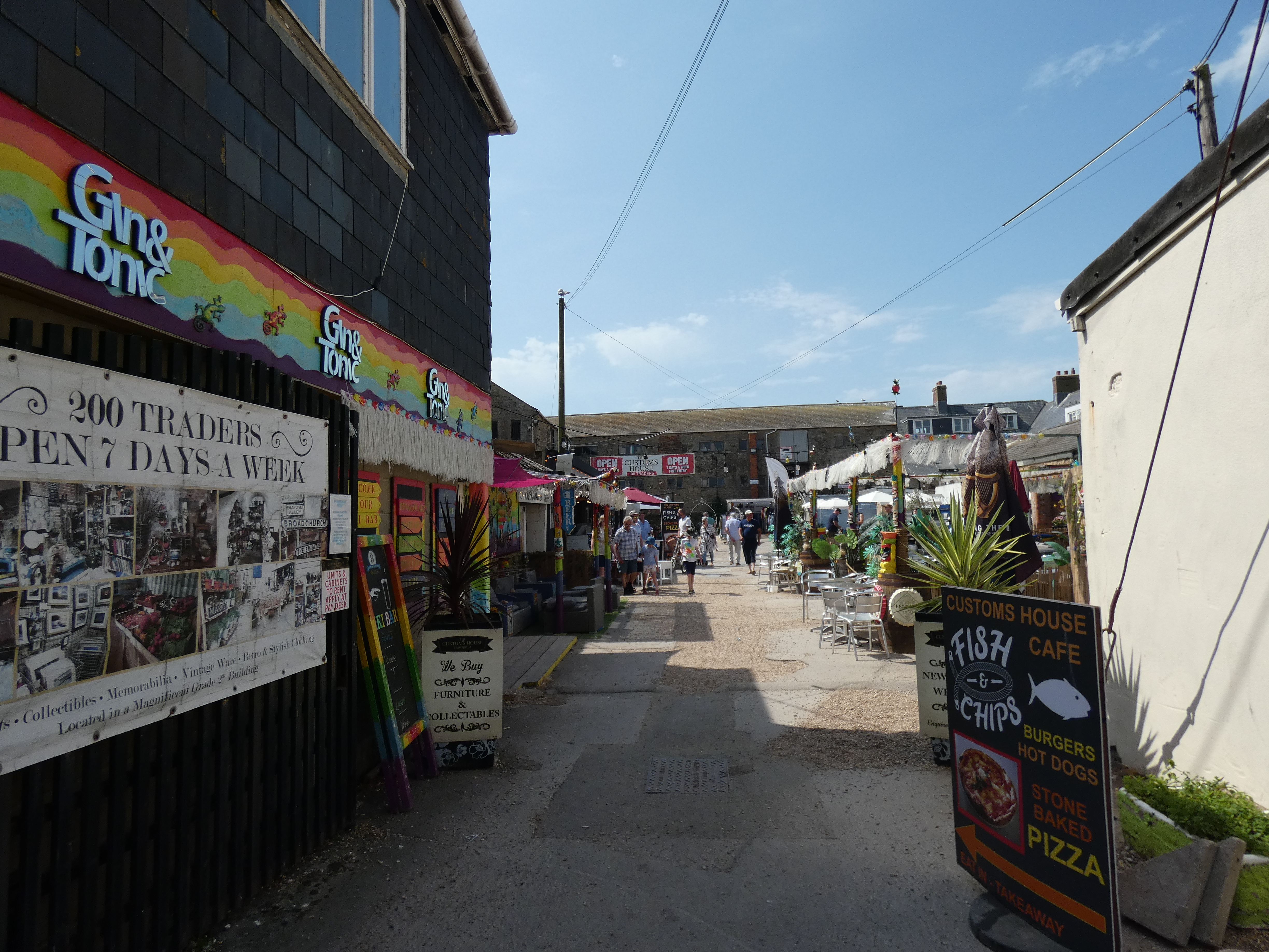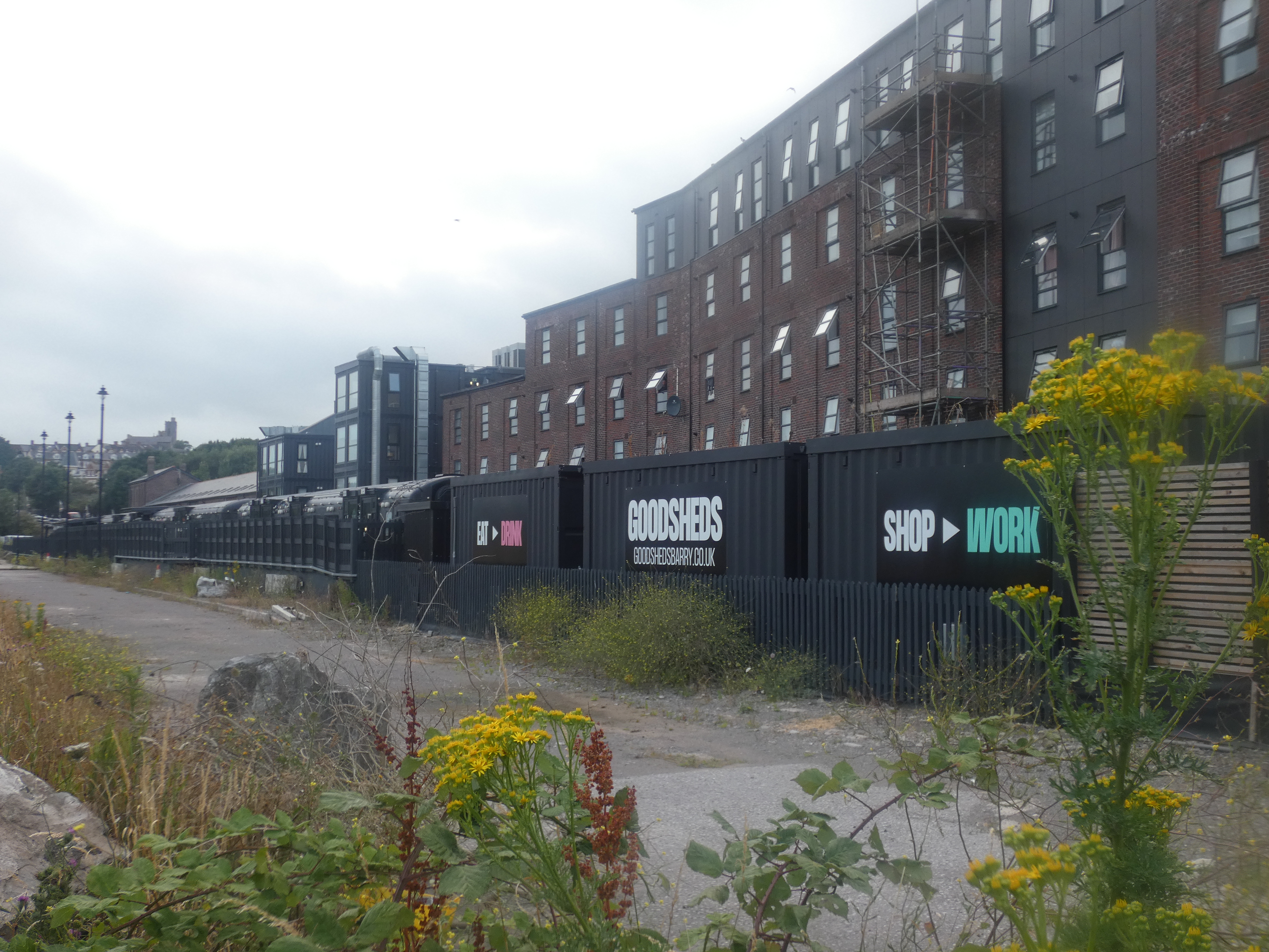 De dokken hier zijn van midden 19e eeuw en waren toen belangrijk voor de export van kolen vanuit South Wales. Destijds is er grof geld tegenaan gesmeten om alles te realiseren, nu is er totaal geen bedrijvigheid meer, behalve toerisme. Mooie plek, hier, rustig aan het water, nieuwbouwwoningen all around. Voor de rest is Barry Island een pleasure island, met pretparktoestanden, een heel strandgebeuren en een heel groot shoppinggebied. Niet ver van waar ik sta ontdek ik nog iets leuks, Goodsheds, een nieuw project/concept, waarbij containers en oude treinwagons zijn samengebracht om lokale ambachtslui, artiesten en startende bedrijfjes een mooie kans te gunnen op een veredelde industriële plek. Alles sjiek zwart geschilderd, heel mooi modern opgezet, met oude materialen, daar krijg ik kippevel van. Jammer genoeg is het die avond al dicht en in de ochtend alleen open voor lekkere koffie, maar dat is dan toch al een eerste kennismaking…