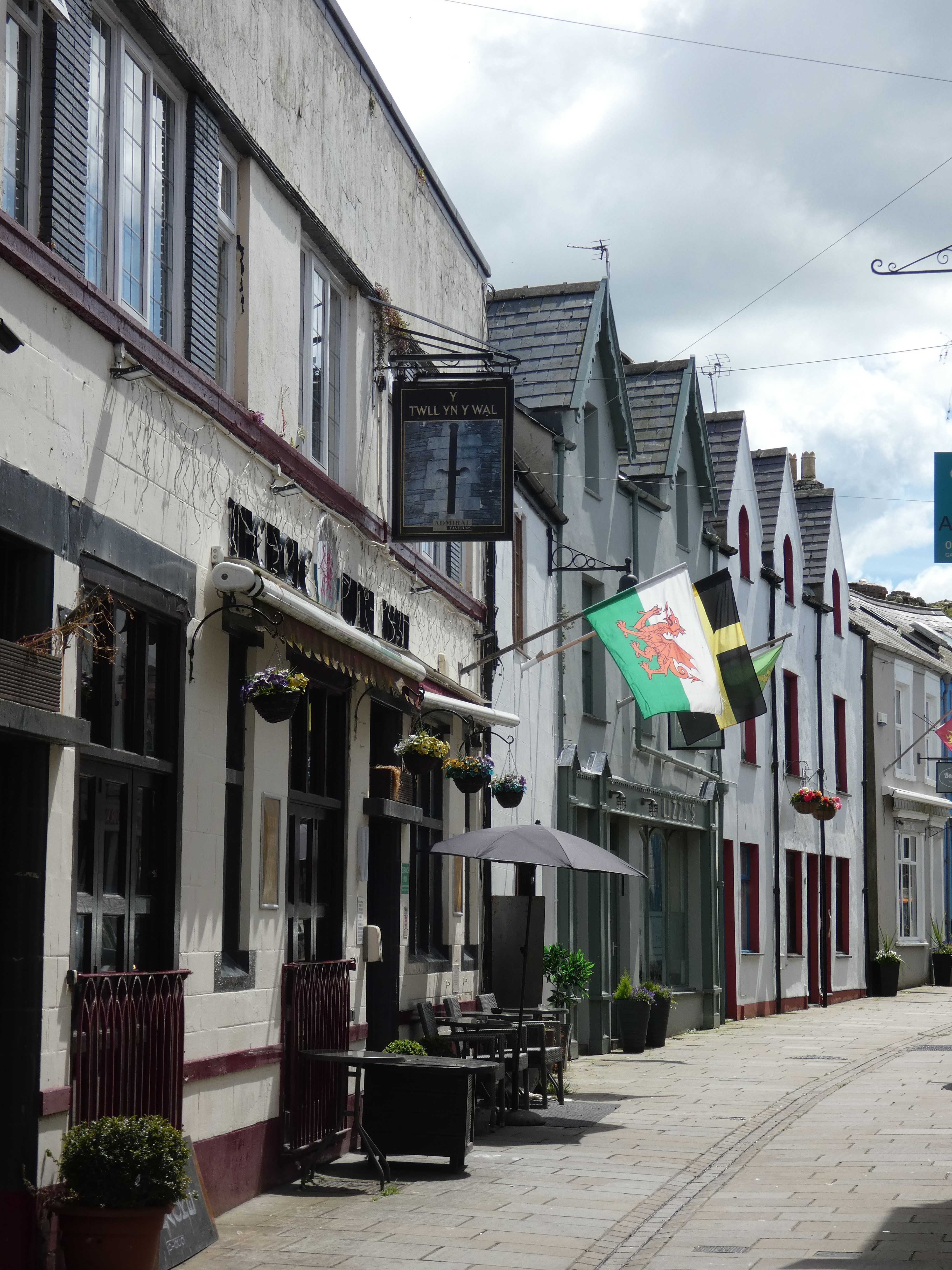 Een aantal uren later stuur ik de auto naar Tenby. Een mooi haven-/badstadje met een hoger en lager gelegen deel. Best wat werk voor de beenspieren, alleen al van de parking omhoog en omlaag. Op het strand toegang naar een schiereilandje met een kasteelruïne erop.