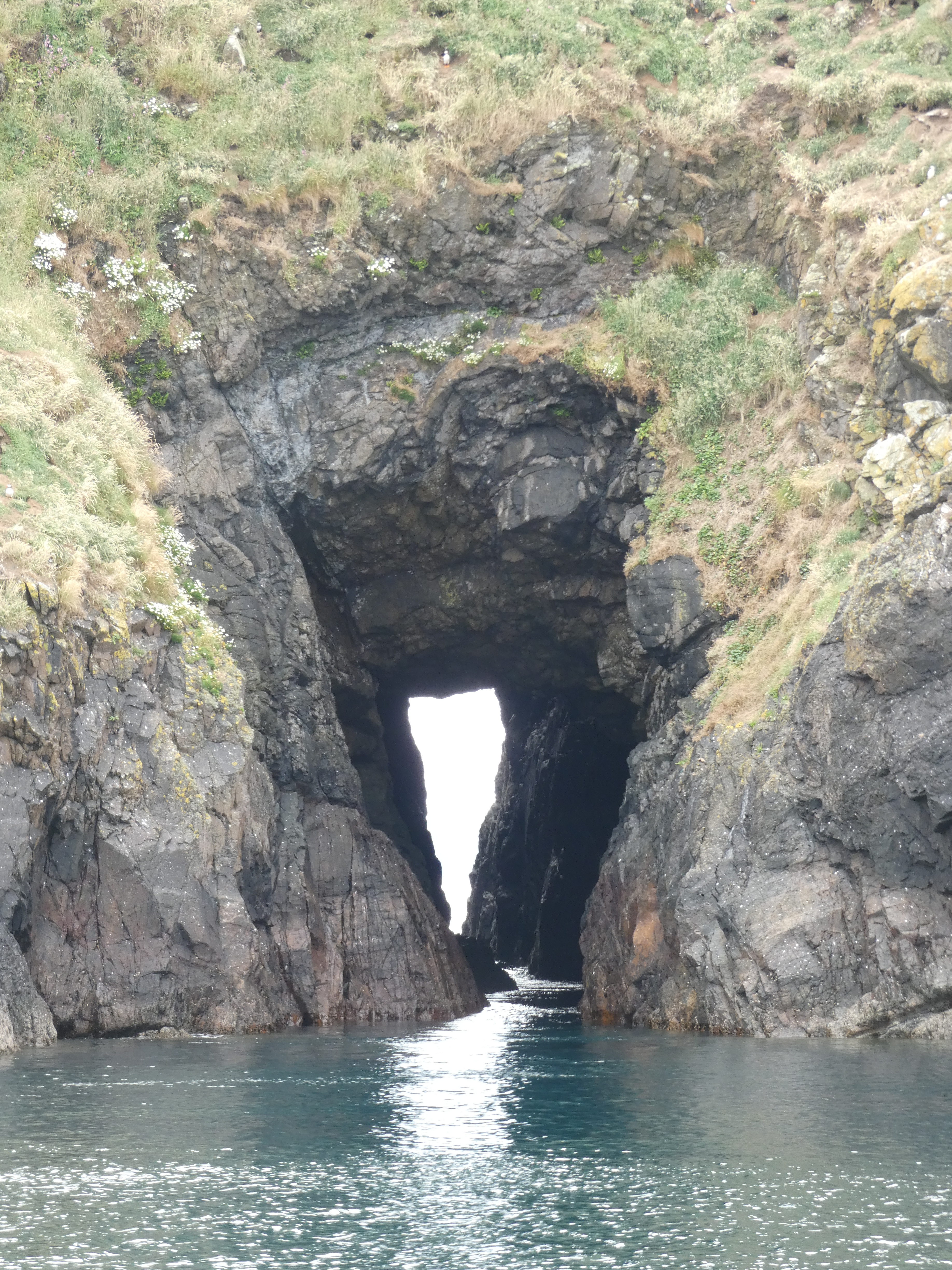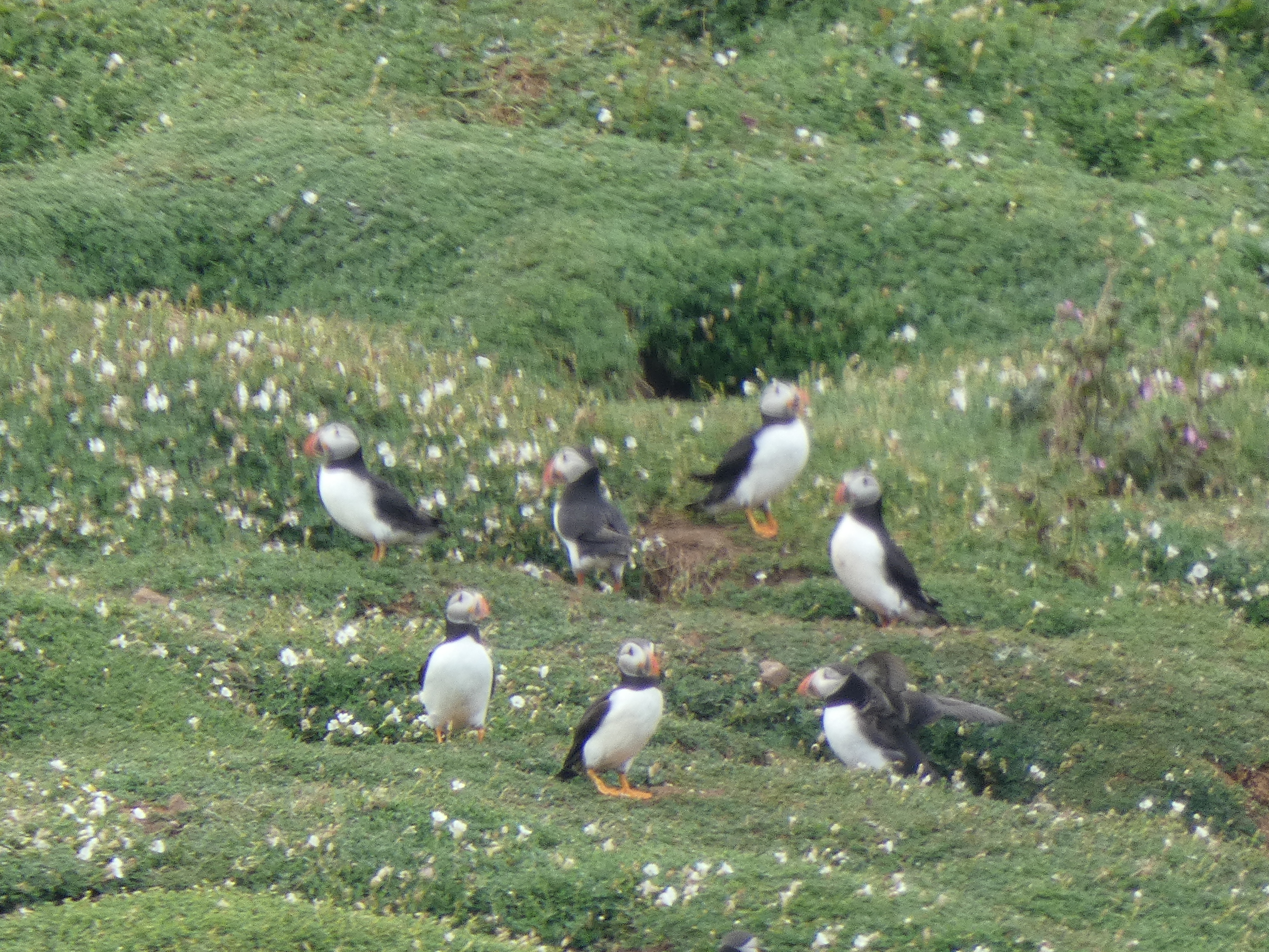 De eilanden hier zijn bevolkt door voornamelijk Puffins, papegaaiduikers. Op de twee eilanden hier een populatie van 1 miljoen vogels, je hoeft ze echt niet te zoeken…heel speciaal om te zien, die drukdoende zwart met witte vogels met hun felgekleurde snavels. Die snavels worden trouwens alleen voor sier gebruikt. Onze gids vertelt, dat ze elk jaar naar het noord-Atlantische gebied trekken, drie weken vliegen en ze verliezen dan hun opvallende snavels, waaronder een normale vogelbek overblijft. Tja, als je zolang moet vliegen, is eten niet zo belangrijk en die felgekleurde snavel, die weegt wel wat. Als ze dan weer terugkomen, groeit die felle snavel weer netjes aan. hele busy vogeltjes en keihard, met wat ze in hun leven te verduren hebben…