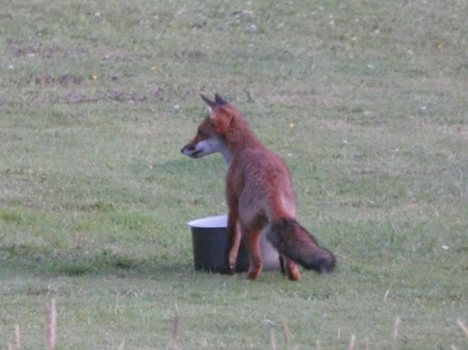 Rondom het terrein vol met de welbekende Engelse hagen waar ik zoveel van hou. David, de eigenaar wijst me een plekje in de haag en vertelt, dat elke avond rond 9 uur een vos uit de haag komt en langs de rand van het terrein naar het huis loopt om etenrestjes te verschalken. Het is schemerig, de foto’s zijn niet scherp, maar ik geniet van die brutale rakker…