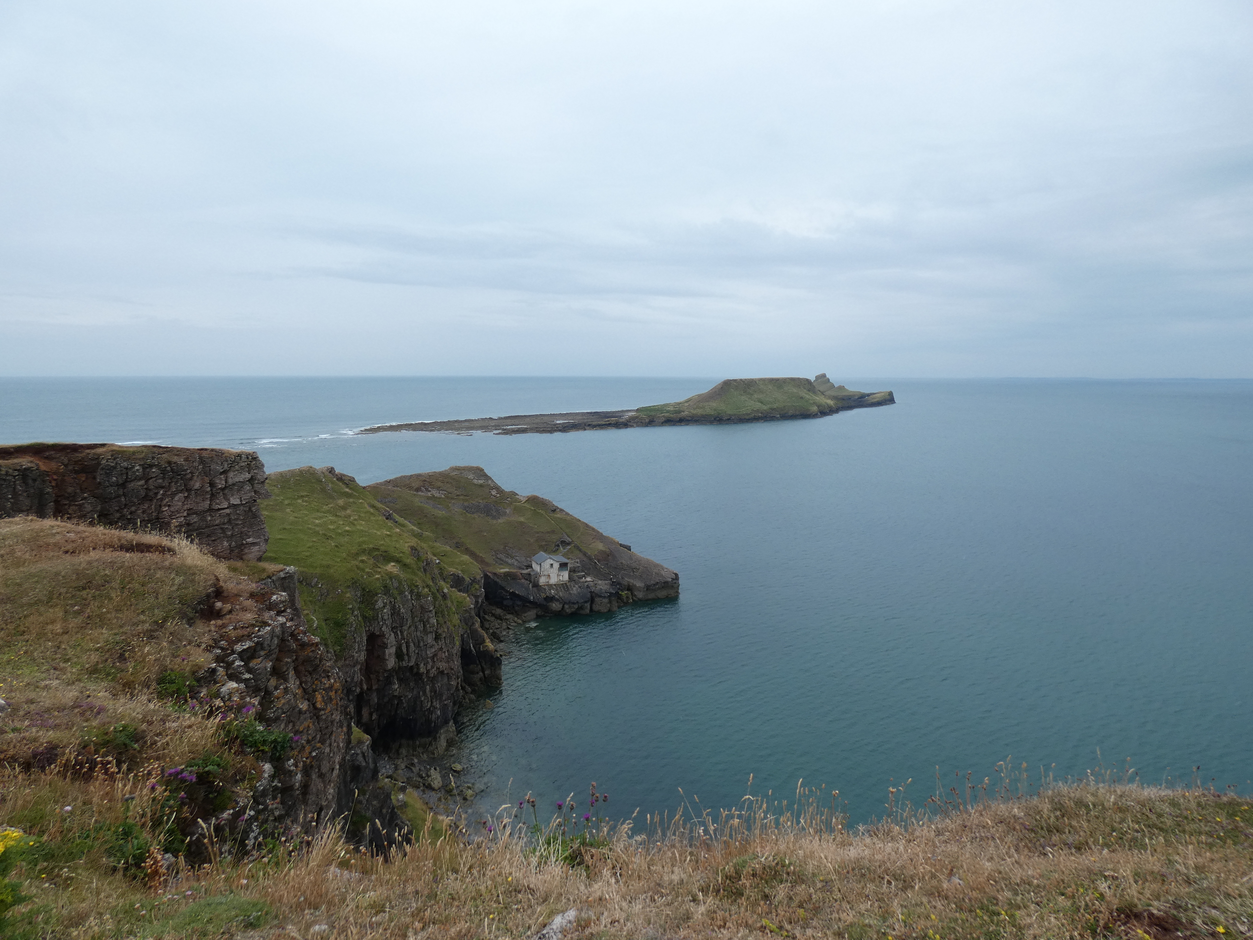 David zei dat ik me niet moest haasten met vertrekken en vanmorgen lijkt het inderdaad ook allemaal extra langzaam te gaan, zalig. Om tien uur sluit ik de poort achter me en een halfuur later sta ik in Rhossili, bij Worm’s head. Een mooie landtong, met een schiereilandje, dat alleen bij eb te bereiken is. dat is vanavond dus pas, jammer.