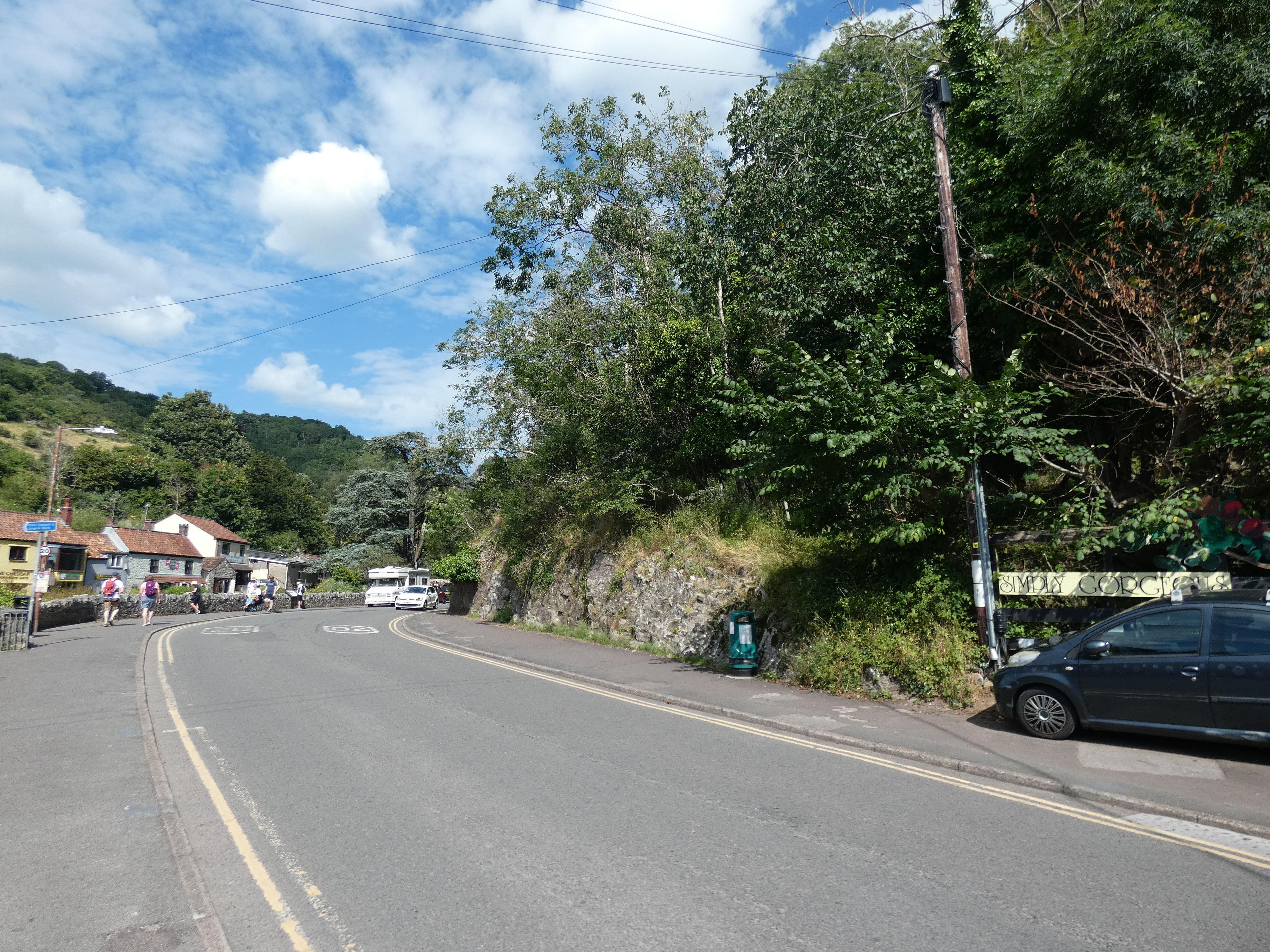 Cheddar, klein plaatsje, erg toeristisch, heel beroemd om zijn kaas, is gelegen in de bodem van een ravijn, Cheddar Gorge, waar je vanzelf doorheen rijdt, als je naar het plaatsje gaat. Ontzettend mooie, indrukwekkende weg, zo afdalend tussen massieve rotswanden, die steeds hoger boven je uittorenen. je daalt letterlijk een ravijn in. zalig. De action camera biedt mooie filmopnames…