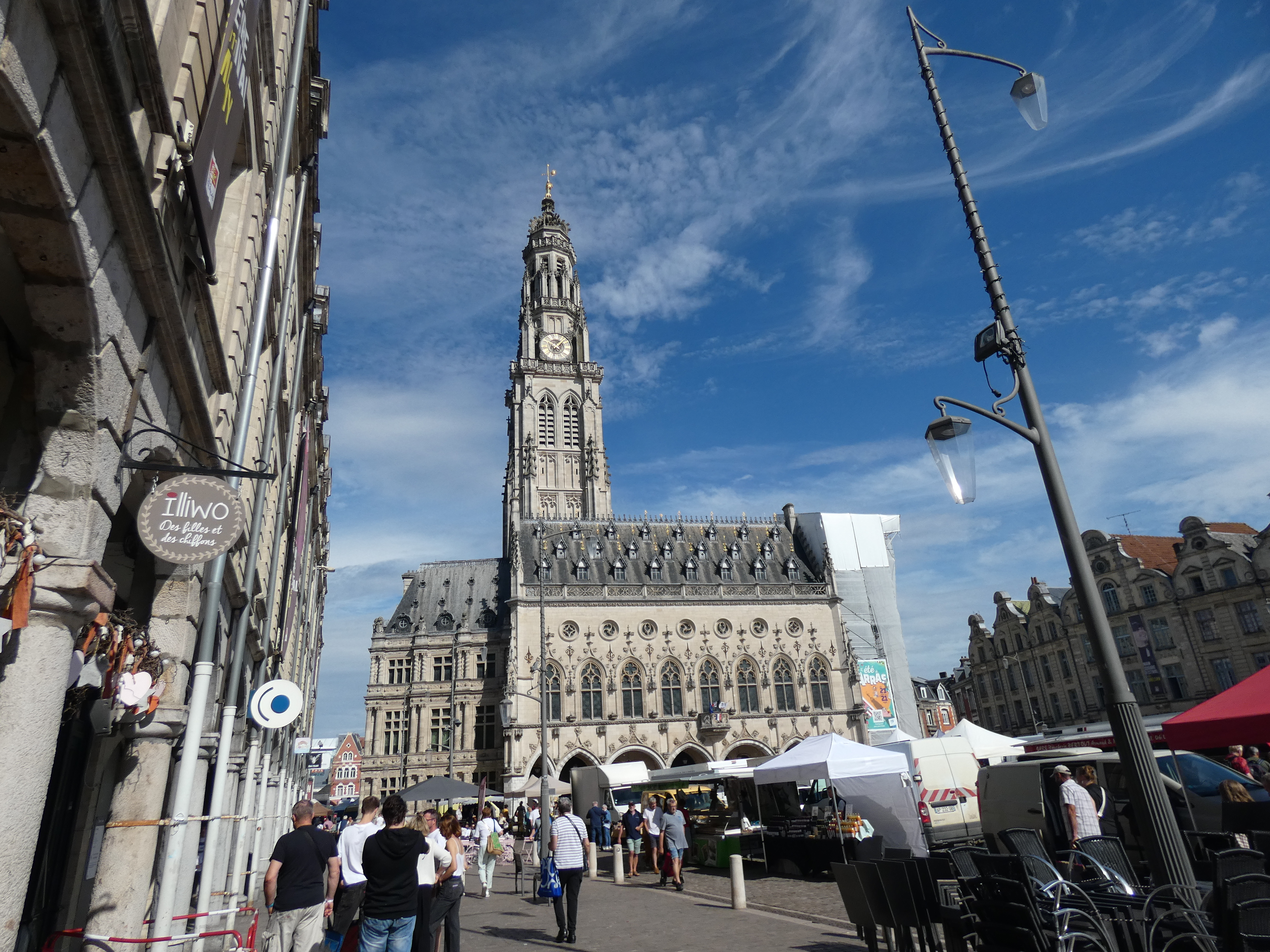 De zaterdag begint al met mooi weer, warm, zonnig, beetje bewolking hier en daar, heerlijk. Ik zet me achter het stuur voor een niet al te lang stuk, eerste stop bij Arras. ofwel Atrecht. Een prachtig middeleeuws stadje, vroeger van veel belang, met een grote markt van precies een hectare groot, met nog meer pleinen, zoals het Heldenplein, met het Belfort. Dat is gratis te bezichtigen, met prachtige vergezichten, zeker met het weer van vandaag.