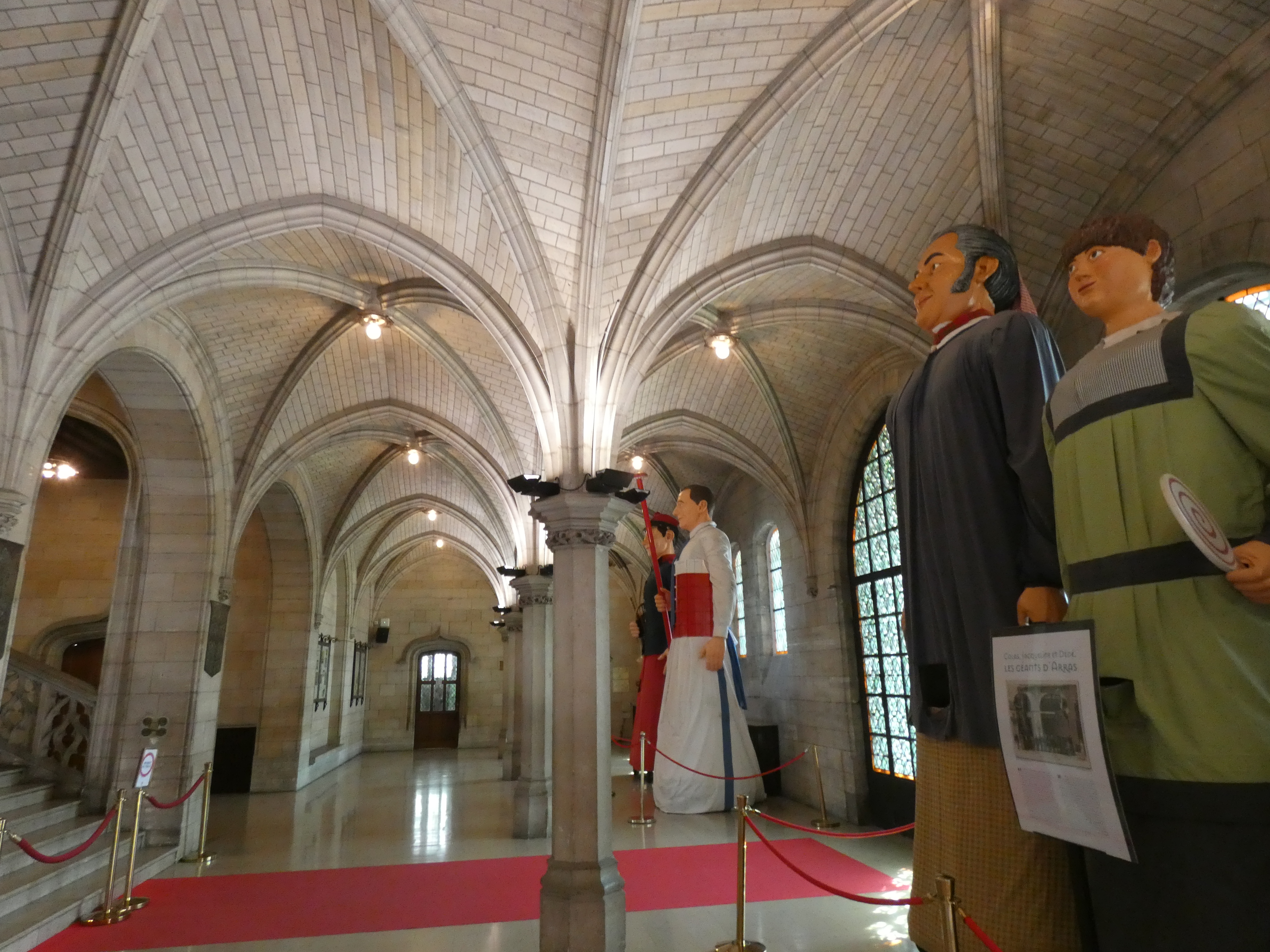 In de inkomhal van het belfort, staan de beroemde reuzen van Arras, mooi om te zien. En als je een weinig betaalt, kun je begeleid afdalen in les boves, het ondergrondse gedeelte, niet zomaar kelders, maar een heel ondergronds gangenstelsel, dat zich uitstrekt onder het gebouw en de pleinen eromheen. In vroeger dagen gebruikt als voedselopslagplaatsen, voorraadkelders voor de markten, schuilplaatsen, gevangenis en wat dies meer zij. Ontzettend interessant en indrukwekkend om er rond te dwalen en de verhalen te horen.