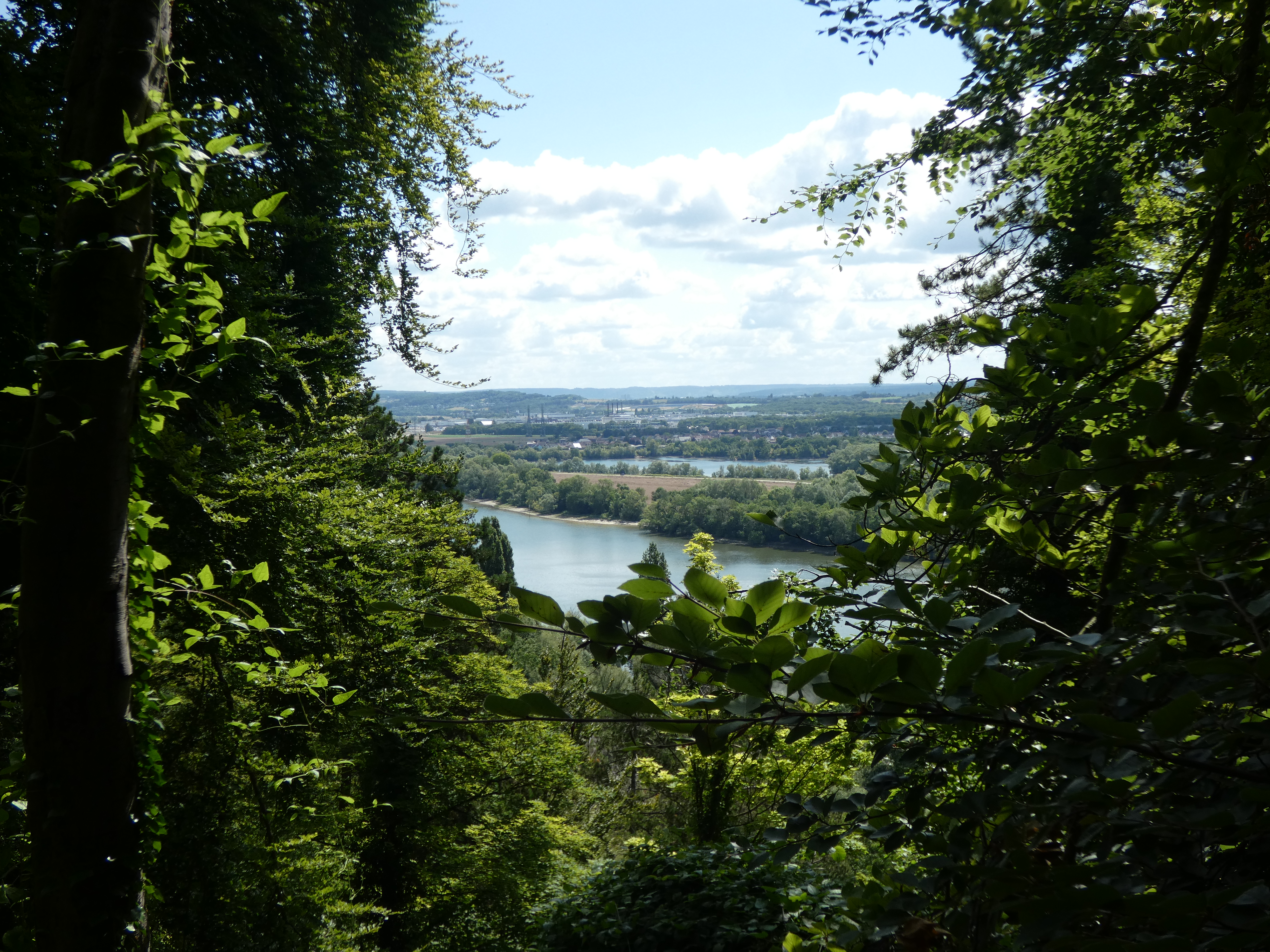 En dan weer op pad. Verder langs die mooie rivier…Zoveel te zien, onnodig en onmogelijk om alles te vertellen, details, details, details… Even na Val-St.Martin kom ik bij panorama de Tuit. Het is een pittige wandeling heuvelopwaarts naar een beeld van een notre dame, die waakt over een briljant uitzicht over de Seine. Hoger en hoger wandel je, telkens denkend dat je nu de hoogste boomgrens wel zo’n beetje bereikt hebt. Tot je op gegeven moment ineens uit de bomen komt en het beeld ziet staan. Druk is het niet, als je alleen bent. Het is geen toeristische plek, maar een mooike.
